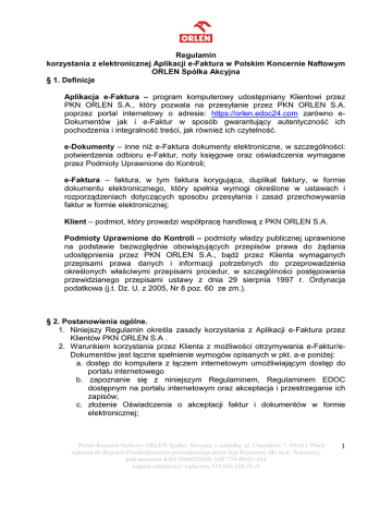 Regulamin korzystania z elektronicznej Aplikacji e-Faktura w Polskim Koncernie Naftowym ORLEN Spółka Akcyjna § 1. Definicje Aplikacja e-Faktura – program komputerowy udostępniany Klientowi przez PKN ORLEN S.A., który pozwala na przesyłanie przez PKN ORLEN S.A. poprzez portal internetowy o adresie: https://orlen.edoc24.com zarówno eDokumentów jak i e-Faktur w sposób gwarantujący autentyczność ich pochodzenia i integralność treści, jak równieŜ ich czytelność. e-Dokumenty – inne niŜ e-Faktura dokumenty elektroniczne, w szczególności: potwierdzenia odbioru e-Faktur, noty księgowe oraz oświadczenia wymagane przez Podmioty Uprawnione do Kontroli; e-Faktura – faktura, w tym faktura korygująca, duplikat faktury, w formie dokumentu elektronicznego, który spełnia wymogi określone w ustawach i rozporządzeniach dotyczących sposobu przesyłania i zasad przechowywania faktur w formie elektronicznej; Klient – podmiot, który prowadzi współpracę handlową z PKN ORLEN S.A. Podmioty Uprawnione do Kontroli – podmioty władzy publicznej uprawnione na podstawie bezwzględnie obowiązujących przepisów prawa do Ŝądania udostępnienia przez PKN ORLEN S.A., bądź przez Klienta wymaganych przepisami prawa danych i informacji potrzebnych do przeprowadzenia określonych właściwymi przepisami procedur, w szczególności postępowania przewidzianego przepisami ustawy z dnia 29 sierpnia 1997 r. Ordynacja podatkowa (j.t. Dz. U. z 2005, Nr 8 poz. 60 ze zm.). § 2. Postanowienia ogólne. 1. Niniejszy Regulamin określa zasady korzystania z Aplikacji e-Faktura przez Klientów PKN ORLEN S.A . 2. Warunkiem korzystania przez Klienta z moŜliwości otrzymywania e-Faktur/eDokumentów jest łączne spełnienie wymogów opisanych w pkt. a-e poniŜej: a. dostęp do komputera z łączem internetowym umoŜliwiającym dostęp do portalu internetowego b. zapoznanie się z niniejszym Regulaminem, Regulaminem EDOC dostępnym na portalu internetowym oraz akceptacja i przestrzeganie ich zapisów; c. złoŜenie Oświadczenia o akceptacji faktur i dokumentów w formie elektronicznej; Polski Koncern Naftowy ORLEN Spółka Akcyjna, z siedzibą: ul. Chemików 7, 09-411 Płock wpisana do Rejestru Przedsiębiorców prowadzonego przez Sąd Rejonowy dla m.st. Warszawy pod numerem KRS 0000028860, NIP 774-00-01-454 kapitał zakładowy/ wpłacony 534.636.326,25 zł 1 d. podanie we wskazanym wyŜej oświadczeniu adresu e-mail, na który mają być przesyłane powiadomienia o wystawieniu i udostępnieniu eFaktury/e-Dokumentu; e. zainstalowanie następujących programów: • Adobe Acrobat Reader – bezpłatnego programu słuŜącego do podglądu dokumentu dostępnego do pobrania na portalu internetowym; • bezpłatnej aplikacji słuŜącej do weryfikacji autentyczności podpisanej eFaktury (aplikacja dostępna do pobrania na portalu internetowym). 3. Dostęp do Aplikacji e-Faktura jest moŜliwy po zalogowaniu Klienta na portalu internetowym z wykorzystaniem wcześniej przyznanego loginu i hasła, przesłanego na wskazany przez Klienta adres mailowy w Oświadczeniu o akceptacji faktur i dokumentów w formie elektronicznej. 4. Oświadczenie o akceptacji faktur i dokumentów w formie elektronicznej Klient składa w formie pisemnej. Podpisane oświadczenie Klient wysyła na adres: PKN ORLEN S.A. ul. Chemików 7, 09-411 Płock HAA/DZF. § 3. Warunki wystawiania faktur i dokumentów elektronicznych. 1. E-Faktury/e-Dokumenty są wystawiane przez PKN ORLEN S.A., opatrywane bezpiecznym podpisem i udostępniane (równieŜ z funkcją pobierania) Klientowi poprzez portal internetowy. 2. Powiadomienie o wystawieniu i udostępnieniu e-Faktury/e-Dokumentu jest przesyłane na adres e-mail podany przez Klienta w Oświadczeniu o akceptacji faktur i dokumentów w formie elektronicznej. Wystawiona e-Faktura/eDokument jest udostępniana Klientowi do pobrania na portalu internetowym. 3. Wszelkie terminy płatności wynikają z umów handlowych zawartych pomiędzy PKN ORLEN S.A. i Klientem. W sytuacji, gdy termin płatności naleŜności wynikającej z transakcji potwierdzonej e-Fakturą uzaleŜniony jest od daty wystawienia faktury, wówczas za datę jej wystawienia naleŜy przyjąć datę umieszczoną w prawym górnym rogu pliku PDF (Płock, dnia xxxxx), która jest datą wystawienia e-Faktury w rozumieniu niniejszego Regulaminu. 4. Doręczenie e-Faktury/e-Dokumentu Klientowi następuje z chwilą, gdy wiadomość zawierająca powiadomienie o wystawieniu i moŜliwości ich pobrania z portalu internetowego zostanie wysłana do Klienta. 5. ZłoŜenie przez Klienta Oświadczenia o akceptacji faktur i dokumentów w formie elektronicznej nie pozbawia PKN ORLEN S.A. prawa do wystawiania i przesyłania faktur oraz innych dokumentów w formie papierowej w szczególności w sytuacji, gdy nie jest moŜliwe wystawienie i zamieszczenie eFaktury/e-Dokumentu na portalu internetowym z powodów technicznych. 6. PKN ORLEN S.A. rozpoczyna wystawianie e-Faktur/e-Dokumentów nie wcześniej niŜ w następnym dniu po złoŜeniu przez Klienta Oświadczenia o akceptacji faktur i dokumentów w formie elektronicznej. Polski Koncern Naftowy ORLEN Spółka Akcyjna, z siedzibą: ul. Chemików 7, 09-411 Płock wpisana do Rejestru Przedsiębiorców prowadzonego przez Sąd Rejonowy dla m.st. Warszawy pod numerem KRS 0000028860, NIP 774-00-01-454 kapitał zakładowy/ wpłacony 534.636.326,25 zł 2 § 4. Zmiana adresu e-mail i rezygnacja 1. Zmiana adresu e-mail, na który są przesyłane powiadomienia o wystawieniu i udostępnieniu e-Faktury/e-Dokumentu moŜe być dokonana w sposób wskazany w § 2 ust. 4 niniejszego Regulaminu. 2. W przypadku niepowiadomienia PKN ORLEN S.A. o zmianie adresu e-mail, eFakturę/e-Dokument uwaŜa się za skutecznie doręczony na dotychczasowy adres podany przez Klienta w Oświadczeniu o akceptacji faktur i dokumentów w formie elektronicznej. 3. Klient moŜe zrezygnować z moŜliwości otrzymywania e-Faktur/e-Dokumentów pop