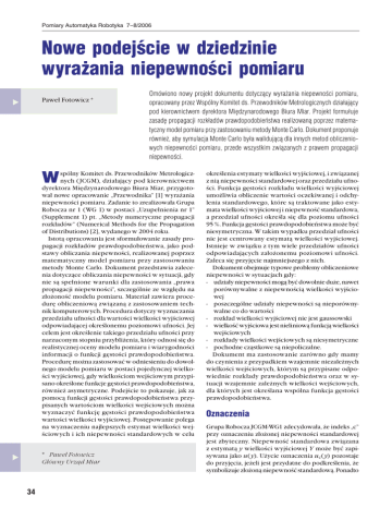 Pomiary Automatyka Robotyka 7-8/2006 Nowe podejście w dziedzinie wyrażania niepewności pomiaru Paweł Fotowicz * Omówiono nowy projekt dokumentu dotyczący wyrażania niepewności pomiaru, opracowany przez Wspólny Komitet ds. Przewodników Metrologicznych działający pod kierownictwem dyrektora Międzynarodowego Biura Miar. Projekt formułuje zasadę propagacji rozkładów prawdopodobieństwa realizowaną poprzez matematyczny model pomiaru przy zastosowaniu metody Monte Carlo. Dokument proponuje również, aby symulacja Monte Carlo była walidującą dla innych metod obliczeniowych niepewności pomiaru, przede wszystkim związanych z prawem propagacji niepewności. spólny Komitet ds. Przewodników Metrologicznych (JCGM), działający pod kierownictwem dyrektora Międzynarodowego Biura Miar, przygotował nowe opracowanie „Przewodnika” [1] wyrażania niepewności pomiaru. Zadanie to zrealizowała Grupa Robocza nr 1 (WG 1) w postaci „Uzupełnienia nr 1” (Supplement 1) pt. „Metody numeryczne propagacji rozkładów” (Numerical Methods for the Propagation of Distributions) [2], wydanego w 2004 roku. Istotą opracowania jest sformułowanie zasady propagacji rozkładów prawdopodobieństwa, jako podstawy obliczania niepewności, realizowanej poprzez matematyczny model pomiaru przy zastosowaniu metody Monte Carlo. Dokument przedstawia zalecenia dotyczące obliczania niepewności w sytuacji, gdy nie są spełnione warunki dla zastosowania „prawa propagacji niepewności”, szczególnie ze względu na złożoność modelu pomiaru. Materiał zawiera procedurę obliczeniową związaną z zastosowaniem technik komputerowych. Procedura dotyczy wyznaczania przedziału ufności dla wartości wielkości wyjściowej odpowiadającej określonemu poziomowi ufności. Jej celem jest określenie takiego przedziału ufności przy narzuconym stopniu przybliżenia, który odnosi się do realistycznej oceny modelu pomiaru i wiarygodności informacji o funkcji gęstości prawdopodobieństwa. Procedurę można zastosować w odniesieniu do dowolnego modelu pomiaru w postaci pojedynczej wielkości wyjściowej, gdy wielkościom wejściowym przypisano określone funkcje gęstości prawdopodobieństwa, również asymetryczne. Podejście to pokazuje, jak za pomocą funkcji gęstości prawdopodobieństwa przypisanych wartościom wielkości wejściowych można wyznaczyć funkcję gęstości prawdopodobieństwa wartości wielkości wyjściowej. Postępowanie polega na wyznaczeniu najlepszych estymat wielkości wejściowych i ich niepewności standardowych w celu * Paweł Fotowicz Główny Urząd Miar 34 określenia estymaty wielkości wyjściowej, i związanej z nią niepewności standardowej oraz przedziału ufności. Funkcja gęstości rozkładu wielkości wyjściowej umożliwia obliczenie wartości oczekiwanej i odchylenia standardowego, które są traktowane jako estymata wielkości wyjściowej i niepewność standardowa, a przedział ufności określa się dla poziomu ufności 95 %. Funkcja gęstości prawdopodobieństwa może być niesymetryczna. W takim wypadku przedział ufności nie jest centrowany estymatą wielkości wyjściowej. Istnieje w związku z tym wiele przedziałów ufności odpowiadających założonemu poziomowi ufności. Zaleca się przyjęcie najmniejszego z nich. Dokument obejmuje typowe problemy obliczeniowe niepewności w sytuacjach gdy: - udziały niepewności mogą być dowolnie duże, nawet porównywalne z niepewnością wielkości wyjściowej - poszczególne udziały niepewności są nieporównywalne co do wartości - rozkład wielkości wyjściowej nie jest gaussowski - wielkość wyjściowa jest nieliniową funkcją wielkości wejściowych - rozkłady wielkości wejściowych są niesymetryczne - pochodne cząstkowe są niepoliczalne. Dokument ma zastosowanie zarówno gdy mamy do czynienia z przypadkiem wzajemnie niezależnych wielkości wejściowych, którym są przypisane odpowiednie rozkłady prawdopodobieństwa oraz w sytuacji wzajemnie zależnych wielkości wejściowych, dla których jest określana wspólna funkcja gęstości prawdopodobieństwa. Oznaczenia Grupa Robocza JCGM-WG1 zdecydowała, że indeks „c” przy oznaczeniu złożonej niepewności standardowej jest zbyteczny. Niepewność standardowa związana z estymatą y wielkości wyjściowej Y może być zapisywana jako u(y). Użycie oznaczenia uc(y) pozostaje do przyjęcia, jeżeli jest przydatne do podkreślenia, że symbolizuje złożoną niepewność standardową. Ponadto Pomiary Automatyka Robotyka 7-8/2006 przymiotnik „złożona” w nazwie „złożona niepewność standardowa” uważa się za zbyteczny i może być pominięty. Jedną z przyczyn tej decyzji jest to, że y wskazuje estymatę wielkości wyjściowej, z którą jest związana niepewność standardowa. Inną przyczyną jest to, że często wyniki obliczeń jednych niepewności stają się punktem wyjścia do obliczenia następnych. Dokument odstępuje od powszechnie stosowanych symboli używanych do oznaczania funkcji gęstości prawdopodobieństwa i dystrybuanty. W „Przewodniku” [1] jest używane ogólne oznaczenie f odnoszące się zarówno do modelu matematycznego wielkości mierzonej, jak i funkcji gęstości prawdopodobieństwa. W dokumencie w miejsce symboli f i F oznaczających funkcje gęstości prawdopodobieństwa i dystrybuantę wprowadza się oznaczenia g i G, a symbol f rezerwuje się tylko do oznaczania funkcji modelu pomiaru. Funkcja gęstości prawdopodobieństwa dla możliwych wartości xi i-tej wielkości wejściowej Xi jest oznaczana symbolem gi (xi), a dla możliwych wartości wielkości wyjściowej Y oznaczana symbolem g(h). Dystrybuanta wielkości wejściowej jest oznaczana Gi (xi), a wielkości wyjściowej: G(h). Pomiędzy tymi funkcjami są następujące zależności: gi ( xi ) = Gi′ ( xi ) (1) g ( h) = G ′ ( h) (2) Gdy wielkości wejściowe są wzajemnie zależne, w miejsce osobnych funkcji gęstości praw