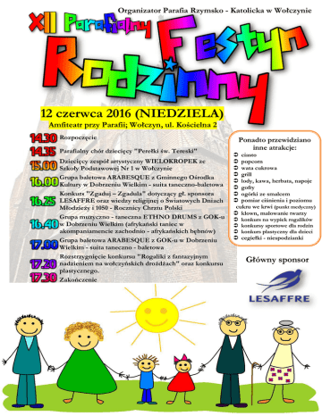 Organizator Parafia Rzymsko - Katolicka w Wołczynie 12 czerwca 2016 (NIEDZIELA) Amfiteatr przy Parafii; Wołczyn, ul. Kościelna 2 Rozpoczęcie Parafialny chór dziecięcy "Perełki św. Tereski" Dziecięcy zespół artystyczny WIELOKROPEK ze Szkoły Podstawowej Nr 1 w Wołczynie Grupa baletowa ARABESQUE z Gminnego Ośrodka Kultury w Dobrzeniu Wielkim - suita taneczno-baletowa Konkurs "Zgaduj – Zgadula" dotyczący gł. sponsora LESAFFRE oraz wiedzy religijnej o Światowych Dniach Młodzieży i 1050 - Rocznicy Chrztu Polski Grupa muzyczno - taneczna ETHNO DRUMS z GOK-u w Dobrzeniu Wielkim (afrykański taniec w akompaniamencie zachodnio - afrykańskich bębnów) Grupa baletowa ARABESQUE z GOK-u w Dobrzeniu Wielkim - suita taneczno - baletowa Rozstrzygnięcie konkursu "Rogaliki z fantazyjnym nadzieniem na wołczyńskich drożdżach" oraz konkursu plastycznego. Zakończenie Ponadto przewidziano inne atrakcje: ciasto popcorn wata cukrowa grill lody, kawa, herbata, napoje gofry ogórki ze smalcem pomiar ciśnienia i poziomu cukru we krwi (punkt medyczny) klown, malowanie twarzy konkurs na wypiek rogalików konkursy sportowe dla rodzin konkurs plastyczny dla dzieci cegiełki - niespodzianki Główny sponsor