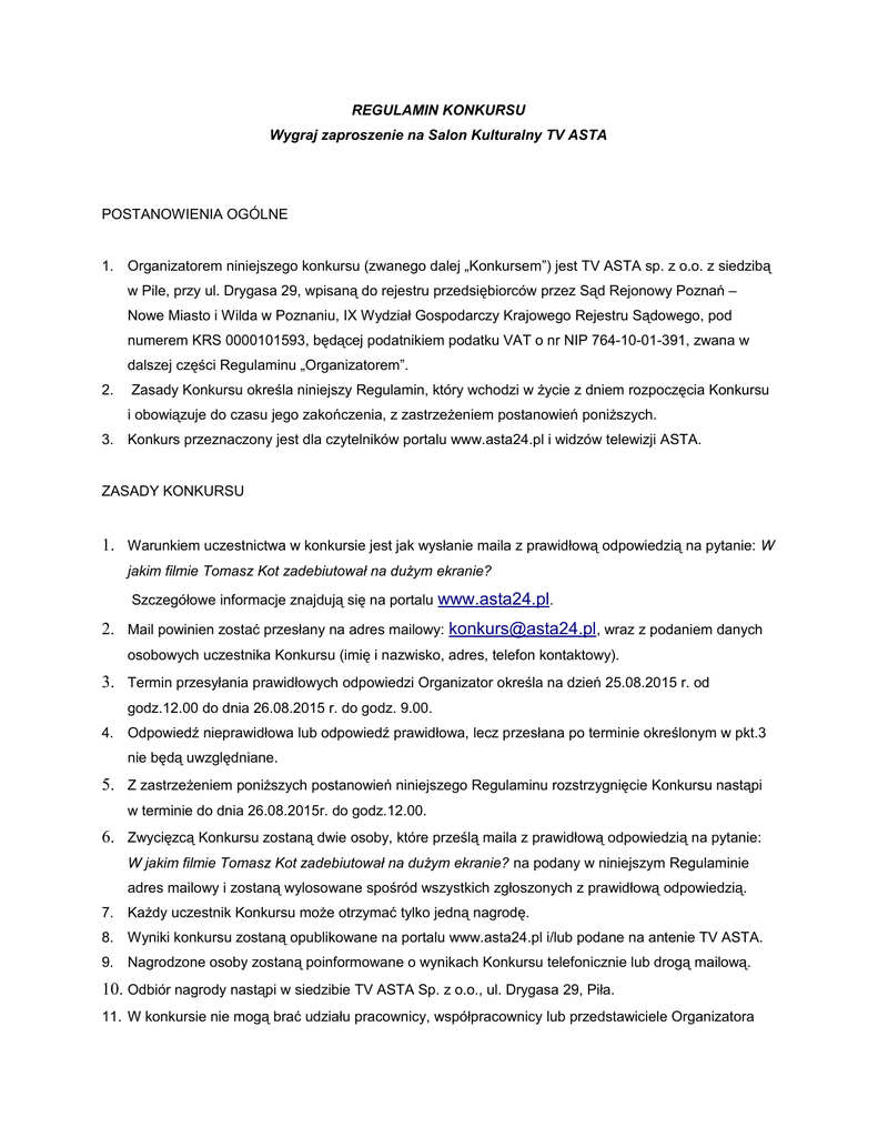REGULAMIN KONKURSU Wygraj zaproszenie na Salon Kulturalny TV ASTA POSTANOWIENIA OGÓLNE 1. Organizatorem niniejszego konkursu (zwanego dalej „Konkursem”) jest TV ASTA sp. z o.o. z siedzibą w Pile, przy ul. Drygasa 29, wpisaną do rejestru przedsiębiorców przez Sąd Rejonowy Poznań – Nowe Miasto i Wilda w Poznaniu, IX Wydział Gospodarczy Krajowego Rejestru Sądowego, pod numerem KRS 0000101593, będącej podatnikiem podatku VAT o nr NIP 764-10-01-391, zwana w dalszej części Regulaminu „Organizatorem”. 2. Zasady Konkursu określa niniejszy Regulamin, który wchodzi w życie z dniem rozpoczęcia Konkursu i obowiązuje do czasu jego zakończenia, z zastrzeżeniem postanowień poniższych. 3. Konkurs przeznaczony jest dla czytelników portalu www.asta24.pl i widzów telewizji ASTA. ZASADY KONKURSU 1. Warunkiem uczestnictwa w konkursie jest jak wysłanie maila z prawidłową odpowiedzią na pytanie: W jakim filmie Tomasz Kot zadebiutował na dużym ekranie? Szczegółowe informacje znajdują się na portalu www.asta24.pl. 2. Mail powinien zostać przesłany na adres mailowy: [email protected], wraz z podaniem danych osobowych uczestnika Konkursu (imię i nazwisko, adres, telefon kontaktowy). 3. Termin przesyłania prawidłowych odpowiedzi Organizator określa na dzień 25.08.2015 r. od godz.12.00 do dnia 26.08.2015 r. do godz. 9.00. 4. Odpowiedź nieprawidłowa lub odpowiedź prawidłowa, lecz przesłana po terminie określonym w pkt.3 nie będą uwzględniane. 5. Z zastrzeżeniem poniższych postanowień niniejszego Regulaminu rozstrzygnięcie Konkursu nastąpi w terminie do dnia 26.08.2015r. do godz.12.00. 6. Zwycięzcą Konkursu zostaną dwie osoby, które prześlą maila z prawidłową odpowiedzią na pytanie: W jakim filmie Tomasz Kot zadebiutował na dużym ekranie? na podany w niniejszym Regulaminie adres mailowy i zostaną wylosowane spośród wszystkich zgłoszonych z prawidłową odpowiedzią. 7. Każdy uczestnik Konkursu może otrzymać tylko jedną nagrodę. 8. Wyniki konkursu zostaną opublikowane na portalu www.asta24.pl i/lub podane na antenie TV ASTA. 9. Nagrodzone osoby zostaną poinformowane o wynikach Konkursu telefonicznie lub drogą mailową. 10. Odbiór nagrody nastąpi w siedzibie TV ASTA Sp. z o.o., ul. Drygasa 29, Piła. 11. W konkursie nie mogą brać udziału pracownicy, współpracownicy lub przedstawiciele Organizatora Konkursu oraz innych podmiotów powiązanych organizacyjnie, kapitałowo lub osobowo z Organizatorem Konkursu. NAGRODY 1. Nagrodą główną w Konkursie jest jedno podwójne zaproszenie na Salon Kulturalny, który odbędzie się w dniu 30.08.2015 w Kinie Helios w Pile. 2. Wartość nagrody wynosi 48 zł brutto. 3. Nagroda główna nie podlega wymianie na gotówkę. 4. W przypadku powstania obowiązku zapłaty podatku w związku z otrzymaniem nagrody, uczestnik zobowiązany jest do ich pokrycia we własnym zakresie, na co – przystępując do Konkursu – wyraża zgodę. 5. Organizator zastrzega sobie prawo do publikowania informacji o zwycięzcy oraz osobach wyróżnionych nagrodami na stronie internetowej www.asta24.pl i/lub na antenie telewizji TV ASTA, na co uczestnik – przystępując do udziału w Konkursie – wyraża zgodę. POSTANOWIENIA KOŃCOWE 1. Uczestnik przystępując do konkursu wyraża zgodę na przetwarzanie przez Organizatora Konkursu jego danych osobowych w celu przeprowadzenia konkursu w rozumieniu przepisów Ustawy z dnia 29 sierpnia 1997r. o ochronie danych osobowych (Dz. U. z 2002r., Nr 101, poz. 926 tekst jednolity ze zm.) Uczestnik Konkursu przekazujący Organizatorowi swoje dane osobowe ma prawo do ich wglądu i poprawiania. 2. Decyzje Organizatora Konkursu mają charakter ostateczny i nie przysługuje od nich odwołanie. 3. Przystąpienie do udziału w Konkursie jest jednoznaczne z przyjęciem warunków niniejszego Regulaminu. 4. W sprawach nieuregulowanych Regulaminem mają zastosowanie przepisy Kodeksu Cywilnego.