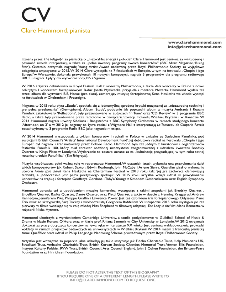 CV Clare Hammond, pianista www.clarehammond.com [email protected] Uznana przez The Telegraph za pianistkę o „niezwykłej energii i polocie” Clare Hammond jest ceniona za wirtuozerię i pewność swoich interpretacji, a także za „pełne inwencji programy swoich koncertów” (BBC Music Magazine, ‘Rising Star’). Ostatnio otrzymała nagrodę Young Artist Award nadawaną przez Royal Philharmonic Society za wyjątkowe osiągnięcia artystyczne w 2015. W 2014 Clare wystąpiła na 7 festiwalach w Europie, w tym na festiwalu „Chopin i jego Europa”w Warszawie, dokonała prawykonań 10 nowych kompozycji, nagrała 5 programów dla programu radiowego BBC3 i nagrała 3 płyty dla wytwórni Sony, BIS i Signum. W 2016 artystka debiutowała w Royal Festival Hall z orkiestrą Philharmonia, a także dała koncerty w Polsce z nowo odkrytym I koncertem fortepianowym B-dur Josefa Myslivecka, przyjaiela i mentora Mozarta. Hammond wydała też trzeci album dla wytwórni BIS, Horae (pro clara), zawierający muzykę fortepianową Kena Hesketha wa wlecie wystapi na festiwalach w Cheltenham i Presteigne. Nagrana w 2015 roku płyta „Etude”, spotkała się z jednomyślną aprobatą krytyki muzycznej za „niezawodną technikę i grę pełną przekonania” (Gramophone). Album ‘Etude’, podobnie jak poprzedni album z muzyką Andrzeja i Roxany Panufnik zatytułowany ‘Reflections’, były prezentowane w audycjach ‘In Tune’ oraz ‘CD Review’ w 3 programie BBC Radio, a także były prezentowane przez radiofonie w Szwajcarii, Szwecji, Holandii, Wielkiej Brytanii i w Kanadzie. W 2014 Hammond nagrała utwory Sibeliusa i Rangströma z BBC Symphony Orchestra w ramach studyjnego koncertu ‘Afternoon on 3’ a w 2012 jej nagrany na żywo recital z Wigmore Hall z interpretacją Le Tombeau de Couperin Ravela został wybrany w 3 programie Radia BBC jako nagranie miesiąca. W 2014 Hammond występowała z cyklem koncertów i recitali w Polsce w związku ze Stuleciem Panufnika, pod auspicjami British Council’s ‘Artists’ International Development Fund’. Jej debiutowy recital na Festiwalu „Chopin i jego Europa” był nagrany i transmitowany przez Polskie Radio. Hammond była też jednym z kuratorów i organizatorów festiwalu ‘Panufnik 100, który miał chrakter rodzinnej uroczystości zorganizowanej z udziałem kwartetu Brodsky Quartet w Kings Place w Londynie. Wydarzenie to zostało uznane za za „kulminację przypadającej w tym roku setnej rocznicy urodzin Panufnika” (The Telegraph). Muzyka współczesna pełni ważną rolę w repertuarze Hammond. W ostatnich latach wykonała ona prawykonania dzieł takich kompozytorów jak Robert Saxton, Edwin Roxburgh, John McCabe i Arlene Sierra. Guardian pisał o wykonaniu utworu Horae (pro clara) Kena Hesketha na Cheltenham Festival w 2013 roku tak: “jej gra zachwyca olśniewającą techniką, a jednocześnie jest pełna poetyckiego spokoju”. W 2015 roku artystka wzięła udział w prawykonaniu koncertów na trąbkę i fortepian Geoffreya Gordona i Toby'a Younga z Simonem Desbruslaisem oraz English Symphony Orchestra. Hammond uprawia też z upodobaniem muzykę kameralną, występując z takimi zespołami jak Brodsky Quartet , Endellion Quartet, Badke Quartet, Dante Quartet oraz Piatti Quartet, a także w duecie z Henning Kraggerud, Andrew Kennedym, Jenniferem Pike, Philippe Graffin i Lawrence Power. Jest też członkiem tria fortepianowego Odysseus Piano Trio wraz ze skrzypaczką Sarą Trickey i wiolonczelistą Gregorem Riddellem. W listopadzie 2015 roku wystąpiła po raz pierwszy w filmie wcielając się w rolę młodej Miss Shepherd w filmowej adaptacji The Lady in the Van Alana Bennetta, w reżyserii Nicka Hytnera. Hammond ukończyła z wyróżnieniem Cambridge University, a studia podyplomowe w Guildhall School of Music & Drama w klasie Ronana O’Hora oraz w klasie prof. Rhiana Samuela w City University w Londynie. W 2012 otrzymała doktorat za pracę dotyczącą koncertów na lewą rękę w literaturze XX wieku. Jest cenioną wykładowczynią, prowadzi wykłady w ramach projektów badawczych na uniwersytetach w Wielkiej Brytanii. W 2014 razem z francuską pianistką Anne Queffélec brała udział w Philip Langridge Mentoring Scheme prowadzonym przez Royal Philharmonic Society. Artystka jest wdzięczna za poparcie jakie udzielają jej takie instytucje jak Fidelio Charitable Trust, Help Musicians UK, Stradivari Trust, Ambache Charitable Trust, British Korean Society, Chandos Memorial Trust, Vernon Ellis Foundation, Instytut Kultury Polskiej, RVW Trust, British Council, Arts Council England, John S Cohen Foundation, the Britten-Pears Foundation oraz Hinrichsen Foundation. PLEASE DO NOT ALTER THE TEXT OF THIS BIOGRAPHY. IF YOU REQUIRE ONE OF A DIFFERENT LENGTH, PLEASE WRITE TO [email protected] TO REQUEST ONE.