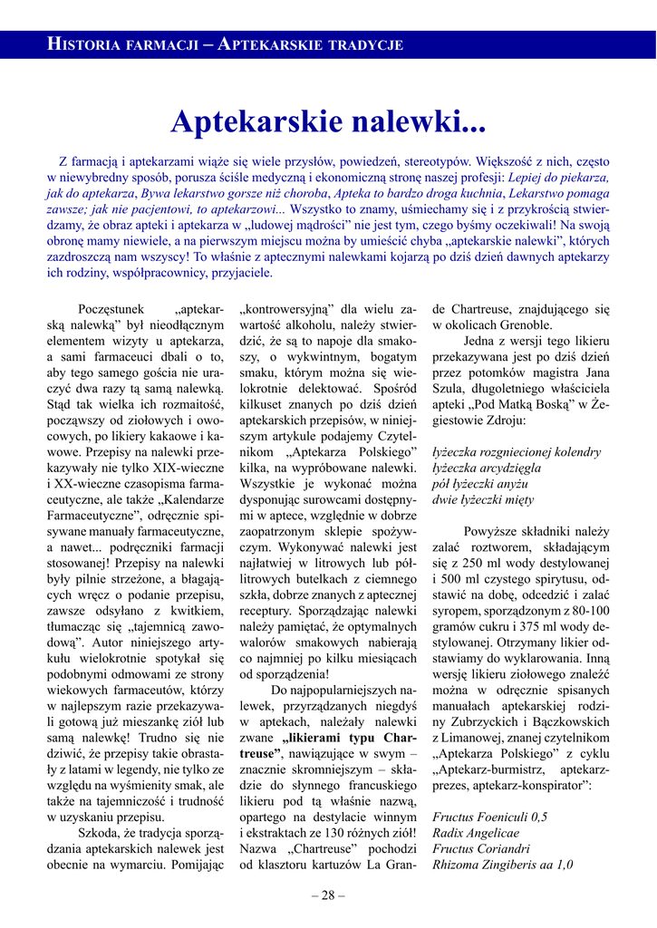 Historia farmacji – Aptekarskie tradycje Aptekarskie nalewki... Z farmacją i aptekarzami wiąże się wiele przysłów, powiedzeń, stereotypów. Większość z nich, często w niewybredny sposób, porusza ściśle medyczną i ekonomiczną stronę naszej profesji: Lepiej do piekarza, jak do aptekarza, Bywa lekarstwo gorsze niż choroba, Apteka to bardzo droga kuchnia, Lekarstwo pomaga zawsze; jak nie pacjentowi, to aptekarzowi... Wszystko to znamy, uśmiechamy się i z przykrością stwierdzamy, że obraz apteki i aptekarza w „ludowej mądrości” nie jest tym, czego byśmy oczekiwali! Na swoją obronę mamy niewiele, a na pierwszym miejscu można by umieścić chyba „aptekarskie nalewki”, których zazdroszczą nam wszyscy! To właśnie z aptecznymi nalewkami kojarzą po dziś dzień dawnych aptekarzy ich rodziny, współpracownicy, przyjaciele. Poczęstunek „aptekarską nalewką” był nieodłącznym elementem wizyty u aptekarza, a sami farmaceuci dbali o to, aby tego samego gościa nie uraczyć dwa razy tą samą nalewką. Stąd tak wielka ich rozmaitość, począwszy od ziołowych i owocowych, po likiery kakaowe i kawowe. Przepisy na nalewki przekazywały nie tylko XIX-wieczne i XX-wieczne czasopisma farmaceutyczne, ale także „Kalendarze Farmaceutyczne”, odręcznie spisywane manuały farmaceutyczne, a nawet... podręczniki farmacji stosowanej! Przepisy na nalewki były pilnie strzeżone, a błagających wręcz o podanie przepisu, zawsze odsyłano z kwitkiem, tłumacząc się „tajemnicą zawodową”. Autor niniejszego artykułu wielokrotnie spotykał się podobnymi odmowami ze strony wiekowych farmaceutów, którzy w najlepszym razie przekazywali gotową już mieszankę ziół lub samą nalewkę! Trudno się nie dziwić, że przepisy takie obrastały z latami w legendy, nie tylko ze względu na wyśmienity smak, ale także na tajemniczość i trudność w uzyskaniu przepisu. Szkoda, że tradycja sporządzania aptekarskich nalewek jest obecnie na wymarciu. Pomijając „kontrowersyjną” dla wielu zawartość alkoholu, należy stwierdzić, że są to napoje dla smakoszy, o wykwintnym, bogatym smaku, którym można się wielokrotnie delektować. Spośród kilkuset znanych po dziś dzień aptekarskich przepisów, w niniejszym artykule podajemy Czytelnikom „Aptekarza Polskiego” kilka, na wypróbowane nalewki. Wszystkie je wykonać można dysponując surowcami dostępnymi w aptece, względnie w dobrze zaopatrzonym sklepie spożywczym. Wykonywać nalewki jest najłatwiej w litrowych lub półlitrowych butelkach z ciemnego szkła, dobrze znanych z aptecznej receptury. Sporządzając nalewki należy pamiętać, że optymalnych walorów smakowych nabierają co najmniej po kilku miesiącach od sporządzenia! Do najpopularniejszych nalewek, przyrządzanych niegdyś w aptekach, należały nalewki zwane „likierami typu Chartreuse”, nawiązujące w swym – znacznie skromniejszym – składzie do słynnego francuskiego likieru pod tą właśnie nazwą, opartego na destylacie winnym i ekstraktach ze 130 różnych ziół! Nazwa „Chartreuse” pochodzi od klasztoru kartuzów La Gran– 28 – de Chartreuse, znajdującego się w okolicach Grenoble. Jedna z wersji tego likieru przekazywana jest po dziś dzień przez potomków magistra Jana Szula, długoletniego właściciela apteki „Pod Matką Boską” w Żegiestowie Zdroju: łyżeczka rozgniecionej kolendry łyżeczka arcydzięgla pół łyżeczki anyżu dwie łyżeczki mięty Powyższe składniki należy zalać roztworem, składającym się z 250 ml wody destylowanej i 500 ml czystego spirytusu, odstawić na dobę, odcedzić i zalać syropem, sporządzonym z 80-100 gramów cukru i 375 ml wody destylowanej. Otrzymany likier odstawiamy do wyklarowania. Inną wersję likieru ziołowego znaleźć można w odręcznie spisanych manuałach aptekarskiej rodziny Zubrzyckich i Bączkowskich z Limanowej, znanej czytelnikom „Aptekarza Polskiego” z cyklu „Aptekarz-burmistrz, aptekarzprezes, aptekarz-konspirator”: Fructus Foeniculi 0,5 Radix Angelicae Fructus Coriandri Rhizoma Zingiberis aa 1,0 Historia farmacji – Aptekarskie tradycje Folium Menthae piperitae 2,0 Spiritus 500 ml Sirupus simplex 200 Aqua destillata ad 1000 Nalewka ta charakteryzuje się nie tylko delikatnym, wytwornym smakiem, ale także sposobem wykonania. Wymienione surowce ziołowe zalewamy podaną ilością czystego etanolu po czym odstawiamy na tydzień do ciemnego miejsca, codziennie kilkukrotnie wstrząsając. Po tygodniu macerat należy starannie przesączyć przez bibułę filtracyjną, aby nalewka miała piękny, złocistozielony, opalizujący kolor. Do przesączu dodaje się 200 gramów syropu prostego (w zależności od upodobań ilość ta może być większa lub mniejsza) i uzupełnia wodą destylowaną do 1000 gramów. Należy także zaznaczyć, że kłącze imbiru musi być świeże i bardzo drobno pokrojone. Skład nalewek ziołowych można dowolnie modyfikować, uzyskując produkty najbardziej odpowiadające indywidualnemu smakowi. Poniżej przedstawiony skład, opracowany przez autora niniejszego artykułu, charakteryzuje się wybitnymi i bardzo intensywnymi walorami smakowymi. Nalewka ta jest zarazem niezastąpionym środkiem przy niestrawności: Fructus Anisi stellati Fructus Caryophylli Fructus Cardamoni aa 0,5 Fructus Anisi Rhizoma Zingiberis Fructus Foeniculi aa 1,0 Radix Angelicae Fructus Coriandri Folium Menthae piperitae aa 2,0 Spiritus 500 ml Sirupus simplex 200 Aqua destillata ad 1000 które miały już swą naturalną wielkość, ale które można było z łatwością pokroić! Orzechy umieszczało się w dużym słoju, do którego dodawano od 100 do 250 gramów cukru, po czym zalewano litrem czystego spirytusu. Po kilkunastu dniach, a nawet kilku tygodniach, macerat zlewało się i dowolnie rozcieńczało wodą. Bardzo interesujące były słodkie likiery kakaowe. Ich wykonanie nastręczało wiele trudności, a proponowane w 
