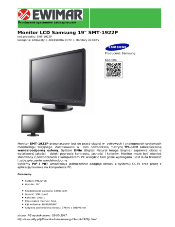 Producent systemów zabezpieczeń Monitor LCD Samsung 19" SMT-1922P kod produktu: SMT-1922P kategoria: eXQuality > AKCESORIA CCTV > Monitory do CCTV Producent: Samsung Kod QR: Monitor SMT-1922P przeznaczony jest do pracy ciągłej w cyfrowych i analogowych systemach monitoringu wizyjnego. Zastosowano w nim nowoczesną matrycę TFL-LCD zabezpieczoną wandaloodporną osłoną. System DNIe (Digital Natural Image Engine) zapewnia obraz o wyjątkowej jakości dzięki poprawie kontrastu, jasności i kolorów. Monitor może być również stosowany z powodzeniem z komputerami PC wszędzie tam gdzie wymagana jest duża trwałość i zabezpieczenie wandaloodporne. Systemy PIP i PBT umożliwiają jednocześnie podgląd obrazu z systemu CCTV oraz pracę z aplikacją biurową na komputerze PC. Parametry System: PAL/NTSC Wymiar: 19” Rozdzielczość zalecana: 1280x1024 Jasność: 300 cd/m2 Kontrast: 1000:1 Czas reakcji matrycy: 5ms Kąt widzenia: 80/80/80/80° Aktywna powierzchnia ekranu: 376(H) x 301(V) mm strona: 1/2 wydrukowano: 02-03-2017 http://exquality.pl/pl/monitor-lcd-samsung-19-smt-1922p.html Czas życia matrycy CCFL: 50 000 godzin Skanowanie: Progresywne Rozdzielczość pozioma: 620 TVL Tryb ekranu: 4:3 Filtr 3D Comb Redukcja szumów PIP/PBT Zamrożenie obrazu (Freeze) Under Scan Wejścia composite: 2 x BNC z wyjściami przelotowymi Wejście S-Video: 1 x Y/C z wyjściem przelotowym VGA: 1 Wejście audio: 2 x RCA stereo 2W OSD: Menu w 11 językach w tym j. polski HAS - podnoszenie: 0~100 mm HAS - nachylenie: -5°~23° HAS - obrót: -165°~+165° Waga: 6,9 kg Wymiar najniższy [mm]: 412(W)x398(H)x220(D) Wymiar najwyższy [mm]: 412(W)x498(H)x220(D) Zasilanie: 100~240 V AC Pobór mocy: 42W strona: 2/2 wydrukowano: 02-03-2017 http://exquality.pl/pl/monitor-lcd-samsung-19-smt-1922p.html