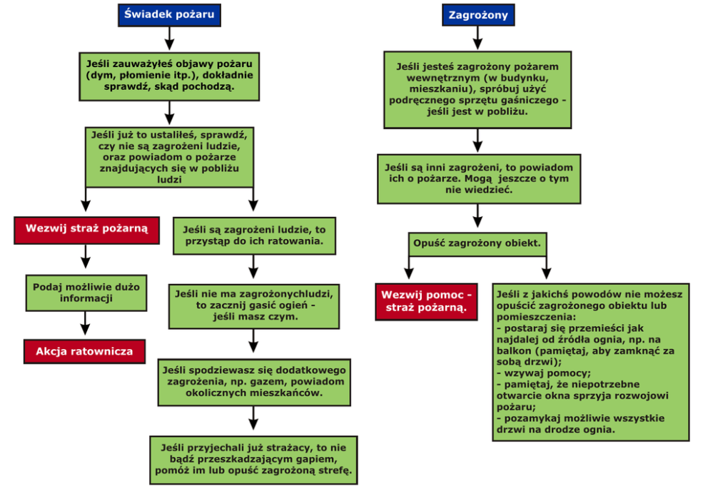 Świadek pożaru Zagrożony Jeśli zauważyłeś objawy pożaru (dym, płomienie itp.), dokładnie sprawdź, skąd pochodzą. Jeśli jesteś zagrożony pożarem wewnętrznym (w budynku, mieszkaniu), spróbuj użyć podręcznego sprzętu gaśniczego jeśli jest w pobliżu. Jeśli już to ustaliłeś, sprawdź, czy nie są zagrożeni ludzie, oraz powiadom o pożarze znajdujących się w pobliżu ludzi Wezwij straż pożarną Podaj możliwie dużo informacji Jeśli są zagrożeni ludzie, to przystąp do ich ratowania. Jeśli nie ma zagrożonychludzi, to zacznij gasić ogień jeśli masz czym. Akcja ratownicza Jeśli spodziewasz się dodatkowego zagrożenia, np. gazem, powiadom okolicznych mieszkańców. Jeśli przyjechali już strażacy, to nie bądź przeszkadzającym gapiem, pomóż im lub opuść zagrożoną strefę. Jeśli są inni zagrożeni, to powiadom ich o pożarze. Mogą jeszcze o tym nie wiedzieć. Opuść zagrożony obiekt. Wezwij pomoc straż pożarną. Jeśli z jakichś powodów nie możesz opuścić zagrożonego obiektu lub pomieszczenia: - postaraj się przemieści jak najdalej od źródła ognia, np. na balkon (pamiętaj, aby zamknąć za sobą drzwi); - wzywaj pomocy; - pamiętaj, że niepotrzebne otwarcie okna sprzyja rozwojowi pożaru; - pozamykaj możliwie wszystkie drzwi na drodze ognia.