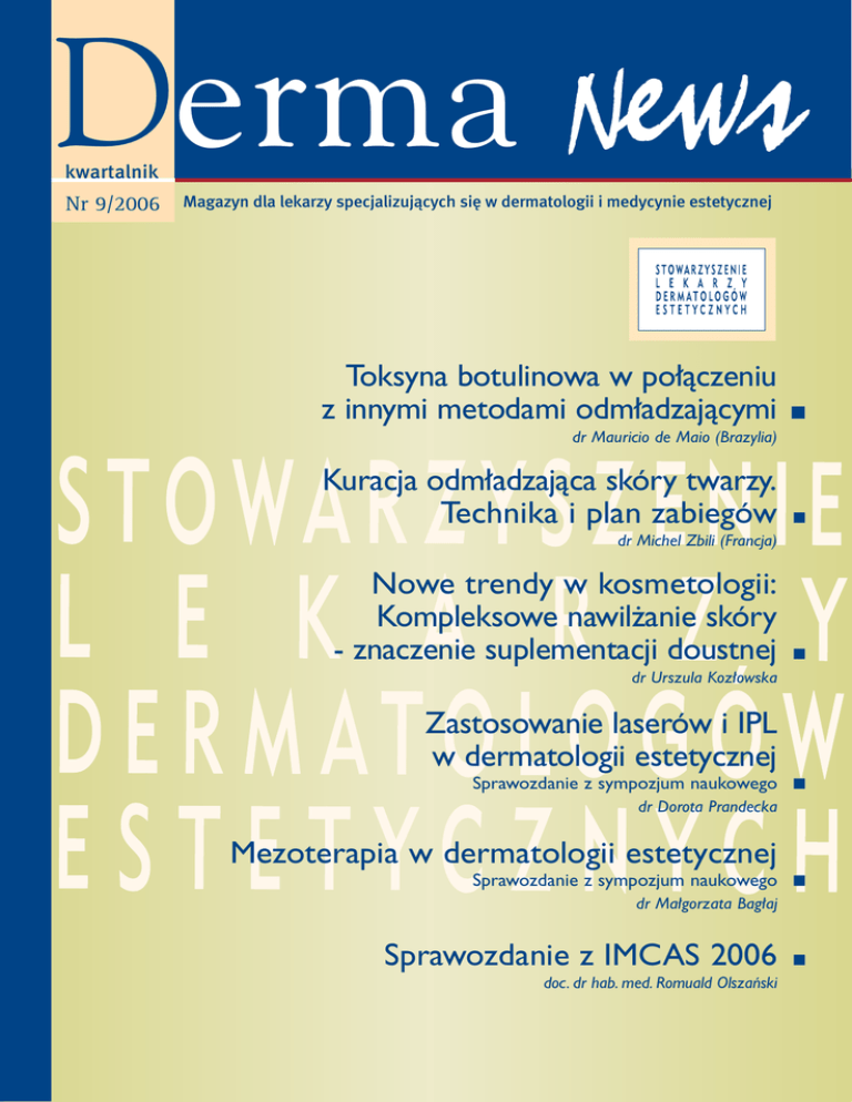 Derma News kwartalnik Nr 9/2006 Magazyn dla lekarzy specjalizujàcych si´ w dermatologii i medycynie estetycznej Toksyna botulinowa w po∏àczeniu z innymi metodami odm∏adzajàcymi ■ dr Mauricio de Maio (Brazylia) Kuracja odm∏adzajàca skóry twarzy. Technika i plan zabiegów ■ dr Michel Zbili (Francja) Nowe trendy w kosmetologii: Kompleksowe nawil˝anie skóry - znaczenie suplementacji doustnej ■ dr Urszula Koz∏owska Zastosowanie laserów i IPL w dermatologii estetycznej Sprawozdanie z sympozjum naukowego ■ dr Dorota Prandecka Mezoterapia w dermatologii estetycznej Sprawozdanie z sympozjum naukowego ■ dr Ma∏gorzata Bag∏aj Sprawozdanie z IMCAS 2006 doc. dr hab. med. Romuald Olszaƒski ■ Drodzy Paƒstwo! Niebawem b´dziemy mieli okazj´ spotkaç si´ osobiÊcie na V Jubileuszowej Konferencji Stowarzyszenia Lekarzy Dermatologów Estetycznych, która odb´dzie si´ w dniach 31.03-02.04.2006 r. w Warszawie. Sprawozdanie z Konferencji wydrukujemy w nast´pnym numerze, ale pozwol´ sobie ju˝ teraz na krótkie podsumowanie naszej dzia∏alnoÊci. SLDE powsta∏o w 1998 roku, reprezentujemy polskie Êrodowisko dermatologów estetycznych na forum europejskim – jesteÊmy cz∏onkiem Europejskiego Stowarzyszenia Kosmetologii i Dermatologii Estetycznej. Nasi cz∏onkowie majà dost´p do praktyk w presti˝owych oÊrodkach europejskich, uczestniczà te˝ we wszystkich najlepszych Êwiatowych kongresach poÊwi´conych dermatologii estetycznej. Z naszej inicjatywy powsta∏ Ekspert Anti Aging – magazyn dla pacjentów gabinetów dermatologii estetycznej, w którym nasi autorzy przedstawiajà czytelnikom najnowsze metody i zabiegi z zakresu dermatologii i medycyny estetycznej. Przygotowujemy si´ te˝ do zmian w Derma News. Podstawowa idea – aby nasz magazyn by∏ êród∏em informacji o najwa˝niejszych wydarzeniach zwiàzanych z naszym Êrodowiskiem w kraju i za granicà – zostaje oczywiÊcie bez zmian. Zale˝y nam jednak na tym, aby Derma News si´ rozwija∏ i by∏ coraz ciekawszy. Dlatego te˝ zwracam si´ z proÊbà o przysy∏anie na adres redakcji uwag, o tym co chcielibyÊcie zmieniç i o co uzupe∏niç nasz magazyn. Zach´cam te˝ ka˝dego do zg∏aszania tematów i przysy∏ania tekstów. Cennà inicjatyw´ zg∏osi∏a nam dr Maria Nowiƒska. Korzystamy z jej podpowiedzi i od przysz∏ego numeru wprowadzamy nowà rubryk´ pt. „Praktyczne informacje", w której ka˝dy b´dzie móg∏ bezp∏atnie og∏osiç informacj´ o sprzeda˝y u˝ywanego sprz´tu, wyposa˝enia gabinetu, itp. Zg∏oszenia prosimy przysy∏aç na adres redakcji lub Stowarzyszenia. Zapraszam do udzia∏u w V Jubileuszowej Konferencji Stowarzyszenia Lekarzy Dermatologów Estetycznych, a w zwiàzku ze zbli˝ajàcymi si´ Âwi´tami Wielkanocy pragn´ z∏o˝yç wszystkim czytelnikom DermaNewsa serdeczne ˝yczenia.Wszelkiej pomyÊlnoÊci, sukcesów w ˝yciu osobistym i zawodowym oraz smacznego jajka i mokrego Dyngusa Derma News Kwartalnik. Nast´pny numer: czerwiec 2006 WYDAWCA: STOWARZYSZENIE LEKARZY DERMATOLOGÓW ESTETYCZNYCH ul. Domaniewska 47 02-672 Warszawa tel. (0-22) 853 39 70 fax: (0-22) 847 69 33 tel. 0-605 332 776 e-mail: [email protected] www.dermatologia-estetyczna.pl Redakcja i Dzia∏ Reklamy: Agencja Reklamowo-Wydawnicza Alter Ego ul. Parkowa 13/17 m. 125 tel. 0-22 49 83 530 fax: 0-22 49 97 443 tel. kom: 0-607 338 827, 0-601 332 033 e-mail: [email protected] ˝yczy Barbara Walkiewicz-Cyraƒska Prezes Stowarzyszenia Lekarzy Dermatologów Estetycznych Bezp∏atny Magazyn dla klientów gabinetów dermatologii i medycyny estetycznej, chirurgii plastycznej, wellness i beauty spa Zamówienia: [email protected] tel. 022 498 35 30, 0 607 338 827, 0 601 332 033 dr Mauricio de Maio (Brazylia) Toksyna botulinowa w po∏àczeniu z innymi metodami odm∏adzajàcymi Toksyna botulinowa odgrywa istotnà rol´ wÊród zabiegów odm∏adzania twarzy, a zastosowana w skojarzeniu z innymi metodami umo˝liwia uzyskanie i zachowanie trwa∏ego efektu. Niniejszy artyku∏ zawiera krótki przeglàd zastosowaƒ toksyny botulinowej w po∏àczeniu z wype∏niaczami, resurfacingiem laserowym i innymi chirurgicznymi metodami odm∏adzania. Cosmetic & Laser Ther 2003; 5: 210-212 Wprowadzenie Toksyna botulinowa odgrywa istotnà rol´ wÊród zabiegów odm∏adzania twarzy. Stanowi równie˝ cenne uzupe∏nienie metod chirurgicznych (1). Mo˝e byç stosowana przed, po, bàdê w tym samym czasie co wype∏niacze, metody laserowe, peeling chemiczny i metody chirurgiczne. Celem podawania toksyny botulinowej jest obni˝anie dynamicznej aktywnoÊci mi´Êni (2). Stosowanie toksyny botulinowej w skojarzeniu z innymi metodami pomaga zachowaç d∏ugotrwa∏y efekt. W zale˝noÊci od etiologii, zmarszczki na twarzy mogà byç klasyfikowane jako statyczne, dynamiczne, grawitacyjne, napi´ciowe i wtórne, czyli towarzyszàce. Stosujàc tylko jednà metod´ leczenia zmarszczek towarzyszàcych, uzyskuje si´ zwykle jedynie cz´Êciowy efekt. Zmarszczki mo˝na równie˝ podzieliç w zale˝noÊci od ich budowy morfologicznej i g∏´bokoÊci na powierzchniowe, Êredniog∏´bokie i g∏´bokie. Mid-peeling jest w∏aÊciwà metodà pozbywania si´ powierzchniowych zmarszczek, podczas gdy wype∏niacze i g∏´boki peeling jest odpowiedni do leczenia zmarszczek Êredniog∏´bokich i g∏´bokich. Zmarszczki towarzyszàce posiadajà komponent´ statycznà i dynamicznà. Zazwyczaj ∏atwiej jest leczyç najpierw Derma News (A) 4 komponent´ dynamicznà, a nast´pnie statycznà. Niekiedy wstrzykiwanie toksyny botulinowej w monoterapii przynosi zadowalajàce efekty i nie ma potrzeby stosowania innych metod leczenia, przynajmniej przez pewien czas. Wprawdzie w przypadku ka˝dego pacjenta mo˝na poszukiwaç najbardziej „akademickiej" metody leczenia, jednak niekiedy pacjenci oczekujà, ˝e zastosowana u nich metoda b´dzie mniej inwazyjna ni˝ resurfacing laserowy, czy chirurgiczne usuwanie zmarszczek. Z akademickiego punkt