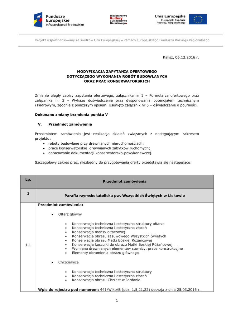 Projekt współfinansowany ze środków Unii Europejskiej w ramach Europejskiego Funduszu Rozwoju Regionalnego Kalisz, 06.12.2016 r. MODYFIKACJA ZAPYTANIA OFERTOWEGO DOTYCZĄCEGO WYKONANIA ROBÓT BUDOWLANYCH ORAZ PRAC KONSERWATORSKICH Zmianie uległy zapisy zapytania ofertowego, załącznika nr 1 – Formularza ofertowego oraz załącznika nr 3 - Wykazu doświadczenia oraz dysponowania potencjałem technicznym i kadrowym, zgodnie z poniższym opisem. Usunięto załącznik nr 5 – oświadczenie o poufności. Dokonano zmiany brzmienia punktu V V. Przedmiot zamówienia Przedmiotem zamówienia jest realizacja działań związanych z następującym zakresem projektu: roboty budowlane przy drewnianych nieruchomościach; prace konserwatorskie drewnianych zabytków ruchomych; opracowanie dokumentacji konserwatorsko-powykonawczej. Szczegółowy zakres prac, niezbędny do przygotowania oferty przedstawia się następująco: Lp. Przedmiot zamówienia 1 Parafia rzymskokatolicka pw. Wszystkich Świętych w Liskowie Przedmiot zamówienia: Ołtarz główny 1.1 Konserwacja techniczna i estetyczna struktury ołtarza Konserwacja techniczna i estetyczna złoceń Konserwacja mensy ołtarzowej Konserwacja obrazu zasuwowego Wszystkich Świętych Konserwacja obrazu Matki Boskiej Różańcowej Konserwacja koszulki do obrazu Matki Boskiej Różańcowej Wymiana drewnianych elementów suwnicy, prace konstrukcyjne Elementy obramienia obrazu głównego Chrzcielnica Konserwacja techniczna i estetyczna struktury Konserwacja techniczna i estetyczna złoceń Konserwacja obrazu Chrzest w Jordanie Wpis do rejestru pod numerem: 441/Wlkp/B (poz. 1,5,21,22) decyzją z dnia 25.03.2016 r. 1 Projekt współfinansowany ze środków Unii Europejskiej w ramach Europejskiego Funduszu Rozwoju Regionalnego Numer pozwolenia na prowadzenie prac konserwatorskich/prac restauratorskich przy zabytku wpisanym do rejestru zabytków: 30/2016/B Termin ważności pozwolenia: 31.12.2020 r. 2 Parafia rzymskokatolicka pw. Wszystkich Świętych w Droszewie Przedmiot zamówienia: Ołtarz główny Konserwacja Konserwacja Konserwacja Konserwacja Konserwacja Konserwacja Konserwacja Konserwacja Konserwacja Konserwacja Konserwacja techniczna i estetyczna struktury ołtarza techniczna i estetyczna złoceń (elementy snycerskie) techniczna i estetyczna struktury tabernakulum techniczna i estetyczna złoceń i krzyża tabernakulum rzeźby Św. Anny rzeźby Św. Jana Chrzciciela rzeźby Św. Józefa rzeźby Św. Wojciecha rzeźby pelikana obrazu Matki Boskiej Częstochowskiej obrazu Wszystkich Świętych Pańskich Ołtarz boczny prawy pw. Pana Jezusa Ukrzyżowanego 2.1 Konserwacja Konserwacja Konserwacja Konserwacja Konserwacja Konserwacja techniczna i estetyczna struktury ołtarza techniczna i estetyczna złoceń techniczna i estetyczna struktury tabernakulum techniczna i estetyczna złoceń tabernakulum figury Chrystusa z krzyżem figur aniołów na tabernakulum - 2 szt. Ołtarz boczny lewy pw. Serca Jezusa Miłosiernego Konserwacja Konserwacja Konserwacja Konserwacja Konserwacja Konserwacja techniczna i estetyczna struktury ołtarza techniczna i estetyczna złoceń techniczna i estetyczna struktury tabernakulum techniczna i estetyczna złoceń tabernakulum figury Chrystusa obrazu Matki Boskiej Miłosiernej Chrzcielnica Konserwacja techniczna i estetyczna struktury Konserwacja techniczna i estetyczna złoceń Ambona Konserwacja techniczna i estetyczna struktury Konserwacja techniczna i estetyczna złoceń Konserwacja przedstawienia ewangelistów - 4 szt. 2 Projekt współfinansowany ze środków Unii Europejskiej w ramach Europejskiego Funduszu Rozwoju Regionalnego Konserwacja figury anioła w zwieńczeniu Wpis do rejestru pod numerem: 438/Wlkp/B (poz. 1,2, 3, 4, 6) decyzją z dnia 15.03.2016 r. Numer pozwolenia na prowadzenie prac konserwatorskich/prac restauratorskich przy zabytku wpisanym do rejestru zabytków: 23/2016/B Termin ważności pozwolenia: 30.11.2018 r. 3 Parafia rzymskokatolicka pw. Wniebowzięcia Najświętszej Mary Panny w Żegocinie Przedmiot zamówienia: Ławy kolatorskie 2 szt. Konserwacja techniczna i estetyczna struktury Konfesjonały 2 szt. Konserwacja techniczna i estetyczna struktury Ławki 12 szt. Konserwacja techniczna i estetyczna struktury Prospekt organowy Sufity, ściany, rzeźby i elementy architektoniczne 3.1 Konserwacja techniczna i estetyczna struktury Konserwacja techniczna i estetyczna złoceń Konserwacja figur aniołów - 2 szt. Rekonstrukcja konsoli Konserwacja Konserwacja Konserwacja Konserwacja Konserwacja Konserwacja sufitu prezbiterium - impregnacja i patynowanie sufitu nawy - impregnacja i patynowanie ścian prezbiterium ścian nawy balustrady chóru złocenia głowic pilastrów Wpis do rejestru pod numerem: 355/B (poz. 7-10) decyzją z dnia 29.01.1975 r. A.K.I.11a/211 decyzją z dnia 31.03.1933 r. Numer pozwolenia na prowadzenie prac konserwatorskich/prac restauratorskich przy zabytku wpisanym do rejestru zabytków: 25/2016/B 24/2016/B 155/2016/A Termin ważności pozwolenia: 30.11.2018 r. (25/2016/B) 30.11.2018 r. (24/2016/B) 30.11.2018 r. (155/2016/A) 3 Projekt współfinansowany ze środków Unii Europejskiej w ramach Europejskiego Funduszu Rozwoju Regionalnego Numer pozwolenia na budowę, konserwację i restaurację polichromii ścian nawy i prezbiterium oraz aranżację kolorystyczną stropu nawy i pozornego sklepienia w prezbiterium: 132/2016 decyzja stała się wykonalna z dniem 29.03.2016 r. 4 Parafia rzymskokatolicka pw. św. Marii Magdaleny w Sośnicy Przedmiot zamówienia: Ołtarz główny Konserwacja obrazu olejnego na płótnie Konserwacja ramy Konserwacja obrazu olejnego na płótnie Konserwacja ramy Krucyfiks na belce tęczowej Konserwacja techniczna i estetyczna struktury Konserwacja techniczna i estetyczna złoceń Obraz Matki Boskiej Konserwacja techniczna i estetyczna struktury Konserwacja techniczna i estetyczna złoceń Obraz św. Benon techniczna i estetyczna struktury techniczna i estety