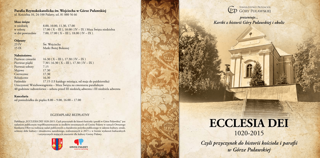 Parafia Rzymskokatolicka św. Wojciecha w Górze Puławskiej ul. Kościelna 16, 24-100 Puławy, tel. 81 880 56 66 Msze święte w niedzielę w sobotę w dni powszednie Odpusty 23 IV 15 IX 8.00, 10.00, 11.30, 17.00 17.00 ( X – III ), 18.00 ( IV – IX ) Msza Święta niedzielna 7.00, 17.00 ( X – III ), 18.00 ( IV – IX ) prezentuje... Kartki z historii Góry Puławskiej i okolic Św. Wojciecha Matki Bożej Bolesnej Nabożeństwa Pierwsze czwartki 16.30 ( X – III ), 17.30 ( IV – IX ) Pierwsze piątki 7.30 i 16.30 ( X – III ), 17.30 ( IV – IX ) Pierwsze soboty 7.15 Majowe 17.30 Czerwcowe 17.30 Różańcowe 16.30 Fatimskie 17.15 (13 każdego miesiąca, od maja do października) Uroczystość Wniebowstąpienia – Msza Święta na cmentarzu parafialnym 40 godzinne nabożeństwo – sobota przed III niedzielą adwentu i III niedziela adwentu Kancelaria od poniedziałku do piątku 8.00 – 9.00, 16.00 – 17.00 EGZEMPLARZ BEZPŁATNY Publikacja „ECCLESIA DEI 1020-2015. Czyli przyczynek do historii kościoła i parafii w Górze Puławskiej” jest zadaniem publicznym współfinansowanym ze środków otrzymanych od Gminy Puławy w ramach Otwartego Konkursu Ofert na realizację zadań publicznych o charakterze pożytku publicznego w zakresie kultury, sztuki, ochrony dóbr kultury i dziedzictwa narodowego, realizowanych w 2015 r. w formie wydarzeń kulturalnych i artystycznych mających znaczenie dla kultury Gminy Puławy. ECCLESIA DEI 1020-2015 Czyli przyczynek do historii kościoła i parafii w Górze Puławskiej ECCLESIA DEI – z łac. KOŚCIÓŁ BOŻY Towarzystwo Przyjaciół Góry Puławskiej ul. Ogrodowa 18, Góra Puławska, 24-100 Puławy tel. 81 880 50 80 www.tpgorapulawska.pl Wydanie pierwsze, 2015 Tekst: Tomasz Mizak Współpraca: ks. Marek Kucharski, Teresa Dymowska Korekta tekstu: Katarzyna Mizak Skany i współczesne fotografie kościoła: Cezary Świderski Szkice pierwszych kościołów: Marta Andała Projekt graficzny i druk: Drukarnia Standruk, www.standruk.com ISBN: 978-83-936846-1-8 Kolejna publikacja z cyklu „Kartki z historii ….” jest próbą przybliżenia historii parafii i kościoła w Górze Puławskiej. Nie jest to praca naukowa (pozostawiamy to historykom), ale napisana przystępnym językiem opowieść wykorzystująca obszerne fragmenty dostępnych źródeł historycznych. Publikacja ma także na celu nakłonienie czytelnika do spojrzenia na nasz Kościół z perspektywy historii, do dostrzeżenia jego piękna i wyjątkowości. Autorzy składają podziękowania osobom, które zechciały podzielić się z nami swoimi wspomnieniami: Janowi Adamskiemu, Sabinie Pachockiej, Stanisławowi Skomrze, Sabinie Wiśniewskiej, Zofii Wójcik, Henryce Piasecznej, Władysławie Szymańskiej. Zamieszczone fotografie pochodzą ze zbiorów prywatnych rodzin: Iwony Chodoły, Iwony Chrzanowskiej, Teresy Dymowskiej, Marii Gajowniczek, Wiesławy Kierasińskiej, Elżbiety Kuriaty, Jolanty Makuch, Haliny Mizak, Wioletty Mizak, Zofii Wojas. Część fotografii pochodzi ze strony internetowej www.gminapulawy.pl i z archiwum Pracowni Dokumentacji Dziejów Miasta POK „Dom Chemika” w Puławach, dawnepulawy.pl oraz ze zbiorów Zbigniewa Kiełba i Krzysztofa Kuźmy. Dziękujemy za udostępnione materiały ks. Andrzejowi Mizakowi i Maciejowi Szymańskiemu. Krótka historia diecezji W początkach swej historii teren dzisiejszej diecezji radomskiej był podzielony między archidiecezję gnieźnieńską, jak też diecezje poznańską i krakowską. Parafia Jaroszyn wchodziła w skład diecezji krakowskiej. W wyniku trzeciego rozbioru Polski z 1795 diecezja została podzielona. Po zabiegach Austrii Pius VI wydał 13 czerwca 1805 r. bulle „Indefessum personarum”, na mocy której utworzył diecezję kielecką, pod którą znalazła się parafia w Górze (Puławskiej). 30 czerwca 1818 r., Pius VII bullą „Ex imposita Nobis” powołał do istnienia diecezję sandomierską, do której należała parafia św. Wojciecha. Taki stan rzeczy istniał do 1981 r., kiedy to na prośbę bp. Edwarda Materskiego Jan Paweł II dokonał zmianę nazwy diecezji z sandomierskiej na sanomiersko-radomską. Jan Paweł II 25 marca 1992 r. mocą bulli „Totus Tuus Poloniae populus” dokonał reorganizacji struktur Kościoła w Polsce powołując do życia trzynaście nowych diecezji, w tym diecezję radomską, ze stolicą w Radomiu. Katedrą nowej diecezji został kościół pw. Opieki NMP w Radomiu. 21 stycznia 1995 roku bp. Edward Materski, dokonał reorganizacji sieci dekanalnej i ich liczba wzrosła o pięć z 23 do 28. Parafia pw. św. Wojciecha w Górze Puławskiej znajduje się w dekanacie zwoleńskim. W skład parafii wchodzą następujące miejscowości: Bronowice, Dobrosławów, Góra Puławska, Kolonia Góra Puławska, Jaroszyn, Kajetanów, Kowala, Łęka, Nasiłów, Pachnowola, Sadłowice, Tomaszów. prezentuje... Kartki z historii Góry Puławskiej i okolic ECCLESIA DEI 1020-2015 Czyli przyczynek do historii kościoła i parafii w Górze Puławskiej Dzwon, kościelny bije dzwon. Gdzie brzmi jego piękny ton W bardzo odległych słychać go czasach, gdy święty Wojciech tu w naszych lasach sławił dobroć i chwałę Pańską i głosił wiarę chrześcijańską. Dzwon, kościelny bije dzwon. Szum wód niesie jego ton. Kościół nad brzegiem pobudowany, ciągle przez Wisłę jest zalewany. Lecz prosty lud silny w swej wierze świątynię znów wznosi w ofierze. Dzwon, kościelny bije dzwon. Ze wzgórza brzmi jego ton. Nie groźna nasza, szeroka Wisła, spełniona ofiara Czartoryska, a Wojciech ze wzgórza pięknego błogosławi od Pana naszego. Dzwon, zamilkł kościelny dzwon. Pod ziemią brzmi jego ton. Duchy parafian strzegą go co noc. Nie straszna im faszystowska moc. Bomby nie zniszczą wiary w nas! Świątynię wzniesiemy jeszcze raz. Znów bije kościelny dzwon. Radośnie brzmi jego ton. Małgorzata Skomra Spis treści Słowo wstępne . . . . . . . . . . . . . . . . . . . . . . . . 