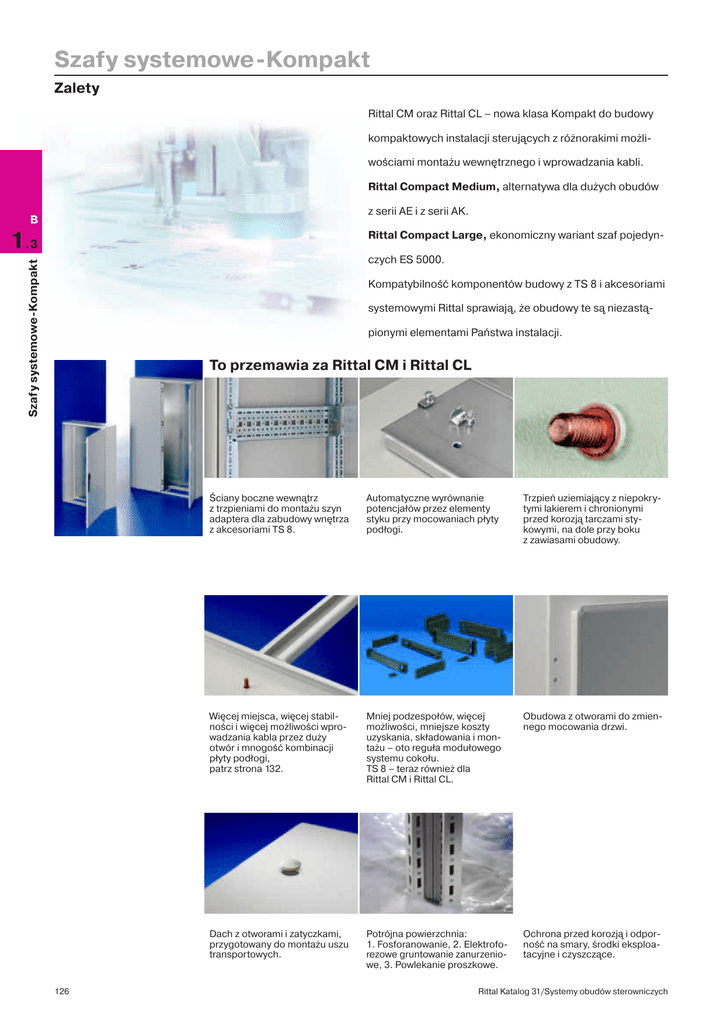 Szafy systemowe-Kompakt Zalety Rittal CM oraz Rittal CL – nowa klasa Kompakt do budowy kompaktowych instalacji sterujących z różnorakimi możliwościami montażu wewnętrznego i wprowadzania kabli. Rittal Compact Medium, alternatywa dla dużych obudów z serii AE i z serii AK. B Rittal Compact Large, ekonomiczny wariant szaf pojedyn- 1.3 Szafy systemowe-Kompakt czych ES 5000. Kompatybilność komponentów budowy z TS 8 i akcesoriami systemowymi Rittal sprawiają, że obudowy te są niezastąpionymi elementami Państwa instalacji. To przemawia za Rittal CM i Rittal CL 126 Ściany boczne wewnątrz z trzpieniami do montażu szyn adaptera dla zabudowy wnętrza z akcesoriami TS 8. Automatyczne wyrównanie potencjałów przez elementy styku przy mocowaniach płyty podłogi. Trzpień uziemiający z niepokrytymi lakierem i chronionymi przed korozją tarczami stykowymi, na dole przy boku z zawiasami obudowy. Więcej miejsca, więcej stabilności i więcej możliwości wprowadzania kabla przez duży otwór i mnogość kombinacji płyty podłogi, patrz strona 132. Mniej podzespołów, więcej możliwości, mniejsze koszty uzyskania, składowania i montażu – oto reguła modułowego systemu cokołu. TS 8 – teraz również dla Rittal CM i Rittal CL. Obudowa z otworami do zmiennego mocowania drzwi. Dach z otworami i zatyczkami, przygotowany do montażu uszu transportowych. Potrójna powierzchnia: 1. Fosforanowanie, 2. Elektroforezowe gruntowanie zanurzeniowe, 3. Powlekanie proszkowe. Ochrona przed korozją i odporność na smary, środki eksploatacyjne i czyszczące. Rittal Katalog 31/Systemy obudów sterowniczych Szafy systemowe-Kompakt Zalety Compact Medium Rittal CM B Wkładka zamka zabezpieczona jest przed zabrudzeniem za pomocą wsuwanej osłony. Miejsce na Państwa logo znajduje się za górną osłoną pleksiglasową. Obudowa u góry i na dole, z przodu ze sworzniami do instalacji szyny adaptera do szybkiego montażu lampy systemowej, przełącznika pozycji drzwi, blokady drzwi lub pokryw. Drzwi z prawej i lewej strony z wypunktowaną montażową listwą otworową (25 mm podziałka) do uniwersalnej zabudowy wnętrza. Szybkie mocowanie: Płyta montażowa (z boku zagięte krawędzie) wtykana jest od dołu i u góry zabezpieczana zaczepami. Idealne uszczelnianie dzięki podwójnemu zagięciu krawędzi obudowy i optymalnemu ściśnięciu wylewanej uszczelki. Składanie zamiast przechylania – ten uchwyt umożliwia optymalne wykorzystanie powierzchni drzwi do elementów zabudowy. Compact Large Rittal CL Płyta montażowa (nie różni się od TS 8) – z nadrukiem podziałki z prawej i lewej strony do łatwego ustawiania elementów zabudowy – przestawiana pionowo. Obudowa górna, z przodu z otworami z 25 mm podziałką do montażu oświetlenia systemowego, przełącznika pozycji drzwi, blokowania drzwi itp. Drzwi boczne zabezpieczone dodatkowo od środka za pomocą rygla u góry i na dole z drążkami i uchwytem. Drzwi (nie różnią się od TS 8) z kwadratowa ramą, otworami w podziałce 25 mm. Pręty zamka zamykają się z góry do dołu. Zabezpiecza to przed wibracjami i podczas transportu. Spawana ściana tylna umożliwia bezpośrednie przykręcenie do maszyny lub ściany. Rittal Katalog 31/Systemy obudów sterowniczych 127 Szafy systemowe-Kompakt 1.3 Szafy systemowe-Kompakt Rittal CM Szerokość: 600 – 800, wysokość: 800 – 1200 F H G B B Szafy systemowe-Kompakt Rittal CM 1.3 T Materiał: Blacha stalowa Obudowa: 1,5 mm Drzwi: 2,0 mm Płyta montażowa: 3,0 mm Klasa ochrony: IP 55 przy wyborze odpowiedniej płyty podłogi, patrz strona 132. Powierzchnia zewnętrzna: Obudowa i drzwi: gruntowanie zanurzeniowe, na zewnątrz powlekane proszkowo w strukturze RAL 7035 Płyta montażowa: ocynkowana Szerokość (B) mm Wysokość (H) mm Głębokość (T) mm Szerokość płyt montażowych (F) mm Wysokość płyt montażowych (G) mm Nr kat. CM Drzwi Cokół Opak. 1 szt. Zakres dostawy: Obudowa z drzwiami, zawiasami po prawej stronie, zamiennymi na lewą, płyta montażowa, podłoga otwarta do indywidualnego wprowadzenia kabli, patrz strona 132. Dostępne od października 2005. 600 600 600 600 800 800 800 800 800 1000 1200 1200 1000 1000 1200 1200 400 400 300 400 300 400 300 400 540 540 540 540 740 740 740 740 755 955 1155 1155 955 955 1155 1155 5110.500 5111.500 5112.500 5113.500 5114.500 5115.500 5116.500 5117.500 1 1 1 1 1 1 1 1 Strona 835 Wysokość 100 mm 1 kpl. 8601.600 8601.600 8601.600 8601.600 8601.800 8601.800 8601.800 8601.800 Wysokość 200 mm 1 kpl. 8602.600 8602.600 8602.600 8602.600 8602.800 8602.800 8602.800 8602.800 835 Wysokość 100 mm 1 kpl. 8601.040 8601.040 8601.030 8601.040 8601.030 8601.040 8601.030 8601.040 835 Wysokość 200 mm 1 kpl. 8602.040 8602.040 8602.030 8602.040 8602.030 8602.040 8602.030 8602.040 835 Szyny do zabudowy wewnętrznej dla wysokości 4 szt. 5001.051 5001.052 5001.053 5001.053 5001.052 5001.052 5001.053 5001.053 133 dla szerokości 4 szt. 5001.050 5001.050 5001.050 5001.050 5001.051 5001.051 5001.051 5001.051 133 do tego pasujące systemowe szyny typu chassis o głębokości 4 szt. 8612.140 921 Elementy przednie i tylne Osłony boczne Akcesoria o szerokości 8612.140 8612.130 8612.140 8612.130 8612.140 8612.130 8612.140 4 szt. 8612.060 8612.060 8612.060 8612.060 8612.080 8612.080 8612.080 8612.080 921 Żebro do drzwi 20 szt. 4596.000 4596.000 4596.000 4596.000 4598.000 4598.000 4598.000 4598.000 895 Kieszeń na schematy połączeń, blacha stalowa 1 szt. 4116.000 898 4116.000 4116.000 4116.000 4118.000 4118.000 4118.000 4118.000 Systemy zamykania Seryjna wkładka dwupiórkowa wymienna na wkładki zamka, patrz strona 888, i składany uchwyt dźwigni, patrz strona 133. Gruntowane szafy prosimy zamawiać z indeksem końcowym .800. Termin dostawy na ofertę. Blachy wprowadzania kabli i tuleje, zintegrowane w modułowej koncepcji płyty podłogowej. patrz strona 964/965. Cokół, Nr kat. na stronie 835. Nr kat. dla elementów cokołu z przodu i z tyłu
