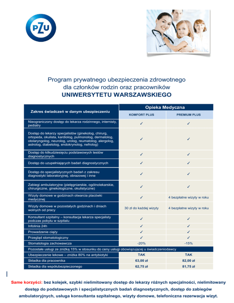 Program prywatnego ubezpieczenia zdrowotnego dla członków rodzin oraz pracowników UNIWERSYTETU WARSZAWSKIEGO Opieka Medyczna Zakres świadczeń w danym ubezpieczeniu KOMFORT PLUS PREMIUM PLUS Nieograniczony dostęp do lekarza rodzinnego, internisty, pediatry ✓ ✓ Dostęp do lekarzy specjalistów (ginekolog, chirurg, ortopeda, okulista, kardiolog, pulmonolog, dermatolog, otolaryngolog, neurolog, urolog, reumatolog, alergolog, astrolog, diabetolog, endokrynolog, nefrolog) ✓ ✓ Dostęp do kilkudziesięciu podstawowych testów diagnostycznych ✓ ✓ Dostęp do uzupełniających badań diagnostycznych ✓ ✓ Dostęp do specjalistycznych badań z zakresu diagnostyki laboratoryjnej, obrazowej i inne ✓ ✓ Zabiegi ambulatoryjne (pielęgniarskie, ogólnolekarskie, chirurgiczne, ginekologiczne, okulistyczne) ✓ ✓ Wizyty domowe w godzinach otwarcia placówki medycznej ✓ 4 bezpłatne wizyty w roku 30 zł do każdej wizyty 4 bezpłatne wizyty w roku Konsultant szpitalny – konsultacja lekarza specjalisty podczas pobytu w szpitalu ✓ ✓ Infolinia 24h ✓ ✓ Prowadzenie ciąży ✓ ✓ Przegląd stomatologiczny ✓ ✓ -20% -15% Wizyty domowe w pozostałych godzinach i dniach wolnych od pracy Stomatologia zachowawcza Pozostałe usługi ze zniżką 15% w stosunku do ceny usługi obowiązującej u świadczeniodawcy Ubezpieczenie lekowe – zniżka 80% na antybiotyki TAK TAK Składka dla pracownika 63,00 zł 82,00 zł Składka dla współubezpieczonego 62,75 zł 81,75 zł Medycyna Rodzinna Lux-Med Same korzyści: bez kolejek, szybki nielimitowany dostęp do lekarzy różnych specjalności, nielimitowany dostęp do podstawowych i specjalistycznych badań diagnostycznych, dostęp do zabiegów ambulatoryjnych, usługa konsultanta szpitalnego, wizyty domowe, telefoniczna rezerwacja wizyt. Pakiet Komfort Plus Pakiet Premium Plus Gdańsk ul. Pomorska 96 Bydgoszcz ul. Chołoniewskiego 46 Gdynia ul. Porębskiego 9 Gdańsk al. Zwycięstwa 49 Gorzów Wlkp. ul. Piłsudskiego 1b Gdańsk ul. Jana Pawła II 7 Katowice ul. Bogucicka 14 Gdynia ul. Morska 127 Katowice ul. Karłowicza 11/13 Katowice ul. Sokolska 29, V pietro Kraków ul. Frycza Modrzewskiego 2 Kraków ul. Wadowicka 6 Łódź ul. Milionowa 21 Kraków ul. Mehoffera 10 Nowy Sącz ul. Długosza 45 Kraków ul. Słowackiego 64 Opole ul. Emila Fieldorfa 2 Kraków ul. Lublańska 38 Piaseczno ul. Powstańców Warszawy 29 Łódź ul. Milionowa 2 G Piotrków Tryb. ul. Wojska Polskiego 77 Łódź ul. Dowborczyków 30/34 Skierniewice ul. Reymonta 16 Olsztyn ul. Głowackiego 28 Skierniewice ul. Orkana 6e Poznań ul. Roosevelta 18 Sosnowiec ul. Kaliska 41 Poznań ul. Wichrowa 1A Szczecin ul. Odzieżowa 12a Poznań ul. Półwiejska 42 Szczecin ul. Mickiewicza 128a Warszawa ul. Racławicka 132B Tychy ul. Damrota 47a Warszawa ul. Puławska 15 Warszawa ul. Belgradzka 18 Warszawa ul. Szernera 3 Warszawa ul. Wrzeciono 10c Warszawa ul. Chmielna 85/87 Warszawa ul. Grójecka 186 Warszawa ul. Postępu 21C Warszawa ul. Żwirki i Wigury 39 Warszawa Al. Stanów Zjednoczonych 72 Warszawa ul. Myśliborska 95 Warszawa Al. Jerozolimskie 162 Warszawa ul. Wrocławska 7a Warszawa Al. KEN 93 Warszawa ul. Migdałowa 4 Warszawa Al. Jerozolimskie 65/79 Warszawa ul. Domaniewska 41a Warszawa ul. Wołoska 7 Warszawa ul. Bobrowiecka 1 Warszawa ul. 17 stycznia 49 Warszawa ul. Jana Pawła II 78 Wrocław ul. Legnicka 51/53 Wrocław ul. Wołowska 20 Rejestracja wizyt (22) 33 22 885 Wrocław ul. Szewska 3A Wrocław Rejestracja wizyt Pl. Dominikański 3 (22) 33 22 888 Gdzie realizujemy świadczenia zdrowotne? W zależności od wybranego pakietu w placówkach wymienionych powyżej. Jak umawiamy się na wizyty? Na wizyty w placówkach świadczeniodawcy umawiamy się, dzwoniąc na dedykowaną klientom PZU infolinię wybranego świadczeniodawcy. Na konsultację do lekarzy specjalistów klienci umawiają się bezpośrednio bez skierowania od lekarza pierwszego kontaktu. Badania laboratoryjne i diagnostyczne są realizowane na podstawie skierowania od lekarza świadczeniodawcy. Kto może przystąpić do ubezpieczenia? Grupowym ubezpieczeniem Opieka Medyczna S może zostać objęty pracownik Uniwersytetu Warszawskiego, który w dniu złożenia deklaracji nie ukończył 75 roku życia. Do ubezpieczenia mogą przystępować współmałżonkowie, partnerzy życiowi (konkubenci), rodzice oraz dzieci pracowników jako osoby współubezpieczone. Osoby współubezpieczone mogą przystępować do ubezpieczenia do ukończenia 70 roku życia. Dodatkowych informacji udzielają Państwu Marzena Górska tel. 55 20 840 Biuro Spraw Pracowniczych ul. Krakowskie Przedmieście 26/28 Pałac Kazimierzowski, parter, pok. 1 Dorota Wiśniewska tel. 55 31 639 Sylwia Chrostek tel. 55 31 641 Dział Gospodarki Materiałowej ul. Żwirki i Wigury 93, Gmach Wydziału Geologii, pok. 155
