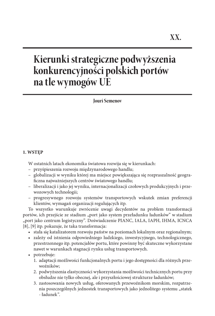 XX. Kierunki strategiczne podwyższenia konkurencyjności polskich portów na tle wymogów UE Jouri Semenov 1. WSTĘP W ostatnich latach ekonomika światowa rozwija się w kierunkach: – przyśpieszenia rozwoju międzynarodowego handlu; – globalizacji w wyniku której ma miejsce powiększająca się rozpraszalność geograficzna najważniejszych centrów światowego handlu; – liberalizacji i jako jej wyniku, internacjonalizacji czołowych produkcyjnych i przewozowych technologii; – progresywnego rozwoju systemów transportowych wskutek zmian preferencji klientów, wymagań organizacji regulujących itp. To wszystko warunkuje zwrócenie uwagi decydentów na problem transformacji portów, ich przejście ze stadium „port jako system przeładunku ładunków” w stadium „port jako centrum logistyczny”. Doświadczenie PIANC, IALA, IAPH, IHMA, ICNCA [8], [9] itp. pokazuje, że taka transformacja: • stała się katalizatorem rozwoju państw na poziomach lokalnym oraz regionalnym; • zależy od istnienia odpowiedniego ludzkiego, inwestycyjnego, technologicznego, przestrzennego itp. potencjałów portu, które powinny być skuteczne wykorzystane nawet w warunkach stagnacji rynku usług transportowych. • potrzebuje: 1. adaptacji możliwości funkcjonalnych portu i jego dostępności dla różnych przewoźników; 2. podwyższenia elastyczności wykorzystania możliwości technicznych portu przy obsłudze nie tylko obecnej, ale i przyszłościowej strukturze ładunków; 3. zastosowania nowych usług, oferowanych przewoźnikom morskim, rozpatrzenia poszczególnych jednostek transportowych jako jednolitego systemu „statek - ładunek”. 2 Konkurencyjność polskich portów morskich w świetle integracji z Unią Europejską 4. uwzględnienia skutków negatywnych towarzyszących obsłudze przewoźników, w tym: – wydłużenia limitu czasowego dla załatwienia formalności biurokratycznych, przeciwdziałać któremu można za pomocą np. wdrożenia w praktykę działalności portów systemu EDI (Electronic Data Interchange); – zwiększającego się wpływu na ekologią portu na skutek różnorodności zanieczyszczeń wprowadzanych w ich przestrzeń w wyniku przejścia na koncepcję multimodalnych systemów transportowych; – obniżce bezpieczeństwa funkcjonalnego portu podczas reform transformacyjnych. • określa się stopniem osiągnięcia następującego celu: „ciągłej racjonalizacji obsługi przewoźników w ramach potrzebnej objętości i typów ładunków, transportowanych na potrzebną odległość, w odpowiednim czasie, z/na odpowiednie miejsce.” U podstaw regulacji procesów transformacji portów UE leży siedem zasad [7], [10]: Zasada 1. Maksymalnej elastyczności struktury usług ofiarowanych przewoźnikom morskim. Zasada 2. Kompleksowej obsługi kluczowych strumieni ładunkowych. Zasada 3. Strukturyzacji inwestycji wg priorytetowych kierunków finansowania. Zasada 4. Maksymalnego wykorzystania zdolności przepustowej portów z uwzględnieniem polityki kooperacyjnej za pomocą rozbudowy sieci połączeń kolejowych, drogowych itp. Zasada 5. Wszechstronnej minimalizacji straty czasu. Zasada 6. Ciągłego podwyższenia profesjonalizmu personelu portu. Zasada 7. Bezwzględnego przestrzegania wymogów bezpiecznego funkcjonowania portu. 2. RYS HISTORYCZNY Według opinii autora, światowa historia rozwoju portów obejmuje cztery generacji. 2.1. Pierwsza generacja. Porty jako centra handlowe / PMC - Ports as Market Center Historia rozwoju portów liczy ponad 4500 lat. Pierwsze porty zaczęli budować Sumerowie w Mezopotamii. Porty te przedstawiały sobą liczne punkty, które były powiązane pomiędzy sobą kanałami irygacyjnymi. Zazwyczaj, takie punkty, mieściły się w pobliżu centrum miast sumeryjskich. Dla cumowania łodzi porty wyposażone były w liczne przystanie, na których odbywał się handel przywożonymi towarami. Dlatego w języku sumerskim „port” i „rynek” były oznaczone jednym słowem1. Porty pierwszej generacji, przedstawiały sobą całokształt budowli cumowniczych. Istniały do początku rewolucji przemysłowej wieku XVIII. Zadanie podstawowe PMC – służyć jako miejsc dostawy oraz handlu towarami. Cechy PMC: nieregularność i sezonowość wykorzystania, zależność od warunków meteorologicznych, orientacja na oferowanie przewoźnikom wyłączne usług cumowniczych. 1 „karum” (akkad.) – rynek, port. Kierunki strategiczne podwyższenia konkurencyjności polskich portów na tle wymogów UE 3 2.2. Druga generacja. Porty jako punkty połączenia transportu morskiego oraz lądowego / PPC - Ports as Points of Connection sea and land transport Doskonalenie PPC trwało prawie dwieście lat od połowy wieku XVIII do połowy stulecia XX. Porty tej generacji zostały stworzone jako punkty połączenia transportu morskiego i lądowego. Realizacja tej koncepcji potrzebowała stworzenia infrastruktury brzegowej, w tym torów podjazdowych. PPC wyposażone były w magazyny oraz urządzenia przeładunkowe. Zadanie podstawowe PPC - połączenie transportu morskiego oraz lądowego. Cechy PPC: orientacja na regularną komunikację żeglugową; współzależność funkcjonowania transportu morskiego i kolejowego (późnej samochodowego); oferowanie przewoźnikom usług cumowniczych, przeładunkowych oraz magazynowych; budowa struktur hydrotechnicznych; brak współpracy międzyportowej oraz prawie nieograniczona kontrola ze strony państwowych instytucji regulujących. Zasada podstawowa - „price taking”. Na początku XXI wieku do portów drugiej generacji generalne mogą być zaliczone małe porty lokalne, które są orientowane na obsługę statków przybrzeżnych, kabotażowców itp.. Do gronu PPC zaliczamy porty Darłowa (0.013 mln t/2002), Elbląga (0.046 mln t/2002), Kołobrzegu (0.136 mln t/2002), Ustki (0.009 mln t/2002). 2.3. Trzecia generacja. Porty jako centra industrialne / PIC - Ports as the Industrial Centers Kształtowanie PIC