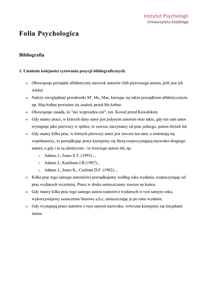 Instytut Psychologii Uniwersytetu Łódzkiego Folia Psychologica Bibliografia 1. Ustalenie kolejności cytowania pozycji bibliograficznych. • Obowiązuje porządek alfabetyczny nazwisk autorów (lub pierwszego autora, jeśli jest ich wielu). • Należy uwzględniać przedrostki M', Mc, Mac, kierując się także porządkiem alfabetycznym, np. MacArthur powinien się znaleść przed McArthur. • Obowiązuje zasada, że "nic wyprzedza coś", tzn. Kowal przed Kowalskim. • Gdy mamy prace, w których dany autor jest jedynym autorem oraz takie, gdy ten sam autor występuje jako pierwszy w spółce, to zawsze zaczynamy od prac jednego, potem dwóch itd. • Gdy mamy kilka prac, w których pierwszy autor jest zawsze ten sam, a zmieniają się współautorzy, to porządkując prace kierujemy się literą rozpoczynającą nazwisko drugiego autora, a gdy i te są identyczne - to trzeciego autora itd, np. • o Adams J., Jones S.T. (1993).... o Adams J., Kaufman J.R.(1987)... o Adams J., Jones K., Cochran D.F. (1982).... Kilka prac tego samego autora(ów) porządkujemy według roku wydania, rozpoczynając od prac wydanych wcześniej. Prace w druku umieszczamy zawsze na końcu. • Gdy mamy kilka prac tego samego autora (autorów) wydanych w tym samym roku, wykorzystujemy oznaczenia literowe a,b,c, umieszczając je po roku wydania. • Gdy występują prace autorów o tym samym nazwisku, wówczas kierujemy się inicjałami imion. 2. Sposób cytowania całej książki. Kępiński A. (1989). Poznanie chorego. Warszawa: PZWL. Uwagi: • Dajemy nazwiska i wszystkie inicjały imion każdego autora; uwzględniamy wszystkich autorów bez względu na ich liczbę. • Stawiamy kropki po inicjałach imion oraz przecinki oddzielające autorów. • Po nazwiskach autorów podajemy w nawiasie rok wydania (lub formułę "w druku"), a następnie kropkę. • Po podaniu tytułu pisanego kursywą, stawiamy kropkę, a następnie zamieszczamy miejsce wydania oraz stawiamy dwukropek i wpisujemy nazwę wydawnictwa. Całość kończymy kropką. • Jeśli książka nie ma autora ani redaktora, wówczas zaczynamy od tytułu. • Jeśli odwołujemy się do książki, która jest zbiorem artykułów, wówczas redaktora(ów) traktuje się jako autora(ów), dając ich nazwiska na początek, ale należy wtedy po nazwisku(ach) otworzyć nawias, wpisać (red.), po czym dać kropkę i wtedy dopiero wpisać w nawiasie rok wydania. 3. Sposób cytowania artykułu z czasopisma. Schwartz B. (1992). Powstanie i upadek wartości. Nowiny Psychologiczne, 2, 5-24. Uwagi: • Tytuł artykułu zaczynamy dużą literą, po tytule stawiamy kropkę. • Następnie podajemy pełny tytuł czasopisma pisanego kursywą, natomiast nie używamy cudzysłowu; dajemy przecinek między tytułem czasopisma, numerem tomu, początkową i końcową stroną artykułu. Całość kończymy kropką. 4. Cytowanie rozdziału pochodzącego z książki i innych materiałów. Hartley J.T., Harker J.D. (1980). Contemporary issues... . W: L.W. Roon (red.), Aging in 1980s: Psychological issues (vol.4,s.239-252).Washington, OC:American Psychological Association. Wyśmienita A. (1995). Samopoczucie studentów psychologii podczas pisania pracy magisterskiej. Nie opublikowana praca magisterska,Uniwersytet Łódzki, Łódź. Uwagi: • Po tytule stawiamy kropkę, następnie dużą literę W i dwukropek, a następnie dane dotyczące redaktora(ów), rozpoczynając od inicjału(ów) imienia, potem nazwisko. • Podajemy nazwiska wszystkich redaktorów, potem w nawiasie piszemy (red.), następnie przecinek i kursywą tytuł książki. • Strony, na których znajduje się cytowany tekst umieszczamy w nawiasie, następnie podajemy miejsce wydania, dwukropek oraz wydawcę. • W przypadku cytowania artykułu z czasopisma, strony podajemy bez nawiasu, zaś tytuł czasopisma piszemy kursywą. W przypadku prac nie opublikowanych tytuł pracy piszemy kursywą. • Gdy wydawnictwo ma charakter seryjny - zbiór artykułów traktujemy wtedy jak czasopismo. Strony, na których znajduje się cytowana praca, podajemy więc bez nawiasu. • Jeśli materiały konferencyjne wydane sa w formie zbioru posiadającego redaktora, wówczas cytujemy dany referat tak, jak artykuł ze zbioru. W tym przypadku strony podajemy w nawiasie, a przed nimi stawiamy skrót s. Uwaga Nie numerujemy wykazu pozycji piśmiennictwa.