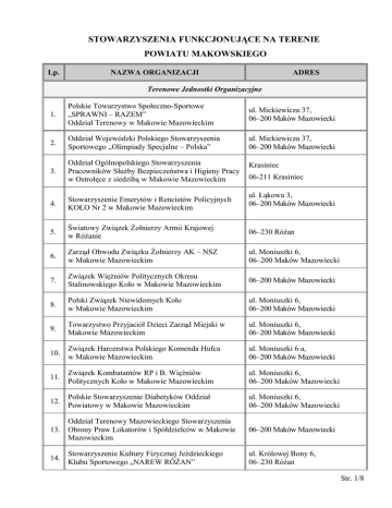 STOWARZYSZENIA FUNKCJONUJĄCE NA TERENIE POWIATU MAKOWSKIEGO Lp. NAZWA ORGANIZACJI ADRES Terenowe Jednostki Organizacyjne 1. Polskie Towarzystwo Społeczno-Sportowe „SPRAWNI – RAZEM” Oddział Terenowy w Makowie Mazowieckim ul. Mickiewicza 37, 06–200 Maków Mazowiecki 2. Oddział Wojewódzki Polskiego Stowarzyszenia Sportowego „Olimpiady Specjalne – Polska” ul. Mickiewicza 37, 06–200 Maków Mazowiecki 3. Oddział Ogólnopolskiego Stowarzyszenia Pracowników Służby Bezpieczeństwa i Higieny Pracy w Ostrołęce z siedzibą w Makowie Mazowieckim Krasiniec 4. Stowarzyszenie Emerytów i Rencistów Policyjnych KOŁO Nr 2 w Makowie Mazowieckim 5. Światowy Związek Żołnierzy Armii Krajowej w Różanie 06–230 Różan 6. Zarząd Obwodu Związku Żołnierzy AK – NSZ w Makowie Mazowieckim ul. Moniuszki 6, 06–200 Maków Mazowiecki 7. Związek Więźniów Politycznych Okresu Stalinowskiego Koło w Makowie Mazowieckim 06–200 Maków Mazowiecki 8. Polski Związek Niewidomych Koło w Makowie Mazowieckim ul. Moniuszki 6, 06–200 Maków Mazowiecki 9. Towarzystwo Przyjaciół Dzieci Zarząd Miejski w Makowie Mazowieckim ul. Moniuszki 6, 06–200 Maków Mazowiecki 10. Związek Harcerstwa Polskiego Komenda Hufca w Makowie Mazowieckim ul. Moniuszki 6 a, 06–200 Maków Mazowiecki 11. Związek Kombatantów RP i B. Więźniów Politycznych Koło w Makowie Mazowieckim ul. Moniuszki 6, 06–200 Maków Mazowiecki 12. Polskie Stowarzyszenie Diabetyków Oddział Powiatowy w Makowie Mazowieckim ul. Moniuszki 6, 06–200 Maków Mazowiecki Oddział Terenowy Mazowieckiego Stowarzyszenia 13. Obrony Praw Lokatorów i Spółdzielców w Makowie Mazowieckim 14. Stowarzyszenie Kultury Fizycznej Jeździeckiego Klubu Sportowego „NAREW RÓŻAN” 06-211 Krasiniec ul. Łąkowa 3, 06–200 Maków Mazowiecki 06–200 Maków Mazowiecki ul. Królowej Bony 6, 06–230 Różan Str. 1/8 Lp. NAZWA ORGANIZACJI ADRES 15. Powiatowe Zrzeszenie Ludowe Zespoły Sportowe ul. Rynek 1, 06–200 Maków Mazowiecki Rada Kultury Fizycznej, Sportu i Turystyki Powiatu Makowskiego ul. Rynek 1, 06–200 Maków Mazowiecki 16. 17. Towarzystwo Miłośników Ziemi Makowskiej ul. Moniuszki 6, 06–200 Maków Mazowiecki 18. Stowarzyszenie Rozwoju Lokalnego „ZIEMIA MAKOWSKA” ul. Moniuszki 6, 06–200 Maków Mazowiecki 19. Stowarzyszenie Trzeźwości „MAZOWSZE” w Makowie Mazowieckim ul. Moniuszki 6, 06–200 Maków Mazowiecki 20. Różański Klub Fantastyki „NOSTROMO” 06–230 Różan 21. Powiatowy Szkolny Związek Sportowy w Makowie Mazowieckim ul. Rynek 1, 06–200 Maków Mazowiecki 22. Stowarzyszenie Rodów Chodkowskich w Chodkowie Wielkim ul. Kościelna 26 06–316 Krzynowłoga Mała, 23. Stowarzyszenie Rozwoju Gmin Ziemi Makowskiej w Makowie Mazowieckim ul. Kilińskiego 14, 06–200 Maków Mazowiecki 24. Mazowieckie Centrum Przedsiębiorczości ul. Kościelna 13, 06–216 Sypniewo Stowarzyszenie Ekorozwoju – Rozwoju Wsi: 25. Krzyżewo – Marki, Krzyżewo –Borowe, Krzyżewo – Jurki, Cieciórki, Kałęczyn, Zacisze Krzyżewo Marki 06–232 Czerwonka 26. Stowarzyszenie Rozwoju Wsi Budzyno –Wal., Budzyno-Bolki, Obiecanowo Budzyno Wal. 06–200 Maków Mazowiecki 27. Stowarzyszenie Zrównoważonego Rozwoju Wsi Zelki Dąbrowe i Okolicy Zelki Dąbrowe , 06–425 Karniewo 28. Stowarzyszenie Rozwoju Wsi Guty Duże, Guty Małe Guty Duże 42 06–232 Czerwonka 29. Towarzystwo Przyjaciół Ziemi Krasnosielckiej ul. Rynek 39 A, 06–212 Krasnosielc 30. Stowarzyszenie NASZA SZKOŁA Publiczne Gimnazjum ul. Szkolna 9B, 06–425 Karniewo 31. Polskie Towarzystwo Rolników Ekologicznych BOŻY ZAGON Str. 2/8 Chrzczonki 15, 02–230 Różan Lp. NAZWA ORGANIZACJI ADRES Stowarzyszenie na rzecz rozbudowy i modernizacji Samodzielnego Publicznego Zakładu Opieki Zdrowotnej Zespołu Zakładów Lecznictwa Otwartego i Zamkniętego 32. w Makowie Mazowieckim oraz odnoszenia wiedzy personelu medycznego i prowadzenia działalności profilaktycznej w zakresie narkomanii i innych uzależnień ul. Witosa 2, 06–200 Maków Mazowiecki 33. Stowarzyszenie Wspierania Rozwoju Lokalnego Węgrzynowo 151, 06–211 Płoniawy – Bramura Stowarzyszenie Pomocy Liceum im. Marii Curie Skłodowskiej w Makowie Mazowieckim ul. Kopernika 6, 06–200 Maków Mazowiecki 34. 35. Makowskie Stowarzyszenie Rowerzystów i Kolarzy ul. Ciechanowska 5/15 06–200 Maków Mazowiecki 36. Stowarzyszenie Rozwoju Doliny Dolnej Narwi Strzemieczne–Hieronimy 4 06–231 Młynarze 37. Stowarzyszenie „Radość Rozwoju” ul. Mickiewicza 39a 06–200 Maków Mazowiecki 38. Stowarzyszenie Opiekunów Osób Niepełnosprawnych – CAFE MAMA – KLUB ul. Mickiewicza 15 06–230 Różan 39. Parafialne Stowarzyszenie Społeczno- Kulturalne BĄDŹMY RAZEM Amelin 37 06–212 Krasnosielc 40. Stowarzyszenie na Rzecz Aktywizacji Środowisk Lokalnych NASZA SZANSA ul. Mickiewicza 17 06–00 Maków Mazowiecki 41. Stowarzyszenie Małe Księstwo Makowskie ul. Brzozowa 2/2 06–200 Maków Mazowiecki 42. Stowarzyszenie Amazonki w Makowie Mazowieckim ul. Witosa 2 06–200 Maków Mazowiecki 43. Stowarzyszenie Przyjaciół ZSP KARNIEWIACZEK ul. Szkolna 9 06–425 Karniewo 44. Stowarzyszenie Miłośników Ziemi Różańskiej ul. Ostrowska 10 06–230 Różan 45. Klub Integracji Społecznej ul. 1-go Maja 9/52 06–200 Maków Mazowiecki Guty Duże 18 46. Koło Gospodyń Wiejskich – Guty Duże 06-232 Czerwonka Str. 3/8 Lp. NAZWA ORGANIZACJI 47. Stowarzyszenie Aktywnych Pań w Załuziu Załuzie 88 06-230 Różan Rzewnie 14 48. Czas Rzewnia 49. ADRES 06-225 Rzewnie Stowarzyszenie na Rzecz Rozwoju Zespołu Szkół im. Żołnierzy Armii Krajowej w Makowie Mazowieckim ul. Mickiewicza 39a 06-200 Maków Mazowiecki FUNDACJE 50. Fundacja „O uśmiech dziecka” ul. Mickiewicza 37, 06–200 Maków Mazowiecki 51. Fundacja Xymeny Zaniewskiej „Sztuka Polska” Kaszewiec 75, 06–230 Różan 52. Fundacja „Kocham Maków” ul. Kopernika 11/35 06-200 Maków Mazowiecki OCHOTNICZE SRAŻE POŻARNE 53. Ochotnicza Straż