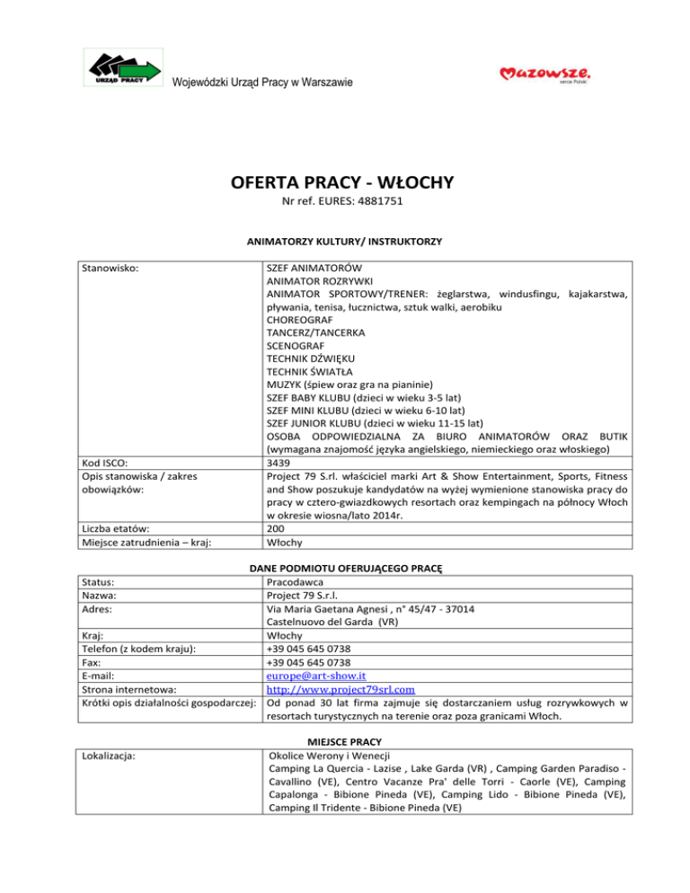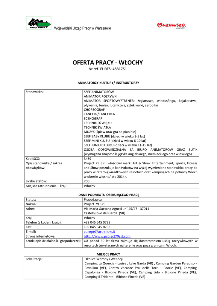Wojewódzki Urząd Pracy w Warszawie OFERTA PRACY - WŁOCHY Nr ref. EURES: 4881751 ANIMATORZY KULTURY/ INSTRUKTORZY Stanowisko: Kod ISCO: Opis stanowiska / zakres obowiązków: Liczba etatów: Miejsce zatrudnienia – kraj: SZEF ANIMATORÓW ANIMATOR ROZRYWKI ANIMATOR SPORTOWY/TRENER: żeglarstwa, windusfingu, kajakarstwa, pływania, tenisa, łucznictwa, sztuk walki, aerobiku CHOREOGRAF TANCERZ/TANCERKA SCENOGRAF TECHNIK DŹWIĘKU TECHNIK ŚWIATŁA MUZYK (śpiew oraz gra na pianinie) SZEF BABY KLUBU (dzieci w wieku 3-5 lat) SZEF MINI KLUBU (dzieci w wieku 6-10 lat) SZEF JUNIOR KLUBU (dzieci w wieku 11-15 lat) OSOBA ODPOWIEDZIALNA ZA BIURO ANIMATORÓW ORAZ BUTIK (wymagana znajomość języka angielskiego, niemieckiego oraz włoskiego) 3439 Project 79 S.rl. właściciel marki Art & Show Entertainment, Sports, Fitness and Show poszukuje kandydatów na wyżej wymienione stanowiska pracy do pracy w cztero-gwiazdkowych resortach oraz kempingach na północy Włoch w okresie wiosna/lato 2014r. 200 Włochy DANE PODMIOTU OFERUJĄCEGO PRACĘ Status: Pracodawca Nazwa: Project 79 S.r.l. Adres: Via Maria Gaetana Agnesi , n° 45/47 - 37014 Castelnuovo del Garda (VR) Kraj: Włochy Telefon (z kodem kraju): +39 045 645 0738 Fax: +39 045 645 0738 E-mail: [email protected] Strona internetowa: http://www.project79srl.com Krótki opis działalności gospodarczej: Od ponad 30 lat firma zajmuje się dostarczaniem usług rozrywkowych w resortach turystycznych na terenie oraz poza granicami Włoch. Lokalizacja: MIEJSCE PRACY Okolice Werony i Wenecji Camping La Quercia - Lazise , Lake Garda (VR) , Camping Garden Paradiso Cavallino (VE), Centro Vacanze Pra' delle Torri - Caorle (VE), Camping Capalonga - Bibione Pineda (VE), Camping Lido - Bibione Pineda (VE), Camping Il Tridente - Bibione Pineda (VE) Wykształcenie: Doświadczenie zawodowe: Znajomość języków: Inne istotne wymagania: WYMAGANIA Nie określono Min. 2 miesiące Język 1. Niemiecki PLUS 2. Angielski LUB 3. Włoski Poziom 1. Dobry 2. Dobry 3. Dobry Odporność na stres. Umiejętność nawiązywania kontaktów z osobami w różnym wieku. Znajomość wszystkich trzech wymienionych języków obcych będzie dodatkowym atutem. OSOBA ODPOWIEDZIALNA ZA BIURO ANIMATORÓW ORAZ BUTIK (wymagana znajomość języka angielskiego, niemieckiego oraz włoskiego). WYNAGRODZENIE I WARUNKI ZATRUDNIENIA Wynagrodzenie od 600 – 1500 euro netto (ok. 780 - 1950 euro brutto) miesięcznie w zależności od stanowiska i doświadczenia. Waluta, w jakiej wypłacana jest Euro pensja: Rodzaj stawki wynagrodzenia: miesięczna Dodatkowe świadczenia: Zakwaterowanie, 3 posiłki dziennie, zwrot kosztów podróży do kwoty maksymalnej 100 €, ubezpieczenie. Rodzaj umowy: Umowa na czas określony Wymiar czasu pracy: Pełny etat, praca zmianowa i w dni wolne Czas trwania umowy: Min. 7 tygodni (w okresie Lipiec/Sierpień), maks. 6 miesięcy (w okresie od Kwietnia do końca Września) Liczba godzin tygodniowo: 40 Data rozpoczęcia: Od Kwietnia 2014 Wysokość pensji brutto: Wymagane dokumenty Język, w którym muszą być sporządzone przedkładane dokumenty: Do kogo należy wysłać dokumenty Gdzie należy wysłać dokumenty: Więcej informacji: SPOSÓB SKŁADANIA WNIOSKU Wypełniony formularz na stronie pracodawcy lub CV wraz ze zdjęciem oraz listem motywacyjnym. Angielski, niemiecki lub włoski Do pracodawcy lub do doradcy EURES z Wojewódzkiego Urzędu Pracy w Warszawie Osoby zainteresowane powinny wypełnić formularz aplikacyjny dostępny na stronie pracodawcy oraz załączyć swoje zdjęcie: www.art-show.it lub przesłać swoje CV wraz ze zdjęciem do doradcy EURES na adres e-mail: [email protected] (tel. 22 532 22 35). Więcej informacji można uzyskać bezpośrednio u pracodawcy: e-mail: [email protected] Tel.: +39 045 645073 Rozmowy rekrutacyjne z pracodawcą odbędą się za pośrednictwem internetowego komunikatora SKYPE. Data publikacji: Termin przedkładania podań o pracę / zakończenia ważności oferty: WAŻNOŚĆ 5.12.2012r. Do odwołania Uprzejmie informujemy, że skontaktujemy się wyłącznie z wybranymi kandydatami. 1. 2. 3. UWAGA: Umowa z zagranicznym pracodawcą zostanie zawarta zgodnie z prawem kraju zatrudnienia. Oznacza to, że wszystkie roszczenia odnośnie do warunków, które obejmuje umowa, można kierować wyłącznie do odpowiedniego sądu w kraju zatrudnienia. Publiczne służby zatrudnienia (EURES) nie mogą pośredniczyć ani reprezentować pracownika w sądzie kraju zatrudnienia w przypadku sporu z pracodawcą. Publiczne służby zatrudnienia (EURES) dokładają wszelkich starań, aby zapewnić rzetelność i wiarygodność ofert pracy zgłoszonych w lokalnym urzędzie pracy. Należy wyjaśnić, że oferta pracy została zgłoszona przez stronę trzecią i EURES nie odpowiada za ewentualne rozbieżności między warunkami pracy określonymi w ofercie pracy i warunkami oferowanymi przez potencjalnego pracodawcę. Publiczne służby zatrudnienia (EURES) informują, że będą zbierać, przetwarzać i przekazywać potencjalnym pracodawcom zgodnie z przepisami dotyczącymi ochrony danych osobowych wszystkie dane osobowe dostarczone przez osoby poszukujące pracy.