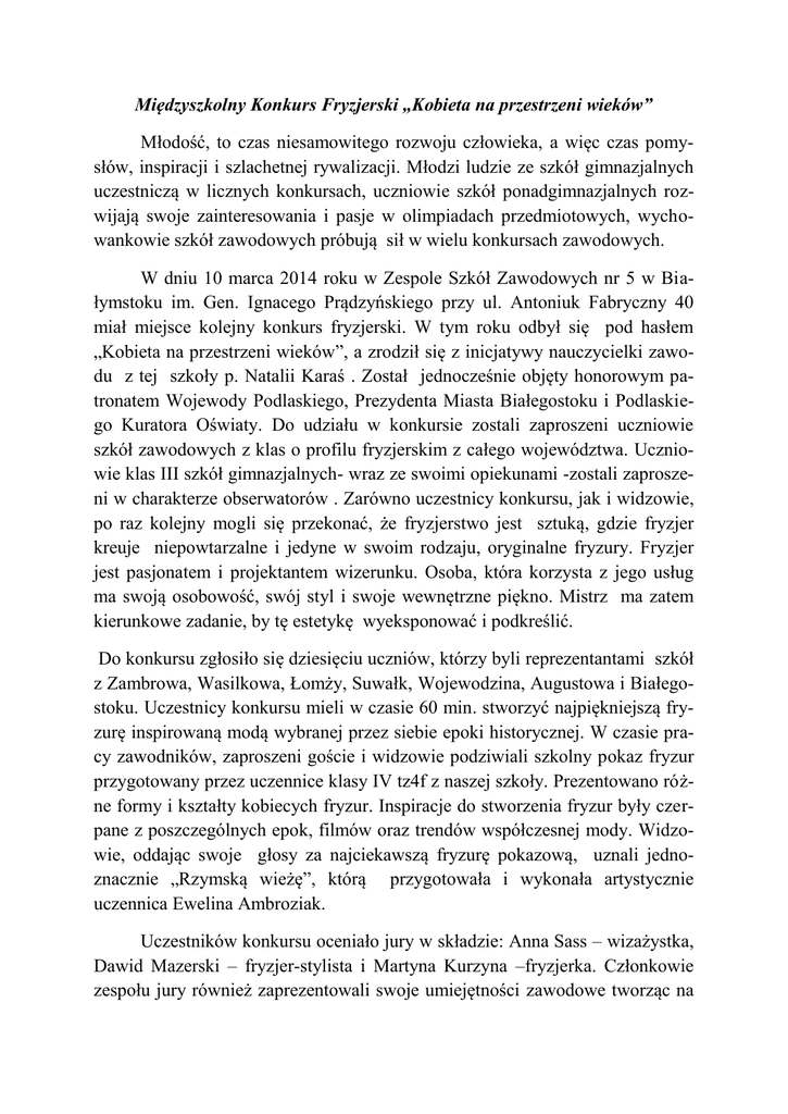 Międzyszkolny Konkurs Fryzjerski „Kobieta na przestrzeni wieków” Młodość, to czas niesamowitego rozwoju człowieka, a więc czas pomysłów, inspiracji i szlachetnej rywalizacji. Młodzi ludzie ze szkół gimnazjalnych uczestniczą w licznych konkursach, uczniowie szkół ponadgimnazjalnych rozwijają swoje zainteresowania i pasje w olimpiadach przedmiotowych, wychowankowie szkół zawodowych próbują sił w wielu konkursach zawodowych. W dniu 10 marca 2014 roku w Zespole Szkół Zawodowych nr 5 w Białymstoku im. Gen. Ignacego Prądzyńskiego przy ul. Antoniuk Fabryczny 40 miał miejsce kolejny konkurs fryzjerski. W tym roku odbył się pod hasłem „Kobieta na przestrzeni wieków”, a zrodził się z inicjatywy nauczycielki zawodu z tej szkoły p. Natalii Karaś . Został jednocześnie objęty honorowym patronatem Wojewody Podlaskiego, Prezydenta Miasta Białegostoku i Podlaskiego Kuratora Oświaty. Do udziału w konkursie zostali zaproszeni uczniowie szkół zawodowych z klas o profilu fryzjerskim z całego województwa. Uczniowie klas III szkół gimnazjalnych- wraz ze swoimi opiekunami -zostali zaproszeni w charakterze obserwatorów . Zarówno uczestnicy konkursu, jak i widzowie, po raz kolejny mogli się przekonać, że fryzjerstwo jest sztuką, gdzie fryzjer kreuje niepowtarzalne i jedyne w swoim rodzaju, oryginalne fryzury. Fryzjer jest pasjonatem i projektantem wizerunku. Osoba, która korzysta z jego usług ma swoją osobowość, swój styl i swoje wewnętrzne piękno. Mistrz ma zatem kierunkowe zadanie, by tę estetykę wyeksponować i podkreślić. Do konkursu zgłosiło się dziesięciu uczniów, którzy byli reprezentantami szkół z Zambrowa, Wasilkowa, Łomży, Suwałk, Wojewodzina, Augustowa i Białegostoku. Uczestnicy konkursu mieli w czasie 60 min. stworzyć najpiękniejszą fryzurę inspirowaną modą wybranej przez siebie epoki historycznej. W czasie pracy zawodników, zaproszeni goście i widzowie podziwiali szkolny pokaz fryzur przygotowany przez uczennice klasy IV tz4f z naszej szkoły. Prezentowano różne formy i kształty kobiecych fryzur. Inspiracje do stworzenia fryzur były czerpane z poszczególnych epok, filmów oraz trendów współczesnej mody. Widzowie, oddając swoje głosy za najciekawszą fryzurę pokazową, uznali jednoznacznie „Rzymską wieżę”, którą przygotowała i wykonała artystycznie uczennica Ewelina Ambroziak. Uczestników konkursu oceniało jury w składzie: Anna Sass – wizażystka, Dawid Mazerski – fryzjer-stylista i Martyna Kurzyna –fryzjerka. Członkowie zespołu jury również zaprezentowali swoje umiejętności zawodowe tworząc na pokazie awangardowe stylizacje współczesne. Spośród uczestników konkursu jury wyłoniło następujących zwycięzców: I miejsce – Monika Podborowska z ZSO i T w Białymstoku, II miejsce – Emilia Żaczek ze Szkoły ATENY w Białymstoku i III miejsce – Kamila Kizińska z ZSZ Nr 5 w Białymstoku. Zarówno zwycięzcy, jak i uczestnicy konkursu otrzymali dyplomy i nagrody rzeczoweprofesjonalne artykuły fryzjerskie, które będą mogli wykorzystać w nauce i przyszłej pracy. Nasz konkurs swoją obecnością zaszczycili przedstawiciele Departamentu Edukacji Urzędu Miejskiego w Białymstoku, Cechu Rzemiosł Różnych i Przedsiębiorczości w Białymstoku, Podlaskiego Cechu Rzemiosł Różnych i Przedsiębiorczości w Białymstoku, Komisji Czeladniczej i Mistrzowskiej w zawodzie fryzjer, Zakładu Doskonalenia Zawodowego w Białymstoku. Nagrody przygotowały firmy: „FRYZELA” i „MATRIX”. Przebieg i oprawa konkursu została bardzo entuzjastycznie przyjęta zarówno przez samych uczestników jak i zaproszonych gości, przedstawicieli mediów oraz licznie zgromadzonych uczniów z różnych szkół. To wydarzenie pozostanie z nami na długo i zapewne stanie się inspiracją do kolejnych twórczych wyzwań konkursowych . Przygotowała: Natalia Karaś
