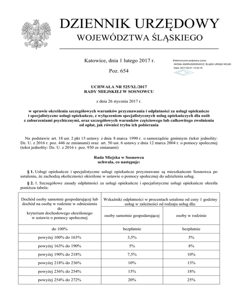 DZIENNIK URZĘDOWY WOJEWÓDZTWA ŚLĄSKIEGO Katowice, dnia 1 lutego 2017 r. Elektronicznie podpisany przez: IWONA ANDRUSZKIEWICZ; ŚLĄSKI URZĄD WOJEWÓDZK Data: 2017-02-01 13:32:15 Poz. 654 UCHWAŁA NR 525/XL/2017 RADY MIEJSKIEJ W SOSNOWCU z dnia 26 stycznia 2017 r. w sprawie określenia szczegółowych warunków przyznawania i odpłatności za usługi opiekuńcze i specjalistyczne usługi opiekuńcze, z wyłączeniem specjalistycznych usług opiekuńczych dla osób z zaburzeniami psychicznymi, oraz szczegółowych warunków częściowego lub całkowitego zwolnienia od opłat, jak również trybu ich pobierania Na podstawie art. 18 ust. 2 pkt 15 ustawy z dnia 8 marca 1990 r. o samorządzie gminnym (tekst jednolity: Dz. U. z 2016 r. poz. 446 ze zmianami) oraz art. 50 ust. 6 ustawy z dnia 12 marca 2004 r. o pomocy społecznej (tekst jednolity: Dz. U. z 2016 r. poz. 930 ze zmianami) Rada Miejska w Sosnowcu uchwala, co następuje: § 1. Usługi opiekuńcze i specjalistyczne usługi opiekuńcze przyznawane są mieszkańcom Sosnowca po ustaleniu, że zachodzą okoliczności określone w ustawie o pomocy społecznej do udzielenia usług. § 2. 1. Szczegółowe zasady odpłatności za usługi opiekuńcze i specjalistyczne usługi opiekuńcze określa poniższa tabela: Dochód osoby samotnie gospodarującej lub dochód na osobę w rodzinie w odniesieniu do kryterium dochodowego określonego w ustawie o pomocy społecznej Wskaźniki odpłatności w procentach ustalone od ceny 1 godziny usług w zależności od rodzaju usług dla: osoby samotnie gospodarującej osoby w rodzinie do 100% bezpłatnie bezpłatnie powyżej 100% do 163% 3,5% 5% powyżej 163% do 190% 5% 8% powyżej 190% do 218% 7,5% 10% powyżej 218% do 236% 10% 13% powyżej 236% do 254% 15% 18% powyżej 254% do 272% 20% 25% Dziennik Urzędowy Województwa Śląskiego –2– Poz. 654 powyżej 272% do 290% 30% 35% powyżej 290% do 326% 45% 50% powyżej 326% do 350% 50% 70% powyżej 350% do 400% 70% 100% powyżej 400% 100% 100% 2. Cena 1 godziny: 1) usług opiekuńczych - o charakterze gospodarczym wynosi 18,40 zł, - o charakterze pielęgnacyjnym wynosi 19,15 zł, 2) specjalistycznych usług opiekuńczych wynosi 25,00 zł. 3. Opłata za usługi opiekuńcze i specjalistyczne usługi opiekuńcze stanowi iloczyn ceny, o której mowa w ust. 2, wskaźnika odpłatności określonego w procentach, o którym mowa w ust. 1 oraz liczby godzin świadczonych usług w ciągu miesiąca. § 3. Częściowo można zwolnić beneficjenta od opłat za usługi opiekuńcze i specjalistyczne usługi opiekuńcze: 1) jeżeli z przeprowadzonej analizy wydatków, uwzględniającej podstawowe potrzeby wynika, że nie jest w stanie ponosić w całości odpłatności za usługi w wysokości ustalonej zgodnie z § 2; 2) ze względu na konieczność korzystania przez więcej niż jedną osobę w rodzinie z usług, w tym co najmniej przez jedną przewlekle chorą. § 4. Całkowicie można zwolnić beneficjenta od opłat za usługi opiekuńcze i specjalistyczne usługi opiekuńcze: 1) jeżeli poniosła straty w wyniku zdarzenia losowego, klęski żywiołowej lub ekologicznej i nie jest w stanie ponosić odpłatności; 2) jeżeli z przeprowadzonej analizy wydatków, uwzględniającej podstawowe potrzeby wynika, że nie jest w stanie ponosić żadnej odpłatności za usługi. § 5. Opłaty za usługi opiekuńcze i specjalistyczne usługi opiekuńcze wnosi się bezpośrednio do kasy lub przelewem na rachunek bankowy Miejskiego Ośrodka Pomocy Społecznej w Sosnowcu do 5 każdego miesiąca następującego po miesiącu, w którym usługi zostały wykonane. § 6. Wykonanie uchwały powierza się Prezydentowi Miasta. § 7. Traci moc uchwała Nr 871/XLIX/06 Rady Miejskiej w Sosnowcu z dnia 23 lutego 2006 roku w sprawie ustalenia warunków przyznawania i odpłatności za usługi opiekuńcze oraz specjalistyczne usługi opiekuńcze, z wyłączeniem specjalistycznych usług opiekuńczych dla osób z zaburzeniami psychicznymi oraz szczegółowych warunków częściowego lub całkowitego zwolnienia od opłat, jak również trybu ich pobierania, ze zmianami. § 8. Uchwała wchodzi w życie po upływie 14 dni od dnia ogłoszenia w Dzienniku Urzędowym Województwa Śląskiego, z mocą obowiązującą od 1 lutego 2017 r. Przewodniczący Rady Miejskiej w Sosnowcu Wilhelm Zych