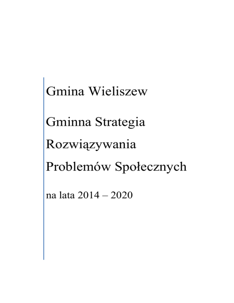 Gmina Wieliszew Gminna Strategia Rozwiązywania Problemów Społecznych na lata 2014 – 2020 Spis treści I. MERYTORYCZNE UZASADNIENIE OPRACOWANIA STRATEGII ROZWIĄZYWANIA PROBLEMÓW SPOŁECZNYCH ..................................................................................................... 4 1. Podstawa prawna Strategii, zgodność z prawem wspólnotowym oraz strategiami narodowymi i europejskimi ................................................................................................................................ 5 1.1 Zgodność z prawem wspólnotowym ....................................................................................... 5 1.2 Zgodność ze strategiami europejskimi .................................................................................... 5 2. Powiązanie strategii z krajowymi aktami prawnymi .................................................................... 7 2.3 Zgodność z dokumentami krajowymi ..................................................................................... 8 2.4 Zgodność z regionalnymi i wojewódzkimi dokumentami strategicznymi .............................. 9 II. PROCES WYPRACOWANIA STRATEGII ................................................................................... 12 1. Przebieg procesu wypracowania Strategii................................................................................... 12 III. CHARAKTERYSTYKA GMINY WIELISZEW ........................................................................... 14 1. Położenie geograficzne ............................................................................................................... 14 2. Historia ........................................................................................................................................ 16 3. Ludność gminy ............................................................................................................................ 20 3.1 Demografia............................................................................................................................ 20 3.2 Mieszkalnictwo ..................................................................................................................... 22 3.3 Warunki życia ....................................................................................................................... 23 4. Gospodarka Gminy ..................................................................................................................... 23 4.1. Rolnictwo ............................................................................................................................. 23 5. Infrastruktura społeczna .............................................................................................................. 23 5. 1 Oświata................................................................................................................................. 23 5.2 Kultura .................................................................................................................................. 27 5.3 Służba zdrowia ...................................................................................................................... 32 5.4. Pomoc społeczna .................................................................................................................. 33 5.5 Policja.................................................................................................................................... 36 5.6 Organizacje społeczne i sport................................................................................................ 37 6. Diagnoza sytuacji społecznej Gminy .......................................................................................... 43 6.1 Analiza problemów społecznych na podstawie danych instytucji ........................................ 43 6.2 Analiza problemów społecznych na podstawie ankiety ........................................................ 51 6.4 Analizy SWOT ...................................................................................................................... 56 6.4.1 Obszar społeczny Gminy Wieliszew ................................................................................ 58 6.4.2 Dzieci i młodzież .............................................................................................................. 60 6.4.3 Rodziny ............................................................................................................................ 61 2 6.4.4 Ludzie starsi..................................................................................................................... 62 7. Planowanie działań....................................................................................................................... 64 7.1 Misja i wizja Gminy Wieliszew ............................................................................................ 64 7.2 Cele strategiczne, operacyjne i zadania ................................................................................ 65 7.3 Harmonogram wdrażania Strategii ....................................................................................... 66 7.4 Harmonogram wdrażania Strategii na lata 2014 - 2024 ........................................................ 73 7.5 Ramy finansowe Strategii ..................................................................................................... 75 7.6 Programy ............................................................................................................................... 76 8. Monitoring i ewaluacja Strategii .................................................................................................. 76 8.1 System monitorowania Strategii ........................................................................................... 76 8.2 Ewaluacja Strategii ...............................................................