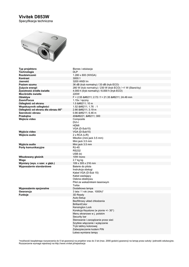 Vivitek D853W Specyfikacja techniczna Typ projektora Technologia Rozdzielczość Kontrast Jasność Poziom szumu Zużycie energii Żywotność źródła światła Moc/źródło światła Obiektyw Zoom/Focus Odległość od ekranu Współczynnik odległości Odległość od ekranu dla obrazu 80" Szerokość obrazu Przekątna Wejścia video Wyjścia video Wejścia audio Wyjścia audio Porty komunikacyjne Wbudowany głośnik Waga Wymiary (wys. x szer. x głęb.) Wyposażenie standardowe Wyposażenie opcjonalne Gwarancja Funkcje Biznes i edukacja DLP 1.280 x 800 (WXGA) 3000:1 3200 ANSI lm 36 dB (tryb normalny) / 33 dB (tryb ECO) 280 W (tryb normalny) / 230 W (tryb ECO) / <1 W (Stand-by) 4.000 h (tryb normalny) / 6.000 h (tryb ECO) 220W F = 2.55 – 2.72 / f = 21.35 – 24.49 mm 1.15x / ręczny 1.5 – 10 m 1.52 – 1.76 : 1 2.66 – 3.19 m 0.86 – 6.46 m 40” – 300 Composite DVI-I HDMI VGA (D-Sub15) VGA (D-Sub15) 2 x RCA (L/R) Mikofon (mini jack 3.5 mm) Mini jack 3.5 mm Mini jack 3.5 mm RJ-45 RS232 USB (b) 10W mono 2.7 kg kg 109 x 305 x 216 mm Baterie do pilota Instrukcja obsługi Kabel VGA (D-Sub 15) Kabel zasilający Osłona obiektywu Pilot ze wskaźnikiem laserowym Torba Dodatkowa lampa 3 lata / 1 rok (max. 1000h)* 3D Ready Auto-Setup Bezfiltrowy układ chłodzenia BrilliantColor Kensington Lock Korekcja Keystone (w pionie +/- 30°) Menu ekranowe w j. polskim Security bar Sterowanie i zarządzanie przez sieć Szybkie włączanie i wyłączanie Tryb tablicy kolorowej Zabezpieczenie kodem PIN Łatwa wymiana lampy *możliwość bezpłatnego rozszerzenia do 5 lat gwarancji na projektor oraz do 3 lat (max. 2000 godzin) gwarancji na lampę przez szkoły i jednostki edukacyjne. Rozszerzenie wymaga rejestracji na http://www.vivitek.pl/rejestracja