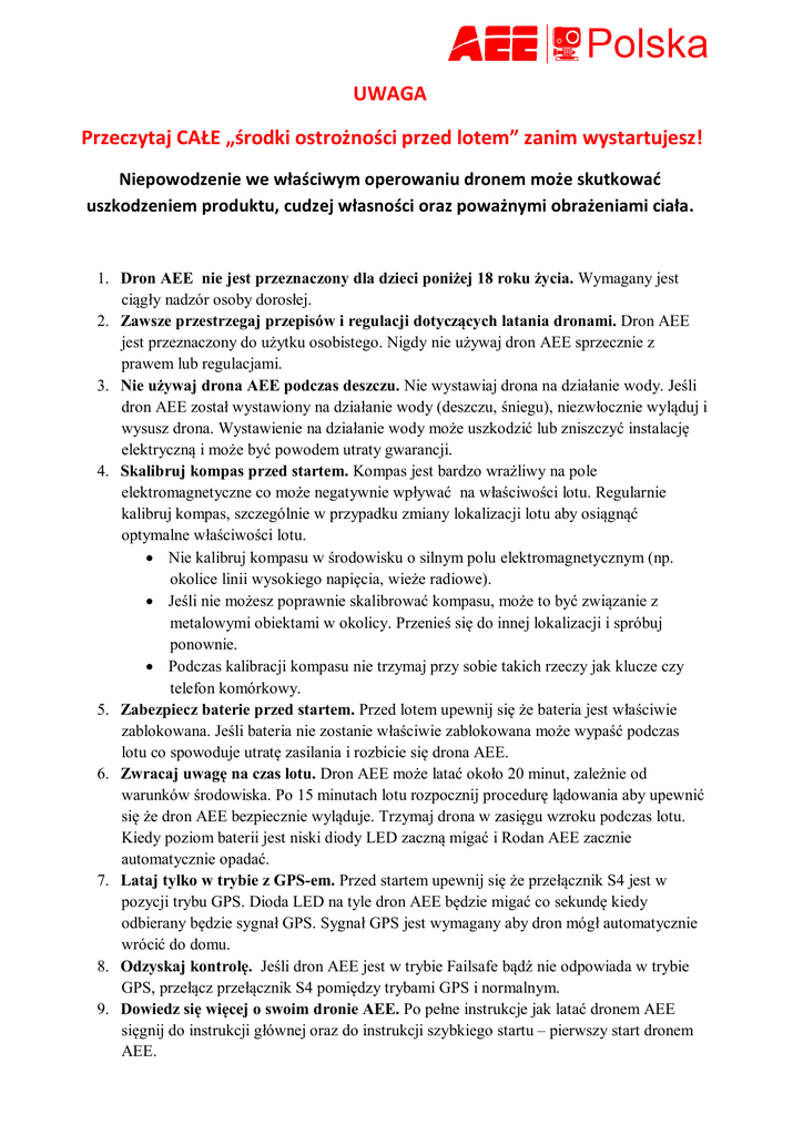 UWAGA Przeczytaj CAŁE „środki ostrożności przed lotem” zanim wystartujesz! Niepowodzenie we właściwym operowaniu dronem może skutkować uszkodzeniem produktu, cudzej własności oraz poważnymi obrażeniami ciała. 1. Dron AEE nie jest przeznaczony dla dzieci poniżej 18 roku życia. Wymagany jest ciągły nadzór osoby dorosłej. 2. Zawsze przestrzegaj przepisów i regulacji dotyczących latania dronami. Dron AEE jest przeznaczony do użytku osobistego. Nigdy nie używaj dron AEE sprzecznie z prawem lub regulacjami. 3. Nie używaj drona AEE podczas deszczu. Nie wystawiaj drona na działanie wody. Jeśli dron AEE został wystawiony na działanie wody (deszczu, śniegu), niezwłocznie wyląduj i wysusz drona. Wystawienie na działanie wody może uszkodzić lub zniszczyć instalację elektryczną i może być powodem utraty gwarancji. 4. Skalibruj kompas przed startem. Kompas jest bardzo wrażliwy na pole elektromagnetyczne co może negatywnie wpływać na właściwości lotu. Regularnie kalibruj kompas, szczególnie w przypadku zmiany lokalizacji lotu aby osiągnąć optymalne właściwości lotu. Nie kalibruj kompasu w środowisku o silnym polu elektromagnetycznym (np. okolice linii wysokiego napięcia, wieże radiowe). Jeśli nie możesz poprawnie skalibrować kompasu, może to być związanie z metalowymi obiektami w okolicy. Przenieś się do innej lokalizacji i spróbuj ponownie. Podczas kalibracji kompasu nie trzymaj przy sobie takich rzeczy jak klucze czy telefon komórkowy. 5. Zabezpiecz baterie przed startem. Przed lotem upewnij się że bateria jest właściwie zablokowana. Jeśli bateria nie zostanie właściwie zablokowana może wypaść podczas lotu co spowoduje utratę zasilania i rozbicie się drona AEE. 6. Zwracaj uwagę na czas lotu. Dron AEE może latać około 20 minut, zależnie od warunków środowiska. Po 15 minutach lotu rozpocznij procedurę lądowania aby upewnić się że dron AEE bezpiecznie wyląduje. Trzymaj drona w zasięgu wzroku podczas lotu. Kiedy poziom baterii jest niski diody LED zaczną migać i Rodan AEE zacznie automatycznie opadać. 7. Lataj tylko w trybie z GPS-em. Przed startem upewnij się że przełącznik S4 jest w pozycji trybu GPS. Dioda LED na tyle dron AEE będzie migać co sekundę kiedy odbierany będzie sygnał GPS. Sygnał GPS jest wymagany aby dron mógł automatycznie wrócić do domu. 8. Odzyskaj kontrolę. Jeśli dron AEE jest w trybie Failsafe bądź nie odpowiada w trybie GPS, przełącz przełącznik S4 pomiędzy trybami GPS i normalnym. 9. Dowiedz się więcej o swoim dronie AEE. Po pełne instrukcje jak latać dronem AEE sięgnij do instrukcji głównej oraz do instrukcji szybkiego startu – pierwszy start dronem AEE.