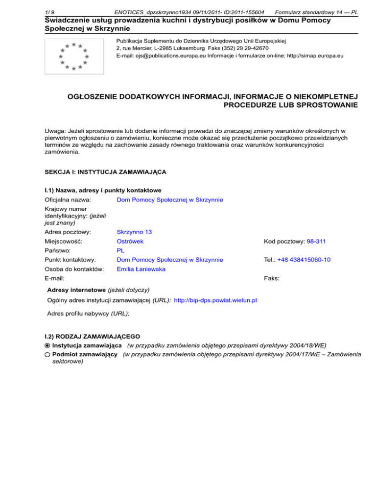 1/ 9 ENOTICES_dpsskrzynno1934 09/11/2011- ID:2011-155604 Formularz standardowy 14 — PL Świadczenie usług prowadzenia kuchni i dystrybucji posiłków w Domu Pomocy Społecznej w Skrzynnie Publikacja Suplementu do Dziennika Urzędowego Unii Europejskiej 2, rue Mercier, L-2985 Luksemburg Faks (352) 29 29-42670 E-mail: [email protected] Informacje i formularze on-line: http://simap.europa.eu OGŁOSZENIE DODATKOWYCH INFORMACJI, INFORMACJE O NIEKOMPLETNEJ PROCEDURZE LUB SPROSTOWANIE Uwaga: Jeżeli sprostowanie lub dodanie informacji prowadzi do znaczącej zmiany warunków określonych w pierwotnym ogłoszeniu o zamówieniu, konieczne może okazać się przedłużenie początkowo przewidzianych terminów ze względu na zachowanie zasady równego traktowania oraz warunków konkurencyjności zamówienia. SEKCJA I: INSTYTUCJA ZAMAWIAJĄCA I.1) Nazwa, adresy i punkty kontaktowe Oficjalna nazwa: Dom Pomocy Społecznej w Skrzynnie Krajowy numer identyfikacyjny: (jeżeli jest znany) _____ Adres pocztowy: Skrzynno 13 Miejscowość: Ostrówek Państwo: PL Punkt kontaktowy: Dom Pomocy Społecznej w Skrzynnie Osoba do kontaktów: Emilia Łaniewska E-mail: Kod pocztowy: 98-311 Tel.: +48 438415060-10 Faks: _____ Adresy internetowe (jeżeli dotyczy) Ogólny adres instytucji zamawiającej (URL): http://bip-dps.powiat.wielun.pl Adres profilu nabywcy (URL): I.2) RODZAJ ZAMAWIAJĄCEGO Instytucja zamawiająca (w przypadku zamówienia objętego przepisami dyrektywy 2004/18/WE) Podmiot zamawiający (w przypadku zamówienia objętego przepisami dyrektywy 2004/17/WE – Zamówienia sektorowe) 2/ 9 ENOTICES_dpsskrzynno1934 09/11/2011- ID:2011-155604 Formularz standardowy 14 — PL Świadczenie usług prowadzenia kuchni i dystrybucji posiłków w Domu Pomocy Społecznej w Skrzynnie SEKCJA II: PRZEDMIOT ZAMÓWIENIA II.1) OPIS II.1.1) Nazwa nadana zamówieniu przez instytucję zamawiającą (podano w pierwotnym ogłoszeniu) Świadczenie usług prowadzenia kuchni i dystrybucji posiłków w Domu Pomocy Społecznej w Skrzynnie II.1.2) Krôtki opis (podano w pierwotnym ogłoszeniu) Przedmiotem zamówienia jest prowadzenie kuchni i świadczenie przez Wykonawcę na rzecz Zamawiającego kompleksowych usług dla 175 osób, związanych z całodzienną obsługą, polegającą na przygotowaniu posiłków w pomieszczeniach Zamawiającego i dystrybucji posiłków do jadalni Domu Pomocy Społecznej w Skrzynnie. UWAGA !!! Liczba osób żywionych nie jest stała. Liczba mieszkańców może zmieniać się okresowo, ze względu na wyjazdy na urlop, pobyty w szpitalach i itp. Może ona także ulec zmniejszeniu w sposób naturalny. W 2010r. średni miesięczny stan mieszkańców spożywających posiłki wynosił 165 osób. Zamawiający będzie dostarczał Wykonawcy, z wyprzedzeniem jednodniowym, najpóźniej tego samego dnia do godz. 7:00 pisemny wykaz ilości mieszkańców oraz wymaganych diet. 3. W razie wystąpienia przypadków diet niepełnych (m.in.: przyjęcie nowego mieszkańca lub powrót ze szpitala albo też powrót mieszkańca z urlopu w godzinach popołudniowych), przyjmuje się następujące wartości procentowe udziału poszczególnych posiłków w cenie jednostkowej usługi: - Śniadanie - 30 % wartości ceny jednostkowej usługi, - Obiad + posiłek dodatkowy - 50 % wartości ceny jednostkowej usługi, - Kolacja 20 % wartości ceny jednostkowej usługi. Wykonawca zobowiązany jest do sporządzania ewidencji wydanych posiłków. 4. Dobowa kaloryczność posiłków ma się mieścić w granicach 2200-2400 kcal. Wykonawca będzie opracowywał jadłospis na okres 10 dni (3 razy w miesiącu). Jadłospis należy sporządzić w oparciu o przepisy Zarządzenia Ministra Zdrowia i Opieki Społecznej z dnia 24 czerwca 1974 r. w sprawie ustalania racji pokarmowych w całodziennym wyżywieniu określonych grup ludności (Dz.U. MZiOS z 1974 r., Nr 16, poz. 69) z uwzględnieniem specyfiki mieszkańców DPS oraz zleconych przez lekarza diet. Opracowany jadłospis winien być przedstawiony z 3-dniowym wyprzedzeniem do akceptacji osobie wyznaczonej do tego celu przez Zamawiającego. O ewentualnych zmianach w jadłospisie należy niezwłocznie powiadomić Zamawiającego. Jadłospis zatwierdzony przez Zamawiającego Wykonawca będzie wywieszał na tablicach informacyjnych przy stołówkach. 5. Przygotowywanie posiłków musi odbywać się na bieżąco, ze świeżych produktów, w pomieszczeniach kuchni Domu Pomocy Społecznej, zgodnie z wymaganiami określonymi odpowiednio w przepisach Ustawy z dnia 28 października 2006 r. o bezpieczeństwie żywności i żywienia (t.j. Dz. U. 2010, Nr 136, poz. 914 z późn. zm.) i innych w tym zakresie, jak również z zaleceniami Instytutu Żywności i Żywienia oraz zaleceniami lekarza. Wymaga się od Wykonawcy przygotowywania między innymi następujących diet: 1) ogólnej, 2) łatwostrawnej, 3) łatwostrawnej z ograniczeniem węglowodanów (dla ok. 9 % mieszkańców), 4) łatwostrawnej z ograniczeniem tłuszczu, 5) o zmienionej konsystencji (papka) wysokobiałkowej. 6. Zakwestionowane pod względem jakościowym lub ilościowym przez pracownika Zamawiającego posiłki podlegają wymianie na koszt Wykonawcy. 7. Posiłki mają być przygotowane i podawane zgodnie z poniższym harmonogramem: POSIŁEK GODZ. WYDAWANIA Śniadanie 9:00 –11:00 II śniadanie (przy diecie łatwostrawnej z ograniczeniem tłuszczu) 11:00-12:00 Obiad 13:00-15:00 Posiłek dodatkowy (podwieczorek) 16:00-17:00 Kolacja 18:00-20:00 Zgodnie z przepisem § 6 ust. 1 pkt 6 Rozporządzenia Ministra Polityki Społecznej z dnia 19 października 2005 r. w sprawie domów pomocy społecznej (Dz.U. 2005, Nr 217, poz. 1837) dla każdego z posiłków czas wydawania wynosi 2 godziny. 3/ 9 ENOTICES_dpsskrzynno1934 09/11/2011- ID:2011-155604 Formularz standardowy 14 — PL Świadczenie usług prowadzenia kuchni i dystrybucji posiłków w Domu Pomocy Społecznej w Skrzynnie 8. Zakres rzeczowy: 1) przygotowanie tzw. suchego prowiantu dla mieszkańców 