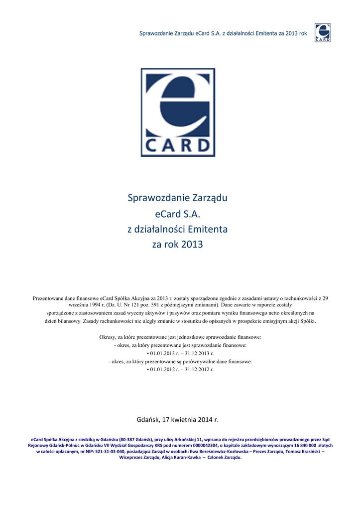 Sprawozdanie Zarządu eCard S.A. z działalności Emitenta za 2013 rok Sprawozdanie Zarządu eCard S.A. z działalności Emitenta za rok 2013 Prezentowane dane finansowe eCard Spółka Akcyjna za 2013 r. zostały sporządzone zgodnie z zasadami ustawy o rachunkowości z 29 września 1994 r. (Dz. U. Nr 121 poz. 591 z późniejszymi zmianami). Dane zawarte w raporcie zostały sporządzone z zastosowaniem zasad wyceny aktywów i pasywów oraz pomiaru wyniku finansowego netto określonych na dzień bilansowy. Zasady rachunkowości nie uległy zmianie w stosunku do opisanych w prospekcie emisyjnym akcji Spółki. Okresy, za które prezentowane jest jednostkowe sprawozdanie finansowe: - okres, za który prezentowane jest sprawozdanie finansowe: • 01.01.2013 r. – 31.12.2013 r. - okres, za który prezentowane są porównywalne dane finansowe: • 01.01.2012 r. – 31.12.2012 r. Gdańsk, 17 kwietnia 2014 r. eCard Spółka Akcyjna z siedzibą w Gdańsku (80-387 Gdańsk), przy ulicy Arkońskiej 11, wpisana do rejestru przedsiębiorców prowadzonego przez Sąd Rejonowy Gdańsk-Północ w Gdańsku VII Wydział Gospodarczy KRS pod numerem 0000042304, o kapitale zakładowym wynoszącym 16 840 000 złotych w całości opłaconym, nr NIP: 521-31-03-040, posiadająca Zarząd w osobach: Ewa Bereśniewicz-Kozłowska – Prezes Zarządu, Tomasz Krasiński – Wiceprezes Zarządu, Alicja Kuran-Kawka – Członek Zarządu. Sprawozdanie Zarządu eCard S.A. z działalności Emitenta za 2013 rok I. CHARAKTERYSTYKA SPÓŁKI 1. Podstawowe informacje o Spółce Nazwa (firma): Adres siedziby: Telefon: Fax: Adres korespondencyjny: Telefon: Fax: Poczta elektroniczna: Strona internetowa: eCard S.A. ul. Arkońska 11, 80-387 Gdańsk (+48 58) 511 20 00 (+48 58) 511 20 01 ul. Czackiego 7/9/11 00-043 Warszawa (+48 22) 493 44 90 (+48 22) 493 44 00 [email protected] www.ecard.pl eCard Spółka Akcyjna (Spółka, Emitent, eCard) jest wpisana do rejestru przedsiębiorców prowadzonego przez Sąd Rejonowy Gdańsk-Północ w Gdańsku, VII Wydział Gospodarczy Krajowego Rejestru Sądowego pod numerem KRS 0000042304. 2. Profil działalności eCard eCard jest agentem rozliczeniowym, zgodnie z decyzją Prezesa Narodowego Banku Polskiego z dnia 25 maja 2010 roku uprawnionym do prowadzenia systemu autoryzacji i rozliczeń w rozumieniu ustawy z dnia 12 września 2002 r. o elektronicznych instrumentach płatniczych oraz ustawy z dnia 24 sierpnia 2001 r. o ostateczności rozrachunku w systemach płatności i systemach rozrachunku papierów wartościowych oraz zasadach nadzoru nad tymi systemami. W związku z wejściem w życie ustawy z dnia 19 sierpnia 2011 r. o usługach płatniczych, oraz uchyleniem ustawy o elektronicznych instrumentach płatniczych, eCard złożył wniosek do Komisji Nadzoru Finansowego o wydanie zezwolenia na świadczenie usług płatniczych w charakterze krajowej instytucji płatniczej, i na podstawie przepisów przejściowych ustawy o usługach płatniczych do czasu rozpatrzenia wniosku prowadzi działalność w zakresie przyjmowania i rozliczania transakcji płatniczych. Obecnie eCard oferuje szeroki wachlarz usług płatności bezgotówkowych na polskim rynku. Obsługiwane przez eCard środowiska transakcji obejmują: transakcje e-commerce (płatności za pomocą karty płatniczej i przelewów); transakcje telefoniczne (MOTO, także za pośrednictwem własnego, czy też zewnętrznego IVR-a); zlecenia stałe obciążeń kart płatniczych; transakcje w terminalach POS (także w urządzeniach samoobsługowych); transakcje mobilne (transakcje realizowane poprzez powiązanie numeru karty płatniczej z numerem telefonu GSM), w tym MasterCard Mobile; transakcje typu „one click shopping” polegające na powiązaniu numeru karty z np.: adresem mailowym posiadacza (rozwiązania wykorzystywane często przez serwisy oferujące dostęp do różnego rodzaju treści); transakcje w ramach usługi V.me by Visa, w której klient definiuje w swoim banku wirtualny portfel kart płatniczych, i posługuje się nim celem dokonania płatności; 2 Sprawozdanie Zarządu eCard S.A. z działalności Emitenta za 2013 rok transakcje iKO i PeoPay (realizowane na bazie bilateralnych umów z bankami), do zatwierdzenia których wykorzystywana jest dedykowana aplikacja na smartfonie. Spółka stale rozwija swoje produkty i usługi, dzięki którym podmioty prowadzące sprzedaż za pośrednictwem Internetu, telefonu czy też sklepów naziemnych (terminale POS) mogą bezpiecznie i szybko przyjmować płatności od swoich klientów. Od 2011 roku Spółka z sukcesem rozwija obszar płatności mobilnych. Pozyskuje nowych partnerów i znacząco zwiększa liczbę i wartość procesowanych transakcji w tym kanale. Jednocześnie w zakresie podstawowych usług płatniczych Spółka zwiększyła portfel Klientów, a także aktywizowała pośredni kanał sprzedaży poprzez nawiązanie współpracy z podmiotami, których działalność ukierunkowana jest na akwizycję punktów handlowo-usługowych zainteresowanych przyjmowaniem płatności z wykorzystaniem terminali POS. Spółka świadczy także usługi na rzecz klientów operatorów telefonii komórkowej, prowadząc sprzedaż doładowań telefonów typu pre-paid za pomocą własnych, jak i partnerskich serwisów internetowych. W ofercie eCard znajdują się także usługi mikropłatności, tj. rozliczeń transakcji realizowanych na bazie usług SMS Premium. We wrześniu 2013 roku organizacja płatnicza Visa zakończyła certyfikację usługi V.me by Visa. Certyfikacja zakończyła okres intensywnych prac umożliwiający udostępnienie przez eCard S.A. nowego standardu dokonywania płatności kartami płatniczymi z wykorzystaniem tzw. „portfela kart”. Spółka, jako pierwsza w Polsce, zaoferowała ten standard sklepom i serwisom internetowym. 3. Informacje o powiązaniach organizacyjnych lub kapitałowych Emitenta z innymi podmiotami oraz określenie jego głównych inwestycji krajowych i zagraniczn