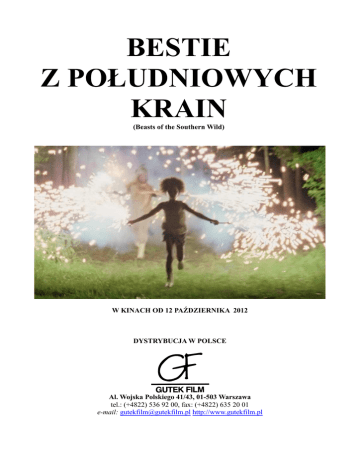 BESTIE Z POŁUDNIOWYCH KRAIN (Beasts of the Southern Wild) W KINACH OD 12 PAŹDZIERNIKA 2012 DYSTRYBUCJA W POLSCE Al. Wojska Polskiego 41/43, 01-503 Warszawa tel.: (+4822) 536 92 00, fax: (+4822) 635 20 01 e-mail: [email protected] http://www.gutekfilm.pl BESTIE Z POŁUDNIOWYCH KRAIN BEASTS OF THE SOUTHERN WILD Reżyseria Benh Zeitlin Scenariusz Lucy Alibar Benh Zeitlin Muzyka Dan Romer Benh Zeitlin Montaż Crockett Doob Affonso Gonçalves Zdjęcia Ben Richardson W rolach głównych: Quvenzhané Wallis Dwight Henry Levy Easterly Hushpuppy Wink Jean Battiste Producenci Michael Gottwald Dan Janvey Josh Penn Produkcja Cinereach Court 13 Pictures Journeyman Pictures USA rok produkcji: 2012 czas trwania: 92 min. 35 mm – Dolby Digital Kolor „Bestie z południowych krain” to fascynujące wizualnie połączenie realistycznej opowieści, kina fantasy i baśni. Film okrzyknięty najlepszym amerykańskim debiutem ostatniej dekady i sensacją tegorocznego festiwalu w Sundance. Laureat głównej nagrody tej imprezy najwyżej oceniony także przez krytykę i publiczność. Jeszcze przed werdyktem obraz kupiła do dystrybucji firma Fox Searchlight odpowiedzialna za sukcesy „Slumdog. Milioner z ulicy”, „Czarnego łabędzia”, czy „Wstydu”. „Bestie z południowych krain” trafił także do sekcji Un Certain Regard festiwalu w Cannes i opuścił tę prestiżową imprezę ze Złotą Kamerą za najlepszy debiut, wyróżnieniami od FIPRESCI i jury ekumenicznego, stając się jednym z najczęściej nagradzanych filmów ostatnich lat. W zapomnianej, buntowniczej społeczności odciętej od świata, sześcioletnia Hushpuppy prowadzi pełne odwagi i chęci przetrwania życie. Otaczający ją świat postrzega jako delikatną strukturę pełną żywych, oddychających, wzrastających rzeczy. Kiedy więc największa od stuleci burza nawiedza miasto, Hushpuppy wie, że naturalny porządek wszystkiego, co jest dla niej ważne został zachwiany. Zdeterminowana by naprawić walącą się strukturę świata, ocalić słabnącego ojca i uratować tonący dom, mała bohaterka swoją siłę i niezwykłą mądrość przeciwstawi nadciągającemu niebezpieczeństwu. GŁOSY PRASY „Bestie z południowych krain” to eksplozja czystej, nieprawdopodobnej radości, hałaśliwy i ekscytujący film akcji z bohaterką, która stoi w jednym rzędzie z Katniss Everdeen z "Igrzysk śmierci", księżniczką Meridą, czy innymi odważnymi heroinami kina z 2012 roku. A.O.Scott, „New York Times” Każda wielka kultura ma ikoniczne postaci swojej mitologii - Grecy mieli Zeusa, Rzymianie Herkulesa i Merkurego, Egipcjanie Ra. A teraz my mamy Hushpuppy. Mike Scott, „The Times-Picayune” „Bestie z południowych krain” odkrywają delikatny i przerażający świat dziecięcej wyobraźni. Jego płodność i groza mają to samo źródło: dla młodego umysłu nie ma wyraźnej bariery, oddzielającej rzeczywistość od fantazji. Amy Biancolli, „San Francisco Chronicle” Choć pod wieloma względami są to filmy zupełnie różne to jednak i w „Bestiach...” i w „Gdzie mieszkają dzikie stwory” Spike'a Jonze'a widać pewne artystyczne i tematyczne podobieństwo. Steven Rea, „Philadelphia Inquirer” Nie jestem pewien jak wszystko w tym filmie działa i boję się, że ta wiedza osłabiłaby jego czar. Wiem natomiast, że „Bestie z południowych krain” są pierwszym filmem od długiego czasu, który sprawił na mnie wrażenie, jakby był pierwszym filmem kiedykolwiek nakręconym. Ty Burr, „Boston Globe” Czasem niezwykłe filmy tworzone są przez ludzi, o których nigdy wcześniej nie słyszeliśmy. Wpatrujemy się w nieznane twarze, które oślepiają nas swoim twórczym geniuszem. Roger Ebert, „Chicago Sun Times” Najlepszy sposób na obejrzenie „Bestii z południowych krain” to usiąść wygodnie, pozwolić by wszystkie wspaniałości tego filmu na nas spłynęły i zapomnieć, przynajmniej na czas trwania seansu, o tym co jest prawdą - szokująco okrutną - w życiu Hushpuppy, a co wytworem jej wyobraźni. Joe Morgenstern, „The Wall Street Journal” To film, zmieniający oblicze współczesnego kina i sprawiający, że znów wyda się wam ono ekscytujące. Zasługuje na wszystkie nagrody, które już dostał i te, które jeszcze dostanie. Objawia reżyserski talent 29-cio letniego Benha Zeitlina, na którego uwagę powinna zwrócić przyznająca Oscary Akademia. Udało mu się bowiem stworzyć świat, w którym można się zatracić. Świat pełen mitycznego piękna i grozy. Jak Zeitlin sam przyznał w jednym z wywiadów chciał połączyć poetykę wyrafinowanego arthousowego kina z czymś co przypominałoby „Szklaną pułapkę”. Misja zakończona sukcesem. Peter Travers, „Rolling Stone” Quvenzhané Wallis, to mały chochlik, który skupia na sobie uwagę kamery z charyzmą, która dorosłe gwiazdy kina powinna zmusić do płaczu z zazdrości. Hushpuppy jest prawdziwie amerykańskim połączeniem indywidualizmu i poczucia wspólnoty. Innymi słowy jest ona spadkobierczynią wielkiej literackiej i artystycznej tradycji, do której należą również Huckleberry Finn, Scout Finch, Elliott z „E.T.” i inne odważne, szalone, pełne wyobraźni dzieciaki. Ale siła „Bestii...”, ich wielkość wynika raczej z uczuć, a nie intelektu. Pozwolę sobie na pewną analogię. Odkrywanie tego filmu jest jak wejście do baru, gdzie napotykamy zespół, którego nigdy wcześniej nie słyszeliśmy, grający w dodatku muzykę, której nie jesteśmy w stanie zidentyfikować. Podobnie jak nie jesteśmy w stanie określić jak to się stało, że muzycy grają z taką pasją i wprawą. Czy talent odziedziczyli po dziadkach, studiowali w konserwatorium, a może oglądali instruktażowe filmiki w internecie? Zadajesz sobie te pytania, ale jednocześnie wiesz, że nie mają one żadnego znaczenia, bo już zostałeś porwany przez rytm, któremu nie możesz się oprzeć i melodie, które wydają