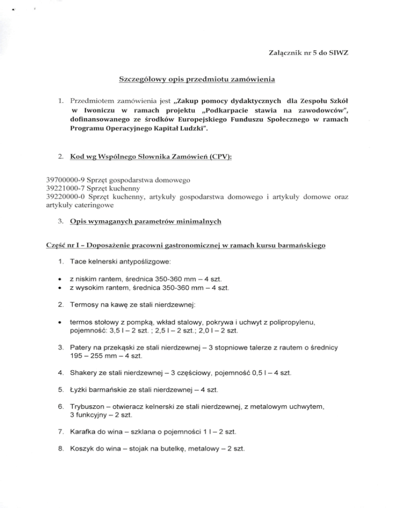 Załącznik Szczegółowy nr 5 do SIWZ opis przedmiotu zamówienia 1. Przedmiotem zamówienia jest „Zakup pomocy dydaktycznych dla Zespołu Szkół w Iwoniczu w ramach projektu „Podkarpacie stawia na zawodowców", dofinansowanego ze środków Europejskiego Funduszu Społecznego w ramach Programu Operacyjnego Kapitał Ludzki". 2. Kod wg Wspólnego Słownika Zamówień (CPV): 39700000-9 Sprzęt gospodarstwa domowego 39221000-7 Sprzęt kuchenny 39220000-0 Sprzęt kuchenny, artykuły gospodarstwa domowego artykuły cateringowe artykuły domowe oraz 3. Opis wymaganych parametrów minimalnych Część nr I - Doposażenie 1. Tace kelnerski • • antypoślizgowe : z niskim rantem , średnica 350-360 mm - 4 szt. z wysokim rantem , średnica 350-360 mm - 4 szt. 2. Termosy na • pracowni gastronomicznej w ramach kursu barmańskiego termos kawę ze stali nierdzewnej : stołowy pojemność : z pompką , wkład stalowy, pokrywa i uchwyt z polipropylenu , 3,5 I - 2 szt. ; 2,5 I - 2 szt.; 2,0 I - 2 szt. 3. Patery na przekąski ze stali nierdzewnej - 3 stopniowe talerze z rautem o 195 - 255 mm -4 szt. 4. Shakery ze stali nierdzewnej - 3 5. Łyżki barmańskie częściowy , pojemność średnicy 0,5 I - 4 szt. ze stali nierdzewnej - 4 szt. 6. Trybuszon - otwieracz kelnerski ze stali nierdzewnej, z metalowym uchwytem , 3 funkcyjny - 2 szt. 7. Karafka do wina - szklana o 8. Koszyk do wina - stojak na pojemności butelkę , 1 I - 2 szt. metalowy - 2 szt. Część nr II - Doposażenie pracowni gastronomicznej w ramach kursu baristycznego 1. Szklanka do irish coffe - pojemność 0,225 I - 12 szt. 2. Szklanka do latte - pojemność 0,26 I - 12 szt. 3. Filiżanka ze spodkiem do cappucino - porcelana cienka , biała , pojemność 0,23 0,26 I - 6 szt. 4. Filiżanka ze spodkiem - porcelana cienka , białą , pojemność 0,30 - 0,40 I - 6 szt. 5. Kawiarka ciśnieniowa - ze stali nierdzewnej 18/10, pojemność 0,3 I, na kuchenki gazowe i ceramiczne - 2 szt. 6. Tygielek do kawy po turecku - ze stali nierdzewnej z bakelitowym uchwytem , pojemność 0,45 I, na kuchenki gazowe i ceramiczne - 2 szt. 7. Foremki do zdobienia kawy - dekorator do kawy ze stali nierdzewnej , 6 - cio elementowy - 1 komplet zostało wskazane pochodzenie (marka, znak towarowy, producent, dostawca) lub normy, aprobaty, specyfikacje i systemy, o których mowa w art. 30 ust. 1-3 Ustawy Prawo zamówień publicznych, Zamawiający dopuszcza oferowanie materiałów lub rozwiązań równoważnych pod warunkiem, że zapewnią uzyskanie parametrów technicznych nie gorszych od założonych. Tam, gdzie materiałów Opracował: Marek Haręzga