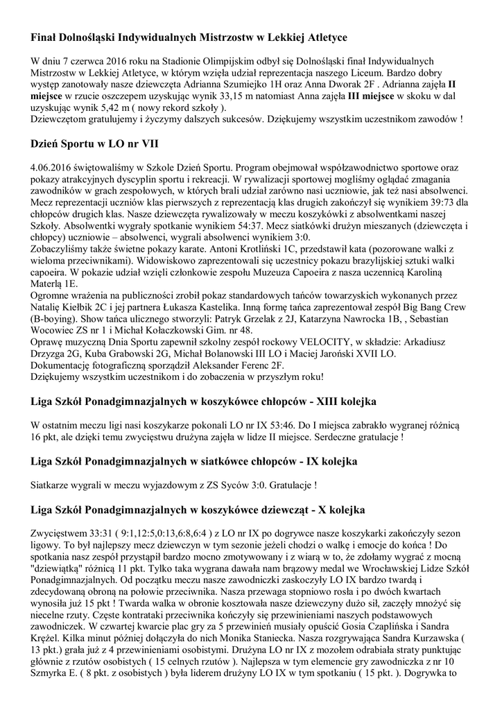 Finał Dolnośląski Indywidualnych Mistrzostw w Lekkiej Atletyce W dniu 7 czerwca 2016 roku na Stadionie Olimpijskim odbył się Dolnośląski finał Indywidualnych Mistrzostw w Lekkiej Atletyce, w którym wzięła udział reprezentacja naszego Liceum. Bardzo dobry występ zanotowały nasze dziewczęta Adrianna Szumiejko 1H oraz Anna Dworak 2F . Adrianna zajęła II miejsce w rzucie oszczepem uzyskując wynik 33,15 m natomiast Anna zajęła III miejsce w skoku w dal uzyskując wynik 5,42 m ( nowy rekord szkoły ). Dziewczętom gratulujemy i życzymy dalszych sukcesów. Dziękujemy wszystkim uczestnikom zawodów ! Dzień Sportu w LO nr VII 4.06.2016 świętowaliśmy w Szkole Dzień Sportu. Program obejmował współzawodnictwo sportowe oraz pokazy atrakcyjnych dyscyplin sportu i rekreacji. W rywalizacji sportowej mogliśmy oglądać zmagania zawodników w grach zespołowych, w których brali udział zarówno nasi uczniowie, jak też nasi absolwenci. Mecz reprezentacji uczniów klas pierwszych z reprezentacją klas drugich zakończył się wynikiem 39:73 dla chłopców drugich klas. Nasze dziewczęta rywalizowały w meczu koszykówki z absolwentkami naszej Szkoły. Absolwentki wygrały spotkanie wynikiem 54:37. Mecz siatkówki drużyn mieszanych (dziewczęta i chłopcy) uczniowie – absolwenci, wygrali absolwenci wynikiem 3:0. Zobaczyliśmy także świetne pokazy karate. Antoni Krotliński 1C, przedstawił kata (pozorowane walki z wieloma przeciwnikami). Widowiskowo zaprezentowali się uczestnicy pokazu brazylijskiej sztuki walki capoeira. W pokazie udział wzięli członkowie zespołu Muzeuza Capoeira z nasza uczennicą Karoliną Materlą 1E. Ogromne wrażenia na publiczności zrobił pokaz standardowych tańców towarzyskich wykonanych przez Natalię Kiełbik 2C i jej partnera Łukasza Kastelika. Inną formę tańca zaprezentował zespół Big Bang Crew (B-boying). Show tańca ulicznego stworzyli: Patryk Grzelak z 2J, Katarzyna Nawrocka 1B, , Sebastian Wocowiec ZS nr 1 i Michał Kołaczkowski Gim. nr 48. Oprawę muzyczną Dnia Sportu zapewnił szkolny zespół rockowy VELOCITY, w składzie: Arkadiusz Drzyzga 2G, Kuba Grabowski 2G, Michał Bolanowski III LO i Maciej Jaroński XVII LO. Dokumentację fotograficzną sporządził Aleksander Ferenc 2F. Dziękujemy wszystkim uczestnikom i do zobaczenia w przyszłym roku! Liga Szkół Ponadgimnazjalnych w koszykówce chłopców - XIII kolejka W ostatnim meczu ligi nasi koszykarze pokonali LO nr IX 53:46. Do I miejsca zabrakło wygranej różnicą 16 pkt, ale dzięki temu zwycięstwu drużyna zajęła w lidze II miejsce. Serdeczne gratulacje ! Liga Szkół Ponadgimnazjalnych w siatkówce chłopców - IX kolejka Siatkarze wygrali w meczu wyjazdowym z ZS Syców 3:0. Gratulacje ! Liga Szkół Ponadgimnazjalnych w koszykówce dziewcząt - X kolejka Zwycięstwem 33:31 ( 9:1,12:5,0:13,6:8,6:4 ) z LO nr IX po dogrywce nasze koszykarki zakończyły sezon ligowy. To był najlepszy mecz dziewczyn w tym sezonie jeżeli chodzi o walkę i emocje do końca ! Do spotkania nasz zespół przystąpił bardzo mocno zmotywowany i z wiarą w to, że zdołamy wygrać z mocną "dziewiątką" różnicą 11 pkt. Tylko taka wygrana dawała nam brązowy medal we Wrocławskiej Lidze Szkół Ponadgimnazjalnych. Od początku meczu nasze zawodniczki zaskoczyły LO IX bardzo twardą i zdecydowaną obroną na połowie przeciwnika. Nasza przewaga stopniowo rosła i po dwóch kwartach wynosiła już 15 pkt ! Twarda walka w obronie kosztowała nasze dziewczyny dużo sił, zaczęły mnożyć się niecelne rzuty. Częste kontrataki przeciwnika kończyły się przewinieniami naszych podstawowych zawodniczek. W czwartej kwarcie plac gry za 5 przewinień musiały opuścić Gosia Czaplińska i Sandra Krężel. Kilka minut później dołączyła do nich Monika Staniecka. Nasza rozgrywająca Sandra Kurzawska ( 13 pkt.) grała już z 4 przewinieniami osobistymi. Drużyna LO nr IX z mozołem odrabiała straty punktując głównie z rzutów osobistych ( 15 celnych rzutów ). Najlepsza w tym elemencie gry zawodniczka z nr 10 Szmyrka E. ( 8 pkt. z osobistych ) była liderem drużyny LO IX w tym spotkaniu ( 15 pkt. ). Dogrywka to popis naszej zawodniczki Ani Bałaj, która indywidualnymi akcjami i 6 punktami w tej części gry ustaliła wynik meczu. Drużyna LO nr VII zakończyła sezon ligowy na IV miejscu powtarzając wynik z Licealiady. Mecz był jednocześnie pożegnaniem z drużyną naszej jedynej trzecioklasistki Emilii Kopeć, której serdecznie dziękujemy za trzy lata gry w reprezentacji naszego LO ! Liga Szkół Ponadgimnazjalnych w koszykówce chłopców - XII kolejka Mimo słabszej formy strzeleckiej koszykarze pokonali na własnym boisku zespół LO nr XVII 45:41. Liga Szkół Ponadgimnazjalnych w siatkówce chłopców - VIII kolejka W kolejnym spotkaniu ligi nasi siatkarze postawili bardzo twarde warunki liderowi z Milicza przegrywając na wyjeździe dopiero w tie - break'u 2:3. ZS Milicz - LO VII 3:2 ( 17:25, 25:21, 19:25, 25:17, 15:11 ) Liga Szkół Ponadgimnazjalnych w koszykówce chłopców - X kolejka Koszykarze wysoko pokonali zespół LO nr III 79:31. Gratulacje! Liga Szkół Ponadgimnazjalnych w siatkówce chłopców - VII kolejka Siatkarze przegrali na wyjeździe z LO nr III 0:3. Liga Szkół Ponadgimnazjalnych w siatkówce dziewcząt - VI kolejka Siatkarki wygrały z ZSG 3:0. Gratulacje ! Liga Szkół Ponadgimnazjalnych w koszykówce dziewcząt - VIII i IX kolejka Dziewczęta przegrały obydwa mecze z faworytami rozgrywek - drużyną LO nr XV 21:57 oraz LO nr III 22:63. Do meczu z LO nr III drużyna przystąpiła w mocno osłabionym składzie w siedem zawodniczek. W ostatniej kolejce ligi 11.04 nasza ekipa spotka się z LO nr IX. Żeby marzyć o brązowym medalu w rozgrywkach ligowych trzeba pokonać przeciwnika różnicą minimum 11 pkt. Mistrzostwa Wrocławia w piłce ręcznej chłopców Dobrze rozpoczęli występy w Mistrzostwach Wrocławia nasi piłkarze ręczni, kt