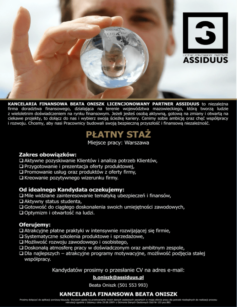 KANCELARIA FINANSOWA BEATA ONISZK LICENCJONOWANY PARTNER ASSIDUUS to niezależna firma doradztwa finansowego, działająca na terenie województwa mazowieckiego, którą tworzą ludzie z wieloletnim doświadczeniem na rynku finansowym. Jeżeli jesteś osobą aktywną, gotową na zmiany i otwartą na ciekawe projekty, to dołącz do nas i wybierz swoją ścieżkę kariery. Cenimy sobie ambicję oraz chęć współpracy i rozwoju. Chcemy, aby nasi Pracownicy budowali swoją bezpieczną przyszłość i finansową niezależność. PŁATNY STAŻ Miejsce pracy: Warszawa Zakres obowiązków: Aktywne pozyskiwanie Klientów i analiza potrzeb Klientów, Przygotowanie i prezentacja oferty produktowej, Promowanie usług oraz produktów z oferty firmy, Kreowanie pozytywnego wizerunku firmy. Od idealnego Kandydata oczekujemy: Mile widziane zainteresowanie tematyką ubezpieczeń i finansów, Aktywny status studenta, Gotowość do ciągłego doskonalenia swoich umiejętności zawodowych, Optymizm i otwartość na ludzi. Oferujemy: Atrakcyjne płatne praktyki w intensywnie rozwijającej się firmie, Systematyczne szkolenia produktowe i sprzedażowe, Możliwość rozwoju zawodowego i osobistego, Doskonałą atmosferę pracy w doświadczonym oraz ambitnym zespole, Dla najlepszych – atrakcyjne programy motywacyjne, możliwość podjęcia stałej współpracy. Kandydatów prosimy o przesłanie CV na adres e-mail: [email protected] Beata Oniszk (501 553 993) KANCELARIA FINANSOWA BEATA ONISZK Prosimy dołączyć do aplikacji poniższą klauzulę: Wyrażam zgodę na przetwarzanie moich danych osobowych zawartych w mojej ofercie pracy dla potrzeb niezbędnych do realizacji procesu rekrutacji zgodnie z Ustawą z dnia 29.08.1997r o Ochronie Danych Osobowych DzU Nr 133 poz.883.