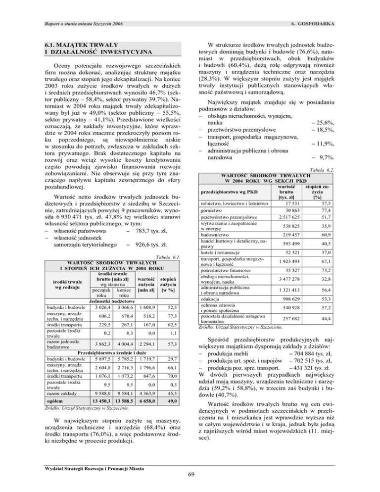 Raport o stanie miasta Szczecin 2006 6. GOSPODARKA W strukturze środków trwałych jednostek budżetowych dominują budynki i budowle (76,6%), natomiast w przedsiębiorstwach, obok budynków i budowli (60,4%), dużą rolę odgrywają również maszyny i urządzenia techniczne oraz narzędzia (28,3%). W większym stopniu zużyty jest majątek trwały instytucji publicznych stanowiących własność państwową i samorządową. 6.1. MAJĄTEK TRWAŁY I DZIAŁALNOŚĆ INWESTYCYJNA Oceny potencjału rozwojowego szczecińskich firm można dokonać, analizując strukturę majątku trwałego oraz stopień jego dekapitalizacji. Na koniec 2003 roku zużycie środków trwałych w dużych i średnich przedsiębiorstwach wynosiło 46,7% (sektor publiczny – 58,4%, sektor prywatny 39,7%). Natomiast w 2004 roku majątek trwały zdekapitalizowany był już w 49,0% (sektor publiczny – 55,5%, sektor prywatny – 41,1%). Przedstawione wielkości oznaczają, że nakłady inwestycyjne, które wprawdzie w 2004 roku znacznie przekroczyły poziom roku poprzedniego, są niewspółmiernie niskie w stosunku do potrzeb, zwłaszcza w zakładach sektora prywatnego. Brak dostatecznego kapitału na rozwój oraz wciąż wysokie koszty kredytowania często powodują zjawisko finansowania rozwoju zobowiązaniami. Nie obserwuje się przy tym znaczącego napływu kapitału zewnętrznego do sfery pozahandlowej. Największy majątek znajduje się w posiadaniu podmiotów z działów: − obsługa nieruchomości, wynajem, nauka – 25,6%, − przetwórstwo przemysłowe – 18,5%, − transport, gospodarka magazynowa, łączność – 11,9%, − administracja publiczna i obrona narodowa – 9,7%. Tabela 6.2. WARTOŚĆ ŚRODKÓW TRWAŁYCH W 2004 ROKU WG SEKCJI PKD wartość stopień zuprzedsiębiorstwa wg PKD brutto życia [tys. zł] [%] rolnictwo, łowiectwo i leśnictwo 17 531 37,5 górnictwo 30 863 77,4 przetwórstwo przemysłowe 2 517 625 51,7 wytwarzanie i zaopatrzenie 35,9 538 825 w energię budownictwo 219 457 60,9 handel hurtowy i detaliczny, na593 499 40,5 prawy hotele i restauracje 52 321 37,0 transport, gospodarka magazy1 923 493 67,1 nowa i łączność pośrednictwo finansowe 35 327 73,2 obsługa nieruchomości, 32,8 3 477 278 wynajem, nauka administracja publiczna 1 321 413 56,4 i obrona narodowa edukacja 908 629 53,3 ochrona zdrowia 57,2 540 928 i pomoc społeczna pozostała działalność usługowa 257 682 44,4 komunalna Źródło: Urząd Statystyczny w Szczecinie. Wartość netto środków trwałych jednostek budżetowych i przedsiębiorstw z siedzibą w Szczecinie, zatrudniających powyżej 9 pracowników, wynosiła 6 930 471 tys. zł. 47,8% tej wielkości stanowi własność sektora publicznego, w tym: − własność państwowa – 783,7 tys. zł, − własność jednostek samorządu terytorialnego – 926,6 tys. zł. Tabela 6.1. WARTOŚĆ ŚRODKÓW TRWAŁYCH I STOPIEŃ ICH ZUŻYCIA W 2004 ROKU środki trwałe wartość stopień brutto [mln zł] środki trwałe wg stanu na zużycia zużycia wg rodzaju początek koniec [mln zł] [w %] roku roku Jednostki budżetowe budynki i budowle 3 026,4 3 066,6 1 608,9 52,5 maszyny, urządz. 606,2 670,4 518,2 77,3 techn. i narzędzia środki transportu 229,5 267,1 167,0 62,5 pozostałe środki 0,2 0,3 0,0 1,1 trwałe razem jednostki 3 862,3 4 004,4 2 294,1 57,3 budżetowe Przedsiębiorstwa średnie i duże budynki i budowle 5 897,5 5 785,2 1 719,7 29,7 maszyny, urządz. 2 604,8 2 716,3 1 796,6 66,1 techn. i narzędzia środki transportu 1 076,1 1 073,2 847,6 79,0 pozostałe środki 9,5 9,5 0,0 0,3 trwałe razem zakłady 9 588,0 9 584,1 4 363,9 45,5 ogółem 13 450,3 13 588,5 Źródło: Urząd Statystyczny w Szczecinie. 6 658,0 Spośród przedsiębiorstw produkcyjnych największym majątkiem dysponują zakłady z działów: − produkcja mebli – 704 884 tys. zł, − produkcja art. spoż. i napojów – 702 515 tys. zł, − produkcja poz. sprz. transport. – 431 321 tys. zł. W dwóch pierwszych przypadkach największy udział mają maszyny, urządzenia techniczne i narzędzia (59,2% i 58,8%), w trzecim zaś budynki i budowle (40,7%). 49,0 Wartość środków trwałych brutto wg cen ewidencyjnych w podmiotach szczecińskich w przeliczeniu na 1 mieszkańca jest wprawdzie wyższa niż w całym województwie i w kraju, jednak była jedną z najniższych wśród miast wojewódzkich (11. miejsce). W największym stopniu zużyte są maszyny, urządzenia techniczne i narzędzia (68,4%) oraz środki transportu (76,0%), a więc podstawowe środki niezbędne w procesie produkcji. Wydział Strategii Rozwoju i Promocji Miasta 69 Raport o stanie miasta Szczecin 2006 6. GOSPODARKA Tabela 6.3. WARTOŚĆ BRUTTO ŚRODKÓW TRWAŁYCH W PRZEDSIĘBIORSTWACH* W 2004 ROKU W MIASTACH WOJEWÓDZKICH (bieżące ceny ewidencyjne) wartość środków środki trwałe trwałych na 1 miasto brutto w mln zł mieszkańca w zł Warszawa 179 640,4 106 116,89 Katowice 20 354,7 63 627,53 Poznań 34 163,8 59 854,79 Zielona Góra 6 268,6 52 892,44 Gdańsk 22 297,2 48 570,16 Kraków 33 531,6 44 270,23 Olsztyn 7 499,7 43 138 91 Kielce 7 961,4 38 010,07 Wrocław 23 328,3 36 664,27 Rzeszów 5 711,4 35 916,24 Szczecin 14 468,3 35 125,76 Bydgoszcz 11 892,7 32 296,50 Lublin 10 925,7 30 690,34 Opole 3 827,3 29 700,30 Białystok Łódź województwo zachodniopomorskie 8 564,1 29 315,08 21 179,9 27 364,07 37 448,2 22 095,09 W największym stopniu inwestują zakłady produkcyjne oraz instytucje administracji publicznej. Wśród przedsiębiorstw dominują branże: − produkcja artykułów spożywczych i napojów – 90 633 tys. zł, − produkcja pozostałego sprzętu transportowego – 132 708 tys. zł, − produkcja mebli – 227 831 tys. zł. Podmioty te nastawione są przede wszystkim na odnowę parku maszynowego. Natomiast wśród jednostek administracji publicznej dominowały nakłady na budynki i budowle oraz grunty. Tabela 6.5. NAKŁADY INWESTYCYJNE PODMIOTÓW* Z SIEDZIBĄ W SZCZECINIE W LATACH 2002–2004 WG
