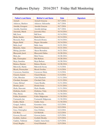 Piątkowe Dyżury 2016/2017 Friday Hall Monitoring Father's Last Name Arciuch Atkinson, Matthew Antolak, Grzegorz Antolak, Stanislaw Antoniuk, Marek Ball, Scott Binda, Stanley Borzecki, Peter Bogun, Rafal Bafia, Jozef Bielanski, Adam Biskup, Jaroslaw Blaszynski, Jacek Biela, Jan Bak, Christopher Bryja, Stanislaw Bulawa, Damian Bakowski, Martin Biczek, Przemyslaw Czyszczon, Stanislaw Church, Garrett Cislo, Miroslaw Chrobak, Szczepan Ciurej, Michael Domin, Jacek Dydo, Slawomir Ehrlicher, Keith Filar, Maciej Folfas, Kazimierz Furmanski, Jan Grabis, Marek Gorgol, Andrzej Guzy, Andy Gres, Christopher Gil, Ricky Gewont, Ryszard Gorlicki, Andrzej Gajdzis, Valdemar Goryl, Bogdan Mother's Last Name Arciuch Grazyna Atkinson Aleksandra Antolak Grazyna Antolak Jadwiga Jurowska Eliza Ball Scott Binda Dorota Borzecki Donna Bogun Alexandra Bafia Anna Bielanski Katarzyna Mazur Bernadeta Blaszynski Halina Biela Teresa Bak Barbara Bryja Barbara Bulawa Monica Bakowski Iwona Biczek Ewelina Czyszczon Maria Church Renata Cislo Elizabeth Chrobak Chris Ciurej Monika Domin Irena Dydo Monika Ehrlicher, Vicky Filar Monika Folfas Malgorzata Furmanski Malgorzata Grabis Anna Krzemien Anna Guzy Leslie Gres Elzbieta Gil Michelle Gewont Janina Gorlicki Monika Gajdzis Aneta Szary Goryl Elizabeth Date 10/7/2016 10/7/2016 10/7/2016 10/7/2016 10/14/2016 10/14/2016 10/14/2016 10/14/2016 10/14/2016 10/21/2016 10/21/2016 10/21/2016 10/28/2016 10/28/2016 10/28/2016 10/28/2016 10/28/2016 11/4/2016 11/4/2016 11/4/2016 11/4/2016 11/11/2016 11/11/2016 11/11/2016 11/11/2016 11/11/2016 11/18/2016 11/18/2016 11/18/2016 11/18/2016 11/18/2016 12/2/2016 12/2/2016 12/2/2016 12/2/2016 12/9/2016 12/9/2016 12/9/2016 12/9/2016 Signature Piątkowe Dyżury 2016/2017 Friday Hall Monitoring Father's Last Name Husain, Shaban Hodurek, Andrzej Hornik, Andrzej Husarik, Ryan Jaworski, Konrad Jablonski, Mariusz Kozakiewicz, Andrzej Kelly, Joshua Kranz, David Kobylak, Miroslaw Klapacz, Stanislaw Klapacz, Andrzej Krzemien, Marcin Kupiec, Andrzej Kolakowski, Slawomir Klusa, Mariusz Kopinski, Albert Koziel, Christopher Koscielniak, Przemyslaw Krzysiak, Bogdan Krynski, Tomasz Kas, Janusz Kass, Daniel Kedryna, Tomasz Lukaszczyk, Artur Lazarowicz, Lukasz Lacek, Jozef Labuda, Marcin Lesniak, Maciej Lisowski, Grzegosz Labuda, Tadeusz Lys, Roman Lassak, Michal Ligas, Casey Ludwig, Thomas Malorny, Kris Mucha, Stanislaw Mucha, Kazimierz Marusarz, John Mother's Last Name Husain Ewa Hodurek Marzena Hornik Maria Husarik Kristie Jaworski Wieslawa Borowska Anna Zianowicz Aneta Kelly Erika Kranz Katarzyna Kobylak Helena Klapacz Aleksandra Klapacz Lucyna Krzemien Maria Necka-Kupiec Anna Leszczynska Justyna Klusa Barbara Kopinski Jolanta Koziel Barbara Koscielniak Urszula Krzysiak Zofia Krynska Agnieszka Kas Halina Kass Elzbieta Kedryna Anna Lukaszczyk Natasza Lazarowicz Grazyna Korabik Maria Labuda Alexandra Szwab Renata Lisowski Maria Labuda Basia Lys Nina Lassak Monica Ligas Ewa Bogun Malgorzata Malorny Agnes Mucha Beata Mucha Kathy Marusarz Margaret Date 12/9/2016 12/16/2016 12/16/2016 12/16/2016 12/16/2016 1/6/2017 1/6/2017 1/6/2017 1/6/2017 1/6/2017 1/13/2017 1/13/2017 1/13/2017 1/13/2016 1/13/2017 1/20/2017 1/20/2017 1/20/2017 1/20/2017 1/20/2017 1/26/2017 1/26/2017 1/26/2017 2/3/2017 2/3/2017 2/3/2017 2/3/2017 2/3/2017 2/10/2017 2/10/2017 2/10/2017 2/10/2017 2/17/2017 2/17/2017 2/17/2017 2/17/2017 2/24/2017 2/24/2017 2/24/2017 Signature Piątkowe Dyżury 2016/2017 Friday Hall Monitoring Father's Last Name Majchrowicz, Chris McKenna, Mike Mietus, Chester Matuszek, Krzysztof Nowakowski, Waldemar Nosal, Artur O'Connor, Timothy Oliwa, Dariusz Orozco, Jose Opalacz, Robert Owca, Derek Pietka, Lukasz Ptaszek, Jan Pasciak, Marek Podczerwinski, Pawel Panek, Irek Perczynski, David Piechnik, Jakub Panek, Boguslaw Pietka, Casey Reczek, Wojciech Rafacz, Andrew Szczech, Jerry Szkliniarz, Tomasz Stoch, Janusz Skocinski, Artur Sak, Krzysztof Skotnicki, Stefan Szymaszek, Slawomir Sudol, Mariusz Szczepaniak, Bartlomiej Straczek, Wojciech Trojanek, Jerzy Tylka, Christopher Tomecki, Henry Tokarska Ufnal, Robert Urban, Christopher Mother's Last Name Majchrowicz Jolanta McKenna Barbara Mietus Agnieszka Matuszek Maria Maldonado Maria Nosal Edyta O'Connor, Doniec, Palka Annette Oliwa Justyna Orozco Grace Opalacz Iwona Owca Dorota Pietka Kamila Ptaszek Agnieszka Bialas Margaret Podczerwinski Lucyna Panek Alina Ksel Renee Piechnik Maria Panek Aneta Pietka Barbara Reczek Bogumila Rafacz Teresa Szram Katarzyna Szkliniarz Kelly Stoch Margaret Cyran Malgorzata Sak Krystyna Skotnicki Iwona Szymaszek Ewelina Sudol Aneta Szczepaniak Margaret Straczek Grazyna Trojanek Malgorzata Tylka Renee Tomecki Margaret Tokarska Katarzyna Ufnal, Danuta Urban Anna Date 2/24/2017 3/2/2017 3/2/2017 3/2/2017 3/2/2017 3/9/2017 3/9/2017 3/9/2017 3/9/2017 3/9/2017 3/17/2017 3/17/2017 3/17/2017 3/17/2017 3/24/2017 3/24/2017 3/24/2017 3/24/2017 3/31/2017 3/31/2017 3/31/2017 3/31/2017 4/6/2017 4/6/2017 4/6/2017 4/6/2017 4/6/2017 4/21/2017 4/21/2017 4/21/2017 4/21/2017 4/21/2017 4/28/2017 4/28/2017 4/28/2017 4/28/2017 4/28/2016 4/28/2017 Signature Piątkowe Dyżury 2016/2017 Friday Hall Monitoring Father's Last Name Walczak, Piotr Wojtkielewicz, Pawel Wieczorek, Maciej Wilczek, Leo Wesoly, Stanislaw Wheeler, Matthew Walus, Christopher Zyskowski, Pawel Zieleznicki, Dariusz Zeglen, Jacek Mother's Last Name Walczak Katarzyna Wojtkielewicz Agnieszka Wieczorek Edyta Wilczek Diane Wesoly Maria Mokrzycka Balbina Walus Zofia Zyskowski Iwona Zieleznicki Alicja Zeglen Anna Date 5/5/2017 5/5/2017 5/5/2017 5/5/2017 5/5/2017 5/12/2017 5/12/2017 5/12/2017 5/12/2017 5/12/2017 Signature