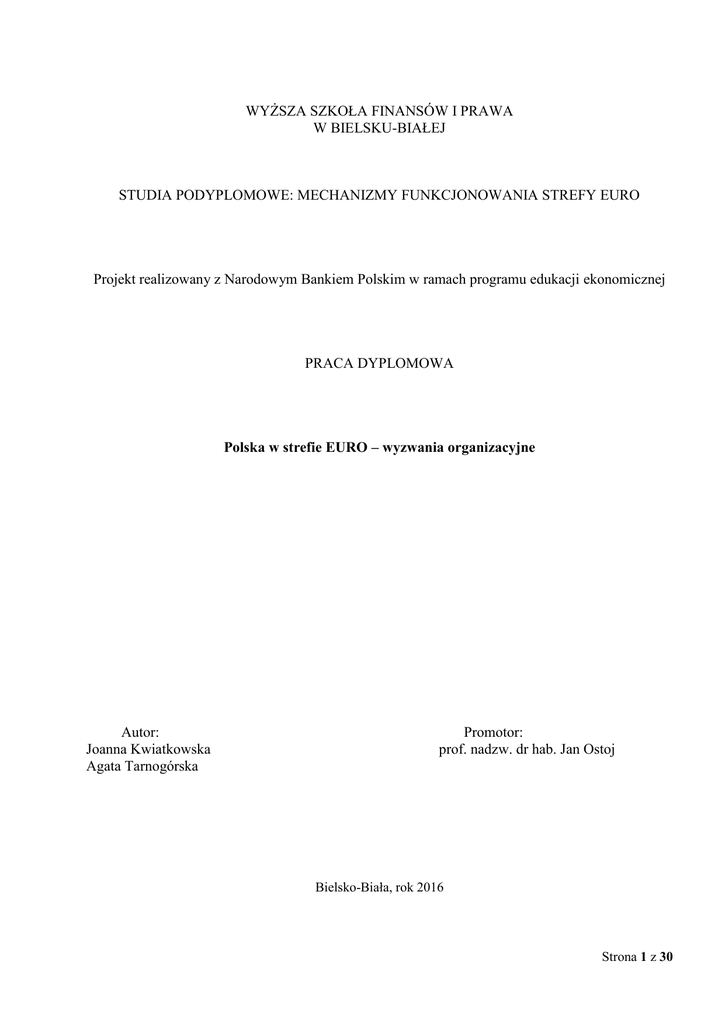 WYŻSZA SZKOŁA FINANSÓW I PRAWA W BIELSKU-BIAŁEJ STUDIA PODYPLOMOWE: MECHANIZMY FUNKCJONOWANIA STREFY EURO Projekt realizowany z Narodowym Bankiem Polskim w ramach programu edukacji ekonomicznej PRACA DYPLOMOWA Polska w strefie EURO – wyzwania organizacyjne Autor: Joanna Kwiatkowska Agata Tarnogórska Promotor: prof. nadzw. dr hab. Jan Ostoj Bielsko-Biała, rok 2016 Strona 1 z 30 Spis treści Wstęp ……………………………………………………………………………………….3 1 Architektura strefy EURO…………………………………………………………….4 2 Proces przyjęcia EURO – wybór scenariusza…………………………………………8 3 Integracja ze strefą euro w Polsce…………………………………………………….13 4 EURO w obrocie gotówkowym i bezgotówkowym – banknoty i monety, rynek kapitałowy…………………………………………………………………………….16 5 Zmiany w administracji publicznej………………..………………………………….20 6 Ochrona konsumentów……….……………………………………………………….21 7 Zmiany prawne jako konsekwencja wprowadzenia EURO….……………………….23 8 Polityka informacyjna związana z procesem wprowadzenia EURO………………….24 Podsumowanie……………………………………………………………………………….28 Literatura…………………………………………………………………………………….29 Spis rysunków……………………………………………………………………………….30 Załącznik…………………………………………………………………………………….30 Strona 2 z 30 Wstęp W roku 2004 Polska wchodząc do Unii Europejskiej i stając się członkiem Unii Gospodarczej i Walutowej zobowiązała się do przyjęcia EURO – wspólnej waluty Unii Europejskiej. Zobowiązanie to zostanie jednak zrealizowane po spełnieniu kryteriów konwergencji gospodarczej (zbliżeniu się poziomu gospodarczego Polski z państwami członkowskimi Unii Europejskiej) i prawnej (czyli zapewnieniu zgodności prawa Polskiego z prawem Unii Europejskiej). Aktualnie Polska jest członkiem Unii Europejskiej posiadający status kraju z derogacją, czyli z wyłączeniem (może być bezterminowe) państwa członkowskiego Unii Europejskiej z obowiązku wypełniania części (specjalnie wynegocjowanych) zobowiązań płynących ze stosowania prawa Unii. Zatem można stwierdzić iż członkostwo Polski w Unii Gospodarczej i Walutowej nie jest pełne. Euro mogą przyjąć tylko państwa będące członkami Unii Europejskiej. Wymogi przyjęcia euro zostały określone w Traktacie z Maastricht z 1992 r. i zostały one określone w poszczególnych obszarach w następujący sposób: 1. Deficyt budżetowy - roczny deficyt finansów publicznych kraju nie może przekroczyć 3% jego PKB; 2. Dług publiczny - całkowity nagromadzony dług nie może przekroczyć 60% PKB danego kraju (mogą wystąpić wyjątki przy przewidywaniach o stale obniżającym się długu); 3. Inflacja – wzrost cen w skali roku nie może wynosić więcej niż 1,5 punktu procentowego powyżej inflacji w trzech krajach strefy euro o najniższej stopie inflacji; 4. Stopy procentowe – długoterminowe stopy procentowe kraju kandydującego nie mogą odbierać o więcej niż 2 punkty procentowe od średnich stóp procentowych w trzech państwach członkowskich mających najniższe stopy procentowe w poprzednim roku. 5. Kursy walut – nie może przekraczać określonego marginesu wahań potwierdzając stabilność gospodarki do przyjęcia euro. Oprócz spełnienia w/w kryteriów konwergencji, które są wskaźnikiem oceny stabilności, kondycji i Strona 3 z 30 równowagi finansów publicznych ważne jest również zapewnienie spójności przepisów dotyczących krajowego banku centralnego z przepisami strefy euro. Ułatwi to skuteczne wdrażanie unii gospodarczej i walutowej oraz zapewni warunki wzrostu gospodarczego. Jakkolwiek dzisiejsza sytuacja w Polsce, przede wszystkim polityczna nie wskazuje na to, aby w najbliższych latach była wola szybkiego wejścia do strefy EURO, to w naszej pracy skupimy się na przedstawieniu planu organizacyjnego działań oraz wyzwań, które musiałyby być podjęte w chwili gdy decyzja o wejściu do strefy EURO zostanie podjęta i określony zostanie ostateczny termin wejścia. Przyjęcie waluty euro jest procesem bardzo złożonym wymagającym działań o charakterze prawnym i organizacyjnym zarówno przez Bank Centralny jak i inne instytucje w Polsce. Wszystkie założenia w niniejszej pracy mają charakter ogólny i nie są wiążące. Proces wejścia do strefy EURO wiąże się z przyjęciem mechanizmu kursu waluty ERM II, zbadaniem przez Komisję Europejską i Europejski Bank Centralny spełnienia przez nasz kraj kryterium konwergencji gospodarczej i politycznej oraz podjęcia przez Radę Unii Europejskiej decyzji o uchyleniu derogacji. W decyzji o uchyleniu derogacji określa się termin uchylenia derogacji czyli datę przyjęcia euro jako waluty danego państwa. Rada ECOFIN ustala ponadto w drodze rozporządzeń, datę wprowadzenia w państwie członkowskim banknotów i monet euro do obiegu, z uwzględnieniem daty zaproponowanej przez dany kraj oraz kursu, po jakim waluta narodowa będzie wymieniana na euro (nieodwołalny kurs wymiany). 1 Architektura strefy EURO Strefa EURO obejmuje 19 z 28 krajów Unii Europejskiej i jest ona obszarem stosowania jednej wspólnej waluty – EURO. Europejski Bank Centralny (EBC) to bank centralny strefy euro z siedzibą we Frankfurcie nad Menem. Jest on centralną instytucją dwóch systemów: Eurosystemu i Europejskiego Systemu Banków Centralnych (ESBC) 1 , działający na podstawie Traktatu o Funkcjonowaniu Unii Europejskiej2 . Europejski System Banków Centralnych (ESBC) został z