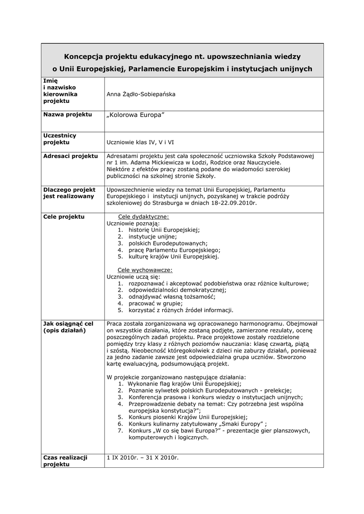 Koncepcja projektu edukacyjnego nt. upowszechniania wiedzy o Unii Europejskiej, Parlamencie Europejskim i instytucjach unijnych Imię i nazwisko kierownika projektu Anna Żądło-Sobiepańska Nazwa projektu „Kolorowa Europa” Uczestnicy projektu Uczniowie klas IV, V i VI Adresaci projektu Adresatami projektu jest cała społeczność uczniowska Szkoły Podstawowej nr 1 im. Adama Mickiewicza w Łodzi, Rodzice oraz Nauczyciele. Niektóre z efektów pracy zostaną podane do wiadomości szerokiej publiczności na szkolnej stronie Szkoły. Dlaczego projekt jest realizowany Upowszechnienie wiedzy na temat Unii Europejskiej, Parlamentu Europejskiego i instytucji unijnych, pozyskanej w trakcie podróży szkoleniowej do Strasburga w dniach 18-22.09.2010r. Cele projektu Cele dydaktyczne: Uczniowie poznają: 1. historię Unii Europejskiej; 2. instytucje unijne; 3. polskich Eurodeputowanych; 4. pracę Parlamentu Europejskiego; 5. kulturę krajów Unii Europejskiej. Cele wychowawcze: Uczniowie uczą się: 1. rozpoznawać i akceptować podobieństwa oraz różnice kulturowe; 2. odpowiedzialności demokratycznej; 3. odnajdywać własną tożsamość; 4. pracować w grupie; 5. korzystać z różnych źródeł informacji. Jak osiągnąć cel (opis działań) Praca została zorganizowana wg opracowanego harmonogramu. Obejmował on wszystkie działania, które zostaną podjęte, zamierzone rezulaty, ocenę poszczególnych zadań projektu. Prace projektowe zostały rozdzielone pomiędzy trzy klasy z różnych poziomów nauczania: klasę czwartą, piątą i szóstą. Nieobecność któregokolwiek z dzieci nie zaburzy działań, ponieważ za jedno zadanie zawsze jest odpowiedzialna grupa uczniów. Stworzono kartę ewaluacyjną, podsumowującą projekt. W projekcie zorganizowano następujące działania: 1. Wykonanie flag krajów Unii Europejskiej; 2. Poznanie sylwetek polskich Eurodeputowanych - prelekcje; 3. Konferencja prasowa i konkurs wiedzy o instytucjach unijnych; 4. Przeprowadzenie debaty na temat: Czy potrzebna jest wspólna europejska konstytucja?”; 5. Konkurs piosenki Krajów Unii Europejskiej; 6. Konkurs kulinarny zatytułowany „Smaki Europy” ; 7. Konkurs „W co się bawi Europa?” - prezentacje gier planszowych, komputerowych i logicznych. Czas realizacji projektu 1 IX 2010r. – 31 X 2010r. Przewidywany efekt (rezultat) 1. rysunki flag krajów Unii Europejskiej; 2. zdjęcia; 3. wykłady; 4. prezentacje; 5. debata; 6. gazetki ścienne; 7. odgrywanie ról; 8. debata; 9. potrawy kulinarne; 10. konferencja parsowa. Proponowana forma rozpowszechnienia rezultatów Wszystkie działania zostaną sfotografowane i rezulaty pracy można będzie oglądać na stronie Szkoły. Niektóre z efektów pracy zostaną pokazane podczas Święta Szkoły (konferencja prasowa i konkurs wiedzy o instytucjach unijnych, konkurs piosenki). Prace malarskie powstałe w wyniku realizacji projektu będą wyeksponowane w szkolnej galerii. Na debatę natomiast zostaną zaproszeni Nauczyciele i Rodzice uczący w szkole. JAKIMI REZULTATAMI MOŻE ZAKOŃCZYĆ SIĘ PROJEKT? Broszury reklamowe Analogie Anegdoty i historyjki Wystawa sztuki Targi sztuki Artykuły (dzienniki, magazyny, itp.) Nagrania audio Autobiografie Ballady Plakaty Skecze biograficzne Odbitki Obwoluty na książki Recenzje książek Broszury Gazetki ścienne Naklejki na zderzaki samochodowe Kreskówki Komiksy Analizy przypadku Tablice Książeczki dla dzieci Projekty ubrań Mundurki Collage Komentarze Reklamy telewizyjne i radiowe CD Programy komputerowe Mapy mentalne Debaty Opisy Pamiętniki Filmy dokumentalne Sztuki dramatyczne Przedstawienia literackie Artykuły redakcyjne Eseje Motta i slogany Filmy Freski Wystawy muzealne Potrawy etniczne Wystawy Tablice faktograficzne Bajki Gra zgadywanka Strony internetowe Ikony Ilustracje Instrukcje i wskazówki Wywiady Dzienniki Raporty z badań Konferencje Wykłady Listy (osobiste i formalne) Limeryki Logo Magazyny Mapy (geograficzne, pogody, skarbów) Modele Monologi Montaże Teledyski Kompozycje muzyczne Newslettery Gazety Notatki Kołysanki Prezentacje ustne Podkreślenia Prace malarskie Pamflety Panele dyskusyjne Pantomimy Parodie Wystawy fotograficzne Dzienniki z fotografiami z podpisami Plany Sztuki teatralne Wiersze Wystąpienia polityczne "Książki - układanki" Portfolio Wystawy plakatów Prezentacje (formalne i nieformalne) Propozycje rozwiązań Drzewa rodzinne Flagi Teatrzyk kukiełkowy Puzzle Quizy Audycje radiowe Przepisy Resume i listy wprowadzające Krytyka (programów TV, filmów itp.) Odgrywanie ról Plany zajęć Projekty naukowe Wydzieranki Skrypty Swoje Rzeźby "Kalambury" Krótkie historie Zrobienie scenografii (TV i teatr) Symulacje Pokaz slajdów Opery mydlane Pliki a dokumentacją Piosenki Przemówienia (formalne i zaimprowizowane) Materiały do rozdania Plany historii Streszczenia Talk-show (radio, TV) Lekcje Telegramy Kapsuły czasu Linie czasu Pokazy handlowe Przewodniki turystyczne Hołd T-shirty Video Afisze Strony internetowe Przykłady prac Wyszukiwarki słów Bajki ludowe Gry Przedstawienia graficzne Grafitti Harmonogram zrealizowanego projektu Co zostało zrealizowane? 1. Wykonanie flag krajów Unii Europejskiej. W jakim terminie? Przez kogo? wrzesień Klasa IV c i Vc 2. Poznanie sylwetek polskich Eurodeputowanych – prelekcje. listopad Klasa VIc 3. Konferencja prasowa i konkurs wiedzy o instytucjach unijnych. grudzień Klasa Vc i klasa VIc 4. Przeprowadzenie debaty na temat: ”Czy potrzebna jest wspólna europejska konstytucja?”. listopad Klasa VIc 5. Konkurs piosenki Krajów Unii Europejskiej. grudzień Klasy IV-VI 6. Konkurs kulinarny zatytułowany „Smaki Europy” . wrzesień Klasa Vc 7. Konkurs „W co się bawi Europa?” – prezentacje gier planszowych, komputerowych i logicznych. wrzesień Klasa V c 8. Komputerowe opracowanie tytułu projektu – „Kolorowa Europa”. wrzesień Klasy IV-VI 9. Lekcja otwarta: Członkowie krajów Unii Europejskiej listopad Klasa VI 