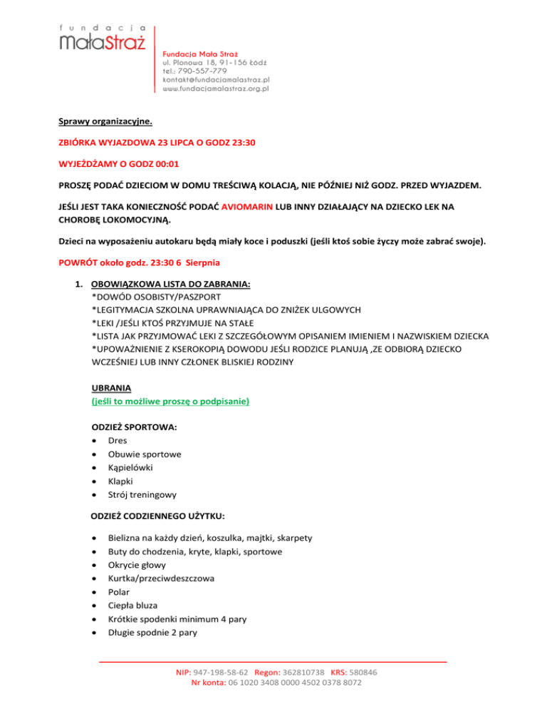 Fundacja Mała Straż ul. Plonowa 18, 91-156 Łódź tel.: 790-557-779 [email protected] www.fundacjamalastraz.org.pl Sprawy organizacyjne. ZBIÓRKA WYJAZDOWA 23 LIPCA O GODZ 23:30 WYJEŻDŻAMY O GODZ 00:01 PROSZĘ PODAĆ DZIECIOM W DOMU TREŚCIWĄ KOLACJĄ, NIE PÓŹNIEJ NIŻ GODZ. PRZED WYJAZDEM. JEŚLI JEST TAKA KONIECZNOŚĆ PODAĆ AVIOMARIN LUB INNY DZIAŁAJĄCY NA DZIECKO LEK NA CHOROBĘ LOKOMOCYJNĄ. Dzieci na wyposażeniu autokaru będą miały koce i poduszki (jeśli ktoś sobie życzy może zabrać swoje). POWRÓT około godz. 23:30 6 Sierpnia 1. OBOWIĄZKOWA LISTA DO ZABRANIA: *DOWÓD OSOBISTY/PASZPORT *LEGITYMACJA SZKOLNA UPRAWNIAJĄCA DO ZNIŻEK ULGOWYCH *LEKI /JEŚLI KTOŚ PRZYJMUJE NA STAŁE *LISTA JAK PRZYJMOWAĆ LEKI Z SZCZEGÓŁOWYM OPISANIEM IMIENIEM I NAZWISKIEM DZIECKA *UPOWAŻNIENIE Z KSEROKOPIĄ DOWODU JEŚLI RODZICE PLANUJĄ ,ZE ODBIORĄ DZIECKO WCZEŚNIEJ LUB INNY CZŁONEK BLISKIEJ RODZINY UBRANIA (jeśli to możliwe proszę o podpisanie) ODZIEŻ SPORTOWA: Dres Obuwie sportowe Kąpielówki Klapki Strój treningowy ODZIEŻ CODZIENNEGO UŻYTKU: Bielizna na każdy dzień, koszulka, majtki, skarpety Buty do chodzenia, kryte, klapki, sportowe Okrycie głowy Kurtka/przeciwdeszczowa Polar Ciepła bluza Krótkie spodenki minimum 4 pary Długie spodnie 2 pary NIP: 947-198-58-62 Regon: 362810738 KRS: 580846 Nr konta: 06 1020 3408 0000 4502 0378 8072 Fundacja Mała Straż ul. Plonowa 18, 91-156 Łódź tel.: 790-557-779 [email protected] www.fundacjamalastraz.org.pl HIGIENA OSOBISTA: Ręcznik plażowy Ręcznik kąpielowy Ręcznik do rąk i porannej higieny Przybory toaletowe (żel p/p, szczotka i pasta do zębów, szampon ) w przypadku dziewcząt szczotka do włosów i gumki , spinki itp. Chusteczki higieniczne, mokre chustki Piżama Klapki p/prysznic Krem do opalania z filtrem uv Krem, spray na komary INNE Podręczny plecak 140-250 zł ( w podpisanej kopercie, w nominałach po 10 zł) średnio 10-20 zł dziennie Koperta plus 1 znaczek na list zaadresowana do rodziców+ ew. znaczki na pocztówki z kartką adresową do babć, cioć itp. ;) którym mamy wysłać kartki Woda do picia na drogę (niegazowana) Max 2 kanapki na drogę , 1 owoc, (dojedziemy na śniadanie dzieci śpią w czasie podróży) PROSZĘ NIE DAWAĆ NA DROGĘ CHIPSÓW, SŁODYCZY, DUŻEJ LOŚCI OWOCÓW, ORAZ GAZOWANYCH NAPOJÓW. WARUNKI OGÓLNE I SPRZĘT ELEKTRONICZNY Proszę o niezabieranie telefonów komórkowych, laptopów, tabletów i tp. Mamy wakacje, dajmy sobie chwile odpocząć, jedziemy tam w innym celu!!!!!! Rodzice!!!! Bądźcie rozsądni, nie dajcie się namówić. Będą dostępne 3 telefony do kontaktu: P. Róża –wychowawca P. Anetka-wychowawca P. Emilka-Kierownik Kolonii Wszystkie numery tel. dostaną Państwo na karteczce w dniu wyjazdu wraz z adresem miejsca docelowego Jeśli ktoś nie dostosuje się do w/w zasad, zabiera sprzęt na własną odpowiedzialność. Opiekunowie nie będą pilnowali, szukali i ponosili odpowiedzialności gdy komuś zginie sprzęt lub zostanie skradziony. NIP: 947-198-58-62 Regon: 362810738 KRS: 580846 Nr konta: 06 1020 3408 0000 4502 0378 8072 Fundacja Mała Straż ul. Plonowa 18, 91-156 Łódź tel.: 790-557-779 [email protected] www.fundacjamalastraz.org.pl Telefony będą do dyspozycji dzieci w godzinach 8:00-9:00. 13;30-14;30 bądź na każdą prośbę dziecka w sytuacji kryzysu (tęsknoty;) W sprawach pilnych można dzwonić cały dzień (rozsądnie) Uczestnik, który podczas zajęć będzie używał tel. do gier i zabawy zostanie pozbawiony telefonu do końca pobytu. Uczestnik kolonii, który będzie zachowywał się w sposób niekulturalny, obraźliwy w stosunku do uczestników lub kadry zostanie upomniany podczas apelu, w sytuacjach powtarzających się zostanie wystosowany list do szkoły i rodziców. W przypadku zniszczeń mebli, mienia lub rzeczy należących do innego kolonisty rodzice pokrywają koszty szkód poniesionych przez ich dziecko. Uczestnik, który złamie regulamin oraz zasady kultury i bezpieczeństwa wraca do domu (rodzice odbierają dziecko na własny koszt). Będziemy chcieli by prócz zajęć strażackich dzieci i młodzież miały plan dnia wypełniony atrakcjami. Wprowadzimy zasady punktualności, samodzielności, obowiązkowości, odżywiania oraz edukację zdrowego odżywiania, jak i zdrowego stylu życia. PRZYKŁADOWY ROZKŁAD DNIA 8:00 -8:30 POBUDKA, TOALETA PORANNA, MYCIE ZĘBÓW, Gimnastyka 8:30 -9:00 PORZĄDKI W POKOJACH. 9:00 -9:30 ŚNIADANIE 9:30 -10:00 APEL 10:00-12:30 ZAJĘCIA PROGRAMOWE,/PLAŻA /BASEN 13:00 -13:30 OBIAD 2 DANIA 13:30-14:00 CISZA POPOŁUDNIOWA (CZAS NA TELEFON DO RODZICÓW) 14:00-16:00 PLAŻOWANIE 16:00-17:00 CZAS NA SPORT/ ZAJĘCIA TANECZNE 17:00-18:15 ZAJĘCIA STRAŻACKIE 18:30-19:00 KOLACJA 19:00-20:00 PIERWSZA POMOC NIP: 947-198-58-62 Regon: 362810738 KRS: 580846 Nr konta: 06 1020 3408 0000 4502 0378 8072 Fundacja Mała Straż ul. Plonowa 18, 91-156 Łódź tel.: 790-557-779 [email protected] www.fundacjamalastraz.org.pl 20:00-21:00 GITARA/ WSPÓLNE ŚPIEWANIE/CZAS RAZEM /PODSUMOWANIE DNIA, 21:00-21:20 APEL 21;20-22:00 PRZYGOTOWANIE DO CISZY (TOALETA, MYCIE ZĘBÓW) 22:00-7:00 CISZA NOCNA NIP: 947-198-58-62 Regon: 362810738 KRS: 580846 Nr konta: 06 1020 3408 0000 4502 0378 8072