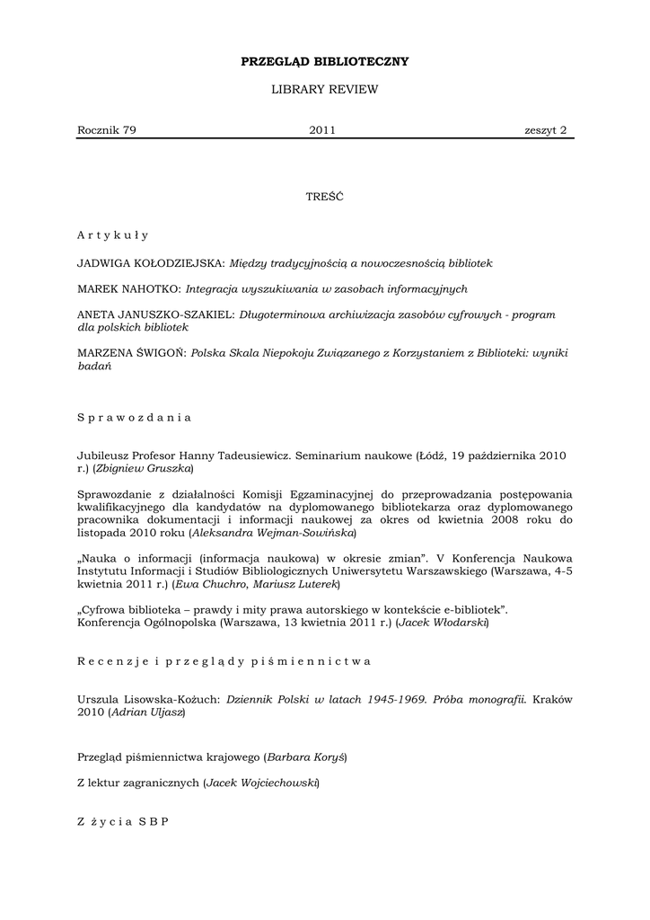 PRZEGLĄD BIBLIOTECZNY LIBRARY REVIEW Rocznik 79 2011 zeszyt 2 TREŚĆ Artykuły JADWIGA KOŁODZIEJSKA: Między tradycyjnością a nowoczesnością bibliotek MAREK NAHOTKO: Integracja wyszukiwania w zasobach informacyjnych ANETA JANUSZKO-SZAKIEL: Długoterminowa archiwizacja zasobów cyfrowych - program dla polskich bibliotek MARZENA ŚWIGOŃ: Polska Skala Niepokoju Związanego z Korzystaniem z Biblioteki: wyniki badań Sprawozdania Jubileusz Profesor Hanny Tadeusiewicz. Seminarium naukowe (Łódź, 19 października 2010 r.) (Zbigniew Gruszka) Sprawozdanie z działalności Komisji Egzaminacyjnej do przeprowadzania postępowania kwalifikacyjnego dla kandydatów na dyplomowanego bibliotekarza oraz dyplomowanego pracownika dokumentacji i informacji naukowej za okres od kwietnia 2008 roku do listopada 2010 roku (Aleksandra Wejman-Sowińska) „Nauka o informacji (informacja naukowa) w okresie zmian”. V Konferencja Naukowa Instytutu Informacji i Studiów Bibliologicznych Uniwersytetu Warszawskiego (Warszawa, 4-5 kwietnia 2011 r.) (Ewa Chuchro, Mariusz Luterek) „Cyfrowa biblioteka – prawdy i mity prawa autorskiego w kontekście e-bibliotek”. Konferencja Ogólnopolska (Warszawa, 13 kwietnia 2011 r.) (Jacek Włodarski) Recenzje i przeglądy piśmiennictwa Urszula Lisowska-Kożuch: Dziennik Polski w latach 1945-1969. Próba monografii. Kraków 2010 (Adrian Uljasz) Przegląd piśmiennictwa krajowego (Barbara Koryś) Z lektur zagranicznych (Jacek Wojciechowski) Z życia SBP Sprawozdanie z działalności Stowarzyszenia Bibliotekarzy Polskich w 2010 roku Z żałobnej karty Bartłomiej Szyndler (1938-2010) (Małgorzata Gorczyńska) Wskazówki dla autorów JADWIGA KOŁODZIEJSKA Biblioteka Narodowa MIĘDZY TRADYCYJNOŚCIĄ A NOWOCZESNOŚCIĄ BIBLIOTEK SŁOWA KLUCZOWE: Czytelnictwo w Polsce. Uwarunkowania społeczne. Uwarunkowania kulturowe. Modernizacja bibliotek. Edukacja. ABSTRAKT: Przedmiotem artykułu są uwarunkowania wpływające na rozwój czytelnictwa w społeczeństwie. Odnosząc się do wyników ogólnopolskiego badania czytelnictwa w Polsce z 2008 r. wskazujących na głęboki jego regres, autorka poszukuje przyczyn tego stanu rzeczy. Kwestionuje popularne przekonanie, iż podstawą podnoszenia poziomu czytelnictwa jest przede wszystkim techniczna modernizacja bibliotek. Wskazuje potrzebę dostosowania kolekcji bibliotecznych do rzeczywistych potrzeb czytelników. Zwraca uwagę na konieczność zapewniania fizycznej dostępności bibliotek w środowiskach wiejskich i małych miast. Pokazuje fundamentalne zależności między aktywnością czytelniczą a edukacją, zarówno szkolną, jak i nieformalną oraz przedszkolną, podkreślając jej zasadnicze znaczenie dla kształtowania nawyków czytelniczych. MAREK NAHOTKO Instytut Informacji Naukowej i Bibliotekoznawstwa Uniwersytet Jagielloński e-mail: [email protected] INTEGRACJA WYSZUKIWANIA W ZASOBACH INFORMACYJNYCH SŁOWA KLUCZOWE: Zintegrowane wyszukiwanie informacji. Wyszukiwarki internetowe. Katalogi biblioteczne. WorldCat. Google Books. Google Scholar. ABSTRAKT: W artykule przedstawiono prace służące ujednoliceniu środowiska wyszukiwania informacji naukowej dostępnej w Internecie i bibliotekach naukowych. Ponieważ wyszukiwanie zintegrowane (federated serach) nie funkcjonuje wystarczająco efektywnie w środowisku sieci globalnych, przedstawiono dwie inne drogi: integracja przez wyszukiwarkę Google Scholar oraz nowe prace nad wyszukiwaniem zintegrowanym w skali Webu, prowadzonym poprzez interfejs biblioteki. W artykule wskazano na zalety i wady obu rozwiązań oraz zaproponowano ich połączenie. ANETA JANUSZKO-SZAKIEL Krakowska Akademia im. Andrzeja Frycza Modrzewskiego e-mail: [email protected] DŁUGOTERMINOWA ARCHIWIZACJA ZASOBÓW CYFROWYCH - PROGRAM DLA POLSKICH BIBLIOTEK SŁOWA KLUCZOWE: Polskie zasoby cyfrowe. Archiwizacja zasobów cyfrowych. Narodowy program ochrony. Biblioteka Narodowa. Biblioteki polskie. ABSTRAKT: W artykule przedstawiono propozycję programu ochrony zasobów cyfrowych zgromadzonych w polskich instytucjach bibliotecznych. Uwzględniono w niej najistotniejsze normy i standardy długoterminowej archiwizacji wypracowane i rekomendowane przez instytucje pamięci krajów zaawansowanych w działaniach archiwizacyjnych. Odniesiono się również do możliwości i warunków polskich instytucji bibliotecznych. Program ma charakter hipotetycznego scenariusza przystąpienia polskich bibliotek do działań na rzecz zapewnienia długoterminowej użyteczności polskich zasobów cyfrowych. MARZENA ŚWIGOŃ Zakład Archiwistyki, Bibliotekoznawstwa i Informacji Naukowej Uniwersytet Warmińsko-Mazurski w Olsztynie e-mail: [email protected]; [email protected] POLSKA SKALA NIEPOKOJU ZWIĄZANEGO Z KORZYSTANIEM Z BIBLIOTEKI: WYNIKI BADAŃ SŁOWA KLUCZOWE: Polska Skala Niepokoju Związanego z Korzystaniem z Biblioteki. Biblioteka. Użytkownicy biblioteki. Lęk przed biblioteką. Library anxiety. Badania użytkowników. User studies. ABSTRAKT: W artykule zaprezentowano nowe narzędzie do badania poziomu tzw. lęku przed biblioteką (ang. library anxiety) nazwanego Polską Skalą Niepokoju Związanego z Korzystaniem z Biblioteki (P-LAS). Skala składa się z 46 stwierdzeń zgrupowanych w sześciu komponentach: bariery związane z personelem biblioteki, bariery afektywne, bariery związane z brakiem wiedzy o bibliotece, z brakiem komfortu w bibliotece, z brakiem źródeł w bibliotece oraz bariery technologiczne. Skala ta jest narzędziem bardziej odpowiednim do badań w polskich warunkach niż wzorce zagraniczne oraz bardziej dostosowanym do współczesnego środowiska bibliotecznego niż Library Anxiety Scale (LAS).