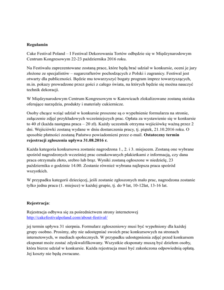 Regulamin Cake Festival Poland – I Festiwal Dekorowania Tortów odbędzie się w Międzynarodowym Centrum Kongresowym 22-23 października 2016 roku. Na Festiwalu zaprezentowane zostaną prace, które będą brać udział w konkursie, oceni je jury złożone ze specjalistów – sugarcrafterów pochodzących z Polski i zagranicy. Festiwal jest otwarty dla publiczności. Będzie mu towarzyszyć bogaty program imprez towarzyszących, m.in. pokazy prowadzone przez gości z całego świata, na których będzie się można nauczyć technik dekoracji. W Międzynarodowym Centrum Kongresowym w Katowicach zlokalizowane zostaną stoiska oferujące narzędzia, produkty i materiały cukiernicze. Osoby chcące wziąć udział w konkursie proszone są o wypełnienie formularza na stronie, załączenie zdjęć przykładowych wcześniejszych prac. Opłata za wystawienie się w konkursie to 40 zł (każda następna praca – 20 zł). Każdy uczestnik otrzyma wejściówkę ważną przez 2 dni. Wejściówki zostaną wydane w dniu dostarczenia pracy, tj. piątek, 21.10.2016 roku. O sposobie płatności zostaną Państwo powiadomieni przez e-mail. Ostateczny termin rejestracji zgłoszenia upływa 31.08.2016 r. Każda kategoria konkursowa zostanie nagrodzona 1., 2. i 3. miejscem. Zostaną one wybrane spośród nagrodzonych wcześniej prac oznakowanych plakietkami z informacją, czy dana praca otrzymała złoto, srebro lub brąz. Wyniki zostaną ogłoszone w niedzielę, 23 października o godzinie 14.00. Zostanie również wybrana najlepsza praca spośród wszystkich. W przypadku kategorii dziecięcej, jeśli zostanie zgłoszonych mało prac, nagrodzona zostanie tylko jedna praca (1. miejsce) w każdej grupie, tj. do 9 lat, 10-12lat, 13-16 lat. Rejestracja: Rejestracja odbywa się za pośrednictwem strony internetowej http://cakefestivalpoland.com/about-festival/ jej termin upływa 31 sierpnia. Formularz zgłoszeniowy musi być wypełniony dla każdej grupy osobno. Prosimy, aby nie udostępniać swoich prac konkursowych na stronach internetowych, w mediach społecznych. W przypadku udostępnienia zdjęć przed konkursem eksponat może zostać zdyskwalifikowany. Wszystkie eksponaty muszą być dziełem osoby, która bierze udział w konkursie. Każda rejestracja musi być zakończona odpowiednią opłatą. Jej koszty nie będą zwracane. Do zgłoszenia online muszą być dołączone przynajmniej 2 zdjęcia wcześniej wykonanych prac ( nie dotyczy kategorii dziecięcej ), najlepiej w danej kategorii konkursowej (niewymagane). Jeśli zostanie zarejestrowana większa liczba zgłoszeń niż przewidziana pojemność hali wystawowej, jury wybierze uczestników, którzy przejdą do drugiego etapu konkursu. Ten proces będzie przeprowadzony na podstawie zdjęć przesłanych podczas rejestracji. Każdy rejestrujący się będzie poinformowany e-mailem o przyjęciu zgłoszenia, a następnie o dalszych szczegółach. Osobom, które nie zostaną zakwalifikowane, zostanie zwrócone 90% opłaty. Dostawa pracy konkursowej: Wszystkie prace konkursowe muszą być dostarczone w piątek, 21 października w godzinach 16.00-18.00. Da to dość czasu sędziom na obejrzenie wszystkich eksponatów (konkurs trwa tylko 2 dni). Każdy uczestnik po przybyciu zarejestruje się, zostanie mu przydzielone miejsce na wystawienie eksponatu. Organizatorzy rezerwują sobie prawo do przeniesienia/przestawienia eksponatów w razie potrzeby. Będzie również dostępna przestrzeń do dokonania podstawowych napraw uszkodzeń, które mogły powstać podczas transportu. Uczestnicy proszeni są o przyniesienie swojego kompletu narzędzi. Pojemniki, w których były transportowanie eksponaty, muszą być usunięte z wystawy zaraz po dostawie oraz przywiezione z powrotem na odbiór eksponatu (przestrzeń na przechowywanie opakowań nie będzie dostępna). Każdy uczestnik może jednego pomocnika do rozstawienia wystawy. Po ustawieniu stanowiska należy natychmiast opuścić halę. Na wystawę można wrócić w sobotę (proszę mieć przy sobie wyjściówkę). Uczestnicy konkursu otrzymają potwierdzenia udziału (konieczne do przedstawienia w dniu przywiezienia pracy). Plakietki referencyjne uczestnika: Uczestnikowi wystawy zostaną wydane 2 plakietki (identyfikatory). Prosimy o doczepienie 1 plakietki do swojej pracy konkursowej, tak aby była widoczna dla sędziów, 2 natomiast prosimy doczepić do podstawy w celach bezpieczeństwa. Po doczepieniu plakietek prosi się uczestnika o ustawienie eksponatu na wyznaczonym miejscu (przydzielane wg grupy i nr). Po wyeksponowaniu swojego produktu otrzymają Państwo plakietkę uczestnika konkursu ( musi być ona noszona podczas trwania konkursu). Bezpieczeństwo: Pomimo zastosowania zasad bezpieczeństwa organizatorzy nie biorą odpowiedzialności za ewentualne uszkodzenia lub zgubienie eksponatu, sprzętu lub rzeczy osobistych. Prawa własności do twórczości: Biorąc udział w konkursie, wykonawca zezwala aby prace były fotografowane, a zdjęcia udostępniane i wykorzystywane przez organizatora w przyszłości. Zdjęcia: Zdjęcia zwycięskich prac mogą być publikowane w magazynach, mediach społecznościowych lub w telewizji. Usunięcie prac z wystawy: Wszystkie prace konkursowe muszą być usunięte po godzinie 17.00 w niedzielę, 23 października, nie wcześniej. Prace pozostawione po godzinie 18.00 zostaną zniszczone przez organizatora. Wyniki: Ocena prac zostanie dokonana w piątek przed otwarciem wystawy. Wyniki zostaną ogłoszone w sobotę do godziny 14.00. Spotkanie z sędziami: Aby dowiedzieć się, czym kierowali się sędziowie, należy z nimi porozmawiać w niedzielę. Zachęca się uczestników do rozmowy z przewodniczącym składu sędziowskiego, by uzyskać dalsze wskazówki i porady. Konsultacje po zakończeniu konkursu nie będą możliwe. Wytyczne konkursu: Każda praca powinna być samodzielną pracą uczestnika. Każdy eksponat powinien być oryginalny i niewystawiony nigdzie wcześn