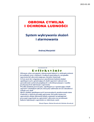 2015-01-30 OBRONA CYWILNA I OCHRONA LUDNOŚCI System wykrywania skażeń i alarmowania Andrzej Marjański Andrzej Marjański (89) 2 Refleksyjnie Głównym celem ostrzegania i alarmowania ludności w niebezpieczeństwie jest unikanie strat w ludziach i środkach materialnych w przypadku zagrożenia lub zdarzenia mającego charakter katastrofy. Cel ten może być osiągnięty przez umożliwienie ludziom działań zapobiegawczych, ograniczających skutki zagrożeń i zdarzeń oraz spowodowanie zachowań pożądanych w określonej sytuacji, w wyniku przekazanych im informacji o zagrożeniu. Wszelkie działania prewencyjne, zapobiegawcze i ograniczające skutki zagrożeń i zaistniałych zdarzeń, muszą być adekwatne do ich charakteru i rodzaju oraz skali. Oprócz działań zapobiegawczych i prewencyjnych, monitorowania stanu środowisk, w których powstają zagrożenia, niezwykle istotne jest zapewnienie obiegu informacji między organami zarządzającymi procesami reagowania na zagrożenia i zdarzenia oraz przekazanie ludności informacji o zagrożeniu we właściwym czasie. Henryk Papura, Marian Kowalewski, Bolesław Kowalczyk 1 2015-01-30 Andrzej Marjański (89) 3 Agenda Uwarunkowania prawne Podstawowe pojęcia Krajowy system wykrywania skażeń i alarmowania Zadania systemów Ćwiczenia i treningi ogólnokrajowe Alarmowanie i ostrzeganie Andrzej Marjański (89) 4 Ostrzeganie i alarmowanie – jako zadanie OC Jednym z zadań obrony cywilnej jest ostrzeganie i alarmowanie. Działa w ramach powszechnego systemu wczesnego ostrzegania i alarmowania. Podstawę stanowią syreny umiejscowione w obiektach Państwowej Straży Pożarnej, Ochotniczej Straży Pożarnej oraz w zakładach pracy. Najczęściej syreny włączane są elektronicznie ze stanowisk kierowania obroną cywilną. Jednym z przedsięwzięć obrony cywilnej jest instalowanie systemów alarmowych, które mogą ostrzegać ludność przed grożącym niebezpieczeństwem z powietrza oraz skażeniem promieniotwórczym i chemicznym w celu umożliwienia jej ukrycia się w przygotowanych budowlach lub pomieszczeniach ochronnych. 2 2015-01-30 Andrzej Marjański (89) 5 Podstawa prawna Andrzej Marjański (89) 6 Ostrzeganie i alarmowanie – uwarunkowania prawne Podstawa wydania rozporządzenia - art. 6 ust. 2 pkt 5 ustawy z dnia 21 listopada 1967 r. o powszechnym obowiązku obrony Rzeczypospolitej Polskiej Zakres - Rozporządzenie określa organizację i warunki przygotowania sposób funkcjonowania systemów: obserwacji, pomiarów, analiz, Prognozowania, Powiadamiania. 3 2015-01-30 Andrzej Marjański (89) 7 Podstawowe pojęcia 1. 2. 3. 4. 5. 6. 7. 8. 9. 10. 11. 12. 13. Alarm Alarmowanie Analiza skażeń Monitoring skażeń Obserwacja Ostrzeganie Pomiar Powiadamianie Prognozowanie Rozpoznawanie skażeń Skażenie Systemy wykrywania skażeń i alarmowania o skażeniach Systemy – systemy obserwacji, pomiarów, analiz, prognozowania skażeń i powiadamiania o skażeniach 14. Wykrywanie skażeń 15. Zakażenie Andrzej Marjański (89) 8 Alarm Sygnał z dowolnego źródła informujący, że: zostało wykryte skażenie lub wystąpiła sytuacja kryzysowa, które zaistniały na skutek: katastrofy naturalnej awarii technicznej, działań terrorystycznych zagrożenia wojennego lub wojny; 4 2015-01-30 Andrzej Marjański (89) 9 Alarmowanie działania mające na celu natychmiastowe przekazanie sygnału do właściwych terytorialnie władz, służb i do ludności na danym terenie, informującego o: zagrożeniu skażeniem, skażeniu lub o sytuacji kryzysowej, które zaistniały na skutek: katastrofy naturalnej lub awarii technicznej, działań terrorystycznych lub na skutek zagrożenia wojennego lub wojny Andrzej Marjański (89) 10 Analiza skażeń prowadzenie działań mających na celu określenie rodzaju skażenia oraz jego parametrów z wykorzystaniem: obserwacji, pomiarów standardowych procedur analitycznych; 5 2015-01-30 Andrzej Marjański (89) 11 Monitoring skażeń systematyczna obserwacja prowadzona w określonych geograficznie punktach lub obszarach w celu wykrywania uwolnionych do środowiska materiałów powodujących skażenie lub w celu stwierdzenia zmian stopnia tego skażenia; Andrzej Marjański (89) 12 Obserwacja prowadzenie działań, w określonych geograficznie punktach lub obszarach, mających na celu wykrycie: źródła skażenia lub ogniska zakażenia, miejsc uwolnienia do środowiska materiałów powodujących skażenie lub stwierdzenie zmian stopnia tego skażenia, jak też czasu jego powstania; 6 2015-01-30 Andrzej Marjański (89) 13 Ostrzeganie Działania mające na celu: przekazanie komunikatów i informacji uprzedzających o prawdopodobnych zagrożeniach zalecenie podjęcia działań zabezpieczających i ochronnych instruujące o sposobach wykonania takich działań; Andrzej Marjański (89) 14 Ostrzeganie Informacje te przekazywane są przez organy wykrywające lub ustalające stan zagrożenia organom odpowiedzialnym za uprzedzanie alarmowanie ludności, Mają na celu podjęcie działań zabezpieczających i ochronnych oraz instruujących o sposobach wykorzystania tych działań 7 2015-01-30 Andrzej Marjański (89) 15 Pomiar Prowadzenie w sposób ciągły lub w odstępach czasu, zdalnie lub w sposób bezpośredni, w określonych geograficznie punktach lub obszarach, działań mających na celu uzyskiwanie informacji na temat parametrów skażenia; Andrzej Marjański (89) 16 Powiadamianie Przekazanie, przy użyciu wszelkich dostępnych środków, określonych informacji mających na celu: zaalarmowanie właściwych władz i ludności o możliwości: wystąpienia zagrożenia, o jego wystąpieniu lub o ustąpieniu oraz przekazanie informacji dotyczących sposobu postępowania w danym przypadku; 8 2015-01-30 Andrzej Marjański (89) 17 Prognozowanie dokonywanie oceny rozwoju sytuacji będącej następstwem skażenia z jednoczesnym przewidywaniem i przedstawianiem możliwych skutków skażenia: środowiska naturalnego, w szczególno