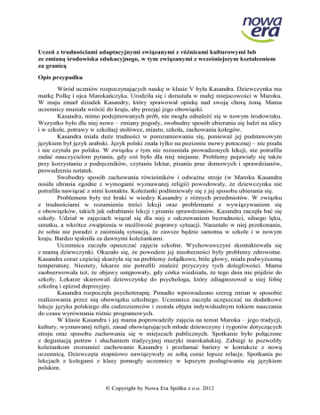Uczeń z trudnościami adaptacyjnymi związanymi z różnicami kulturowymi lub ze zmianą środowiska edukacyjnego, w tym związanymi z wcześniejszym kształceniem za granicą Opis przypadku Wśród uczniów rozpoczynających naukę w klasie V była Kasandra. Dziewczynka ma matkę Polkę i ojca Marokańczyka. Urodziła się i dorastała w małej miejscowości w Maroku. W maju zmarł dziadek Kasandry, który sprawował opiekę nad swoją chorą żoną. Mama uczennicy musiała wrócić do kraju, aby przejąć jego obowiązki. Kasandra, mimo podejmowanych prób, nie mogła odnaleźć się w nowym środowisku. Wszystko było dla niej nowe – zmiany pogody, swobodny sposób ubierania się ludzi na ulicy i w szkole, potrawy w szkolnej stołówce, miasto, szkoła, zachowania kolegów. Kasandra miała duże trudności w porozumiewaniu się, ponieważ jej podstawowym językiem był język arabski. Język polski znała tylko na poziomie mowy potocznej – nie pisała i nie czytała po polsku. W związku z tym nie rozumiała prowadzonych lekcji, nie potrafiła zadać nauczycielom pytania, gdy coś było dla niej niejasne. Problemy pojawiały się także przy korzystaniu z podręczników, czytaniu lektur, pisaniu prac domowych i sprawdzianów, prowadzeniu notatek. Swobodny sposób zachowania rówieśników i odważne stroje (w Maroku Kasandra nosiła ubrania zgodne z wymogami wyznawanej religii) powodowały, że dziewczynka nie potrafiła nawiązać z nimi kontaktu. Koleżanki podśmiewały się z jej sposobu ubierania się. Problemem były też braki w wiedzy Kasandry z różnych przedmiotów. W związku z trudnościami w rozumieniu treści lekcji oraz problemami z wywiązywaniem się z obowiązków, takich jak odrabianie lekcji i pisanie sprawdzianów, Kasandra zaczęła bać się szkoły. Udział w zajęciach wiązał się dla niej z odczuwaniem bezradności, silnego lęku, smutku, a wkrótce zwątpienia w możliwość poprawy sytuacji. Narastało w niej przekonanie, że sobie nie poradzi z zaistniałą sytuacją, że zawsze będzie samotna w szkole i w nowym kraju. Bardzo tęskniła za dawnymi koleżankami. Uczennica zaczęła opuszczać zajęcia szkolne. Wychowawczyni skontaktowała się z mamą dziewczynki. Okazało się, że powodem jej nieobecności były problemy zdrowotne. Kasandra coraz częściej skarżyła się na problemy żołądkowe, bóle głowy, miała podwyższoną temperaturę. Niestety, lekarze nie potrafili znaleźć przyczyny tych dolegliwości. Mama zaobserwowała też, że objawy ustępowały, gdy córka wiedziała, że tego dnia nie pójdzie do szkoły. Lekarze skierowali dziewczynkę do psychologa, który zdiagnozował u niej fobię szkolną i epizod depresyjny. Kasandra rozpoczęła psychoterapię. Ponadto wprowadzono szereg zmian w sposobie realizowania przez nią obowiązku szkolnego. Uczennica zaczęła uczęszczać na dodatkowe lekcje języka polskiego dla cudzoziemców i została objęta indywidualnym tokiem nauczania do czasu wyrównania różnic programowych. W klasie Kasandra i jej mama poprowadziły zajęcia na temat Maroka – jego tradycji, kultury, wyznawanej religii, zasad obowiązujących młode dziewczyny i rygorów dotyczących stroju oraz sposobu zachowania się w miejscach publicznych. Spotkanie było połączone z degustacją potraw i słuchaniem tradycyjnej muzyki marokańskiej. Zabiegi te pozwoliły koleżankom zrozumieć zachowanie Kasandry i przełamać bariery w kontakcie z nową uczennicą. Dziewczęta stopniowo nawiązywały ze sobą coraz lepsze relacje. Spotkania po lekcjach z kolegami z klasy pomogły uczennicy w lepszym posługiwaniu się językiem polskim. © Copyright by Nowa Era Spółka z o.o. 2012 Wychowawczyni wraz z pedagogiem szkolnym zorganizowali także współpracę wolontariuszek – gimnazjalistek z zaprzyjaźnionej szkoły, które pomagały Kasandrze w nauce. Karta Indywidualnych Potrzeb Ucznia Imię i nazwisko ucznia Kasandra **** Klasa, do której uczęszcza uczeń V Placówka zakładająca kartę Szkoła Podstawowa nr **** Podstawa założenia karty Placówka wystawiająca dokument Data wystawienia dokumentu/nr Przyjazd dziecka z zagranicy i podjęcie przez niego nauki w polskiej szkole. Brak. Brak. Data założenia karty **** Obserwacje zachowania uczennicy i stwierdzenie pogłębiających się trudności adaptacyjnych. Informacje od rodziców o problemach emocjonalnych i zdrowotnych dziewczynki. Specjalne potrzeby rozwojowe i edukacyjne, ze względu na które została założona karta Trudności adaptacyjne związane z różnicami kulturowymi lub ze zmianą środowiska edukacyjnego, w tym związane z wcześniejszym kształceniem za granicą. Mocne strony ucznia Łatwość w nawiązaniu kontaktu z dorosłymi (nauczycielami), dobry kontakt z psychoterapeutą, łatwość w uczeniu się języka polskiego. Zakres, w którym uczeń wymaga pomocy psychologiczno-pedagogicznej z uwagi na indywidualne potrzeby rozwojowe i edukacyjne oraz możliwości psychofizyczne Uczennica wymaga pomocy w nauce języka polskiego i w wyrównaniu różnic między posiadaną wiedzą a wymaganiami edukacyjnymi, wynikających z różnic programowych, wsparcia w nawiązaniu pozytywnych relacji z rówieśnikami oraz w radzeniu sobie z lękiem i niskim poczuciem własnej wartości, których może doświadczać w kontakcie ze szkołą. Formy pomocy Osoby odpowiedzialne za ich realizację Wymiar godzin Okresy udzielania pomocy Dodatkowe lekcje języka polskiego dla Osoby wyznaczone przez organ 2 godziny w tygodniu Bieżący rok szkolny. © Copyright by Nowa Era Spółka z o.o. 2012 cudzoziemców. prowadzący szkołę. Nauczanie indywidualne z wybranych przedmiotów łączone z nauczaniem włączającym. Nauczyciele wyznaczeni przez dyrektora szkoły. Spotkania indywidualne Psychoterapeuta z z psychologiem poradni. w poradni psychologicznopedagogicznej. 10 godzin tygodniowo (dotyczy zajęć indywidualnych) Bieżący rok szkolny. 1 godzina w tygodniu W miar