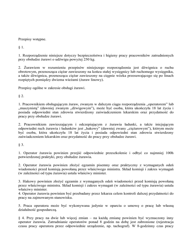 Przepisy wstępne. § 1. 1. Rozporządzenie niniejsze dotyczy bezpieczeństwa i higieny pracy pracowników zatrudnionych przy obsłudze żurawi o udźwigu powyżej 250 kg. 2. Żurawiem w rozumieniu przepisów niniejszego rozporządzenia jest dźwignica o ruchu obrotowym, przenosząca ciężar zawieszony na końcu stałej wysięgnicy lub ruchomego wysięgnika, a także dźwignica, przenosząca ciężar zawieszony na cięgnie wózka przesuwającego się po linach rozpiętych pomiędzy dwiema wieżami (żuraw linowy). Przepisy ogólne w zakresie obsługi żurawi. § 2. 1. Pracownikiem obsługującym żuraw, zwanym w dalszym ciągu rozporządzenia „operatorem” lub „maszynistą” (dawniej zwanym „dźwigowym”), może być osoba, która ukończyła 18 lat życia i posiada odpowiedni stan zdrowia stwierdzony zaświadczeniem lekarskim oraz przydatność do pracy przy obsłudze żurawi. 2. Pracownikiem zawieszającym i odczepiającym z żurawia ładunki, a także inicjującym odpowiedni ruch żurawia i ładunków jest „hakowy” (dawniej zwany „ciężarowym”), którym może być osoba, która ukończyła 18 lat życia i posiada odpowiedni stan zdrowia stwierdzony zaświadczeniem lekarskim oraz przydatność do pracy przy obsłudze żurawi. § 3. 1. Operator żurawia powinien przejść odpowiednie przeszkolenie i odbyć co najmniej 100h potwierdzonej praktyki, przy obsłudze żurawia. 2. Operator żurawia powinien złożyć egzamin pisemny oraz praktyczny z wymaganych odeń wiadomości przed komisją powołaną przez właściwego ministra. Skład komisji i zakres wymagań (w zależności od typu żurawia) ustala właściwy minister. 3. Hakowy powinien złożyć egzamin z wymaganych odeń wiadomości przed komisją powołaną przez właściwego ministra. Skład komisji i zakres wymagań (w zależności od typu żurawia) ustala właściwy minister. 4. Operator żurawia powinien być przebadany przez lekarza celem kontroli dalszej przydatności do pracy na zajmowanym stanowisku. 5. Praca operatora może być wykonywana jedynie w oparciu o umowę o pracę lub własną działalność gospodarczą. § 4. Przy pracy na dwie lub więcej zmian – na każdą zmianę powinien być wyznaczony inny operator żurawia. Zatrudnianie operatorów ponad 8 godzin na dobę jest zabronione (rejestracja czasu pracy operatora przez odpowiednie urządzenie, np. tachograf). W 8-godzinny czas pracy wliczona jest jedna 30-minutowa przerwa. 1. Operatorowi należy zapewnić odpowiednie zaplecze socjalne (pomieszczenie), w którym może się przebrać oraz pozostawić odzież roboczą i spożywać posiłki podczas przerwy. § 5. Dla każdego żurawia powinna być założona książka dyżurów, do której operator każdej zmiany wpisuje uwagi o stanie żurawia i jego urządzeń, zgodnie z instrukcją wydaną przez właściwego ministra. § 6. 1. Dla każdego żurawia powinna być założona książka kontroli. 2. Do książki kontroli wpisuje się wyniki wszystkich badań konstrukcji i urządzeń żurawia. 3. Rodzaje książek kontroli określa właściwy minister. 4. Przy odbiorze żurawia wieżowego musi być obecny operator z uprawnieniami IŻ. § 7. Operator żurawia jest odpowiedzialny za obsługę żurawia, za utrzymywanie urządzeń w stanie należytym i stosowanie się do instrukcji. § 8. Zabrania się dokonywania jakichkolwiek napraw lub prac konserwacyjnych w czasie ruchu żurawia. § 9. Oględziny, oczyszczanie i naprawa urządzeń elektrycznych może być dokonywana dopiero po wyłączeniu wyłącznika głównego żurawia lub po przerwaniu dopływu prądu przy pomocy wyłącznika samoczynnego. § 10. Operatorowi żurawia nie wolno: 1) zmieniać ustawienia wyłączników krańcowych; 2) zmieniać położenia lub ciężaru przeciwwagi; 3) dokonywać przemieszczeń lub przeróbek części składowych urządzeń żurawia; 4) przenosić ludzi na haku, chwytaku lub przenoszonym ciężarze. 5) Pracować podczas złych warunków atmosferycznych przy ograniczonej widoczności (np. śnieżyca, mgła, burza, obfite opady deszczu) i przy wietrze równym lub większym niż 14m/s. § 11. 1. W przypadku stwierdzenia braku lub uszkodzenia osłon i zabezpieczeń albo niewłaściwego działania jakichkolwiek urządzeń operator powinien bezzwłocznie przerwać pracę i zameldować o tym właścicielowi żurawia. 2. W przypadku stwierdzenia usterek, które mogą spowodować wypadek lub zniszczenie jakichkolwiek urządzeń, operator ma prawo odmówić uruchomienia żurawia i zameldować o tym bezpośredniemu przełożonemu. 3. Jeżeli operator stwierdzi, że dokonywanie przeładunku stwarza okoliczności niebezpieczne, powinien zameldować o tym bezpośredniemu przełożonemu i pracę przerwać aż do decyzji swoich przełożonych. § 12. Narzędzia lub inne przedmioty zabierane przez operatora do kabiny umieszczonej w górze powinny być przenoszone w specjalnej torbie lub podnoszone i opuszczane przy pomocy linki. Zrzucanie jakichkolwiek przedmiotów z wyżej położonych części żurawia jest zabronione. § 13. 1. Po zakończeniu remontu operator może rozpocząć pracę dopiero po otrzymaniu pisemnego zlecenia od właściciela żurawia. § 14. 1. Konserwację stałą urządzeń żurawia pod względem ich sprawności kierownictwo zakładu powinno powierzać konserwatorom z odpowiednimi uprawnieniami. 2. Kontrola mechanizmów żurawia powinna być dokonywana co najmniej co 30 dni oraz po każdorazowym 1-miesięcznym przestoju. 3. Żurawie starsze niż 25 lat, licząc wiek od daty produkcji, nie powinny być dopuszczane do użytku. § 15. Kierownictwo zakładu wyznacza bezpośrednich przełożonych nad operatorami. Do obowiązków przełożonych należy: 1) nadzór nad stanem urządzeń żurawia i zastosowanie odpowiednich środków celem usunięcia stwierdzonych braków; 2) nadzór nad racjonalną eksploatacją żurawia zgodnie z obowiązującymi przepisami, dotyczącymi ruchu i bezpieczeństwa; 3) nadzór nad prac
