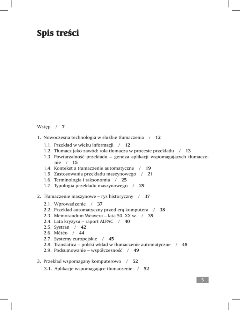 Spis treści Wstęp / 7 1. Nowoczesna technologia w służbie tłumaczenia / 12 1.1. Przekład w wieku informacji / 12 1.2. Tłumacz jako zawód: rola tłumacza w procesie przekładu / 13 1.3. Powtarzalność przekładu – geneza aplikacji wspomagających tłumaczenie / 15 1.4. Kontekst a tłumaczenie automatyczne / 19 1.5. Zastosowania przekładu maszynowego / 21 1.6. Terminologia i taksonomia / 25 1.7. Typologia przekładu maszynowego / 29 2. Tłumaczenie maszynowe – rys historyczny / 37 2.1. Wprowadzenie / 37 2.2. Przekład automatyczny przed erą komputera / 38 2.3. Memorandum Weavera – lata 50. XX w. / 39 2.4. Lata kryzysu – raport ALPAC / 40 2.5. Systran / 42 2.6. Météo / 44 2.7. Systemy europejskie / 45 2.8. Translatica – polski wkład w tłumaczenie automatyczne / 48 2.9. Podsumowanie – współczesność / 49 3. Przekład wspomagany komputerowo / 52 3.1. Aplikacje wspomagające tłumaczenie / 52 5 3.2. Pamięć tłumaczeniowa / 53 3.3. Najważniejsze aplikacje wspomagające przekład / 57 3.4. Działanie aplikacji wspomagających tłumaczenie / 59 3.5. Narzędzia terminologiczne / 66 3.6. Wady oprogramowania wspomagającego przekład / 68 3.7. Systemy hybrydowe / 69 4. Praktyczne aspekty przekładu automatycznego / 71 4.1. Tłumaczenie maszynowe a Internet / 71 4.2. Dialog a przekład maszynowy / 75 4.3. Ocena jakości przekładu maszynowego / 80 4.4. Kształcenie w zakresie przekładu wspomaganego komputerowo / 91 4.5. Lokalizacja oprogramowania komputerowego / 97 4.6. Korpusy językowe a przekład / 102 4.7. Wizje przyszłości – SATS, integracja, rozwiązywanie odwiecznych problemów / 104 Podsumowanie / 107 Bibliografia / 112 Niektóre systemy lokalizacji oprogramowania / 121 Niektóre systemy tłumaczenia maszynowego wykorzystujące język polski / 121 Główne stowarzyszenia tłumaczenia automatycznego / 122 Periodyki specjalistyczne poświęcone tłumaczeniu maszynowemu / 123 Indeks nazwisk / 124 Indeks rzeczowy (hasła w języku polskim i angielskim) / 127