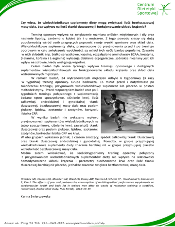 Czy wiesz, że wieloskładnikowe suplementy diety mogą zwiększać ilość beztłuszczowej masy ciała, bez wpływu na ilość tkanki tłuszczowej i funkcjonowanie układu krążenia? Trening oporowy wpływa na zwiększenie rozmiaru włókien mięśniowych i siły oraz nasilenie lipolizy, zarówno u kobiet jak i u mężczyzn. Z tego powodu cieszy się dużą popularnością wśród osób pragnących poprawić swoje wyniki sportowe oraz skład ciała. Wieloskładnikowe suplementy diety, przeznaczone do przyjmowania przed i po treningu oporowym w celu zwiększenia wydolności, są wśród tych osób bardzo popularne. Zawarte w nich składniki (np. białko serwatkowe, kazeina, rozgałęzione aminokwasy BCAA, kreatyna, β-alanina, kofeina i L-arginina) wykazują działanie ergogeniczne, jednakże nieznany jest ich wpływ na zdrowie, kiedy występują wspólnie. Celem badań była ocena łącznego wpływu treningu oporowego i dostępnych suplementów wieloskładnikowych na funkcjonowanie układu krążenia oraz skład ciała wytrenowanych mężczyzn. W ramach badań, 24 wytrenowanych mężczyzn odbyło 6 tygodniowy (3 razy w tygodniu) trening oporowy. Grupa badawcza, 15 minut przed i natychmiast po zakończeniu treningu, przyjmowała wieloskładnikowy suplement lub placebo w postaci maltodekstryny. Przed rozpoczęciem badań oraz po 6 tygodniach treningu połączonego z suplementacją badano tętno spoczynkowe, ciśnienie krwi, ilość całkowitej, androidalnej i gynoidalnej tkanki tłuszczowej, beztłuszczowej masy ciała oraz poziom glukozy, lipidów, azotanów i azotynów, kortyzolu i białka CRP. W wyniku badań nie wykazano wpływu przyjmowanych suplementów wieloskładnikowych na tętno spoczynkowe, ciśnienie krwi, zawartość tkanki tłuszczowej oraz poziom glukozy, lipidów, azotanów, azotynów, kortyzolu i białka CRP we krwi. W obu grupach wykazano jednak, z czasem znaczący, spadek całkowitej tkanki tłuszczowej oraz tkanki tłuszczowej androidalnej i gynoidalnej. Ponadto, w grupie przyjmującej wieloskładnikowe suplementy diety znacznie bardziej niż w grupie przyjmującej placebo wzrosła ilość beztłuszczowej masy ciała. Można zatem wnioskować, że sześciotygodniowy trening oporowy połączony z przyjmowaniem wieloskładnikowych suplementów diety nie wpływa na właściwości hemodynamiczne układu krążenia i parametry biochemiczne krwi oraz ilość tkanki tłuszczowej bardziej niż placebo, jednakże znacznie zwiększa beztłuszczową masę ciała. Ormsbee MJ, Thomas DD, Mandler WK, Ward EG, Kinsey AW, Panton LB, Scheett TP, Hooshmand S, Simonavice E, Kim J. The effects of pre- and post-exercise consumption of multi-ingredient performance supplements on cardiovascular health and body fat in trained men after six weeks of resistance training: a stratified, randomized, double-blind study. Nutr Metab, 2013; 10: 39 Karina Świerczewska Adres: ul. Pory 78 Tel: 721-963-323 www.portamedica.pl/cds