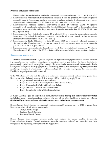 Przepisy dotyczące odznaczeń: 1. Ustawa z dnia 16 października 1992 roku o orderach i odznaczeniach (tj. Dz.U. 2015, poz. 475) 2. Rozporządzenie Prezydenta Rzeczypospolitej Polskiej z dnia 15 grudnia 2004 roku w sprawie szczegółowego trybu postępowania w sprawach o nadanie orderów i odznaczeń oraz wzorów odpowiednich dokumentów (Dz. U. 2004 r. Nr 277 , poz. 2743, z późn. zm.); 3. Rozporządzenie Ministra Edukacji Narodowej z dnia 20 września 2000r. w sprawie szczegółowych zasad nadawania „Medalu Komisji Edukacji Narodowej”, trybu przedstawiania wniosków, wzoru medalu, trybu jego wręczania i sposobu noszenia (Dz. U. 2000r. Nr 99, poz. 1073 z późn. zm.). 4. Rozporządzenie Rady Ministrów z dnia 23 grudnia 2003 r. w sprawie ustanowienia odznaki honorowej „Za zasługi dla ochrony zdrowia”, ustalenia jej wzoru, zasad i trybu nadawania oraz sposobu noszenia (Dz. 2004 r. Nr 1 poz. 1) 5. Rozporządzenie Rady Ministrów z dnia 27 maja 2003 r. w sprawie odznaki honorowej „Za zasługi dla Wynalazczości”, jej wzoru, zasad i trybu nadawania oraz sposobu noszenia. (Dz. U. 2003 r. Nr 112, poz. 1062). 6. Regulamin nadawania medalu i odznak honorowych Uniwersytetu Medycznego we Wrocławiu (Zarządzenie Nr 45 z dnia 27.06.2013 r. Rektora Uniwersytetu Medycznego we Wrocławiu) Odznaczenia państwowe 1. Order Odrodzenia Polski - jest to nagroda za wybitne zasługi położone w służbie Państwu i społeczeństwu, tj.: wybitne osiągnięcia w podejmowanej z pożytkiem dla kraju działalności państwowej i publicznej, szczególne zasługi dla umacniania suwerenności i obronności kraju, szczególne zasługi dla rozwoju gospodarki narodowej, służby publicznej oraz wybitną twórczość naukową, literacką i artystyczną i wybitne zasługi dla rozwoju współpracy Rzeczypospolitej Polskiej z innymi państwami i narodami; Order Odrodzenia Polski (art. 12 ustawy o orderach i odznaczeniach), ustanowiony przez Sejm Rzeczypospolitej Polskiej ustawą z dnia 4 lutego 1921r., dzieli się na pięć klas: - Krzyż Wielki Orderu Odrodzenia Polski, - Krzyż Komandorski z Gwiazdą Orderu Odrodzenia Polski, - Krzyż Komandorski Orderu Odrodzenia Polski, - Krzyż Oficerski Orderu Odrodzenia Polski, - Krzyż Kawalerski Orderu Odrodzenia Polski. 2. Krzyż Zasługi - jest to nagroda dla osób, które położyły zasługi dla Państwa lub obywateli spełniając czyny przekraczające zakres ich zwykłych obowiązków, a także za ofiarną działalność publiczną, ofiarne niesienie pomocy oraz działalność charytatywną. Krzyż Zasługi (art. 16 ustawy o orderach i odznaczeniach), ustanowiony w 1923 r. przez Sejm Rzeczypospolitej, dzieli się na trzy stopnie: - Złoty Krzyż Zasługi, - Srebrny Krzyż Zasługi, - Brązowy Krzyż Zasługi. Krzyż Zasługi tego samego stopnia może być nadany tej samej osobie dwukrotnie. Przed nadaniem Krzyża Zasługi wyższego stopnia powinny upłynąć co najmniej trzy lata; odstępstwo od tej zasady jest dopuszczalne wyjątkowo. 3. Medal Za Długoletnią Służbę - jest to nagroda za wzorowe, wyjątkowo sumienne wykonywanie obowiązków wynikających z pracy zawodowej w służbie Państwa. Medal za Długoletnią Służbę dzieli się na trzy stopnie: I stopień - Medal Złoty za Długoletnią Służbę, po 30 – latach pracy zawodowej II stopień - Medal Srebrny za Długoletnią Służbę, po 20 – latach pracy zawodowej III stopień - Medal Brązowy za Długoletnią Służbę, po 10 – latach pracy zawodowej Odznaczenia resortowe 1. Medal Komisji Edukacji Narodowej nadaje minister właściwy do spraw oświaty (na podstawie rozporządzenia Ministra Edukacji Narodowej z dnia 20 września 2000 r. w sprawie szczegółowych zasad nadawania „Medalu Komisji Edukacji Narodowej”, trybu przedstawiania wniosków, wzoru medalu, trybu jego wręczania i sposobu noszenia (Dz. U. 2000 r. nr 99, poz. 1073 z późn. zm.) za szczególne zasługi dla oświaty i wychowania, w szczególności w zakresie działalności dydaktycznej, wychowawczej i opiekuńczej, twórczości dla dzieci i młodzieży oraz kształcenia i doskonalenia nauczycieli: - autorom wybitnych prac pedagogicznych, wyróżniających się nowatorskich podręczników i pomocy naukowych, - nauczycielom legitymującym się co najmniej siedmioletnią wyróżniającą się działalnością dydaktyczną, wychowawczą i opiekuńczą, inicjującym i podejmującym nowatorskie formy i metody pracy edukacyjnej, - autorom utworów literackich, popularnonaukowych, dzieł scenicznych, muzycznych, plastycznych, filmowych, widowisk telewizyjnych i audycji radiowych, które wywierają szczególnie wartościowy wpływ wychowawczy na dzieci i młodzież, - nauczycielom akademickim legitymującym się wybitnym dorobkiem w zakresie oświaty i wychowania, - działaczom społecznym i związkowym, fundatorom oraz innym osobom, których działalność wydatnie przyczynia się do rozwoju oświaty i wychowania, - wyróżniającym się pracownikom nadzoru i doradztwa pedagogicznego oraz doskonalenia zawodowego nauczycieli, - obywatelom polskim mieszkającym za granicą, cudzoziemcom i innym osobom, którzy swoją działalnością przyczyniają się do promowania Polski za granicą i rozwoju współpracy międzynarodowej w zakresie oświaty i wychowania, - innym osobom legitymującym się wybitnym, uznanym dorobkiem w zakresie oświaty i wychowania. 2. Odznaka honorowa „Za zasługi dla ochrony zdrowia” jest szczególnym wyróżnieniem nadawanym przez ministra właściwego do spraw zdrowia na podstawie Rozporządzenia Rady Ministrów z dnia 23 grudnia 2003 r. w sprawie ustanowienia odznaki honorowej „Za zasługi dla ochrony zdrowia”, ustalenia jej wzoru, zasad i trybu nadawania oraz sposobu noszenia. Odznaka może być nadana (Dz. U.2004, Nr 1 poz. 1) Może być nadawana osobom fizycznym w uznaniu ich osiągnięć w zakresie: - wprowadzania postępu w metodach diagnostycznych, terapeutycznych i rehabilitacyjnych; - ochr
