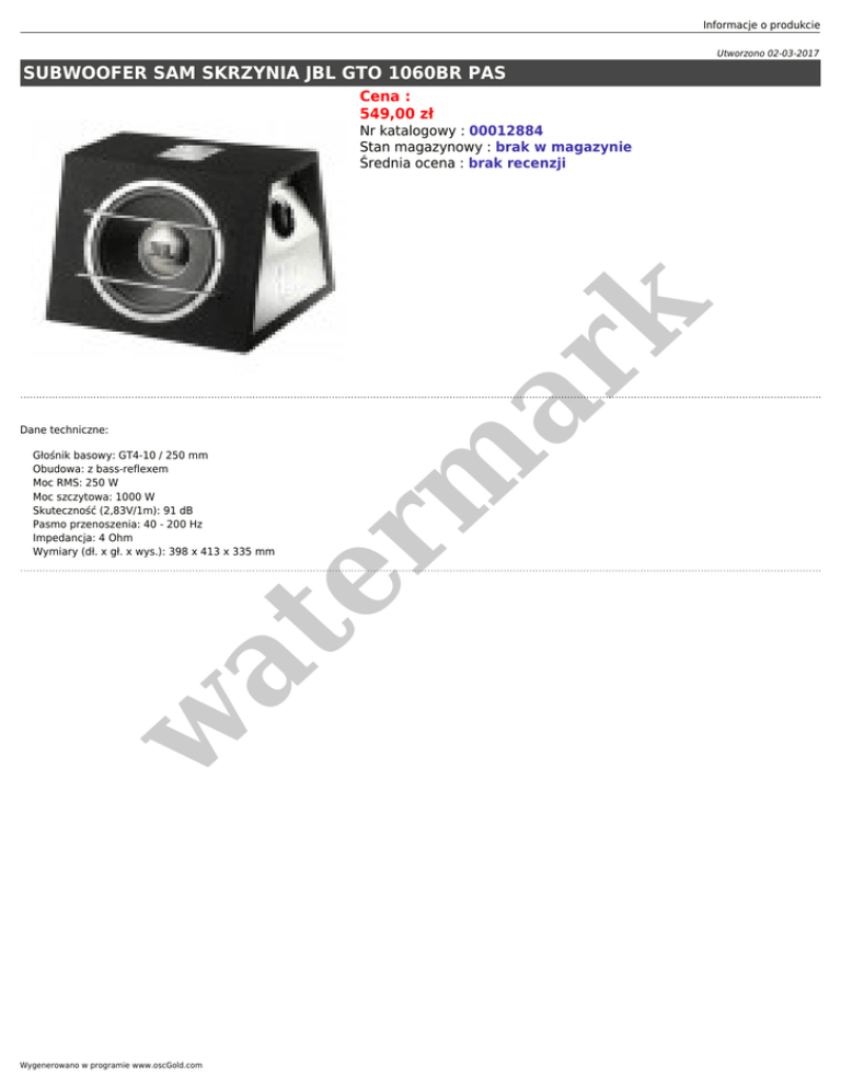 Informacje o produkcie Utworzono 02-03-2017 SUBWOOFER SAM SKRZYNIA JBL GTO 1060BR PAS Cena : 549,00 zł er m ar k Nr katalogowy : 00012884 Stan magazynowy : brak w magazynie Średnia ocena : brak recenzji Dane techniczne: w at Głośnik basowy: GT4-10 / 250 mm Obudowa: z bass-reflexem Moc RMS: 250 W Moc szczytowa: 1000 W Skuteczność (2,83V/1m): 91 dB Pasmo przenoszenia: 40 - 200 Hz Impedancja: 4 Ohm Wymiary (dł. x gł. x wys.): 398 x 413 x 335 mm Wygenerowano w programie www.oscGold.com