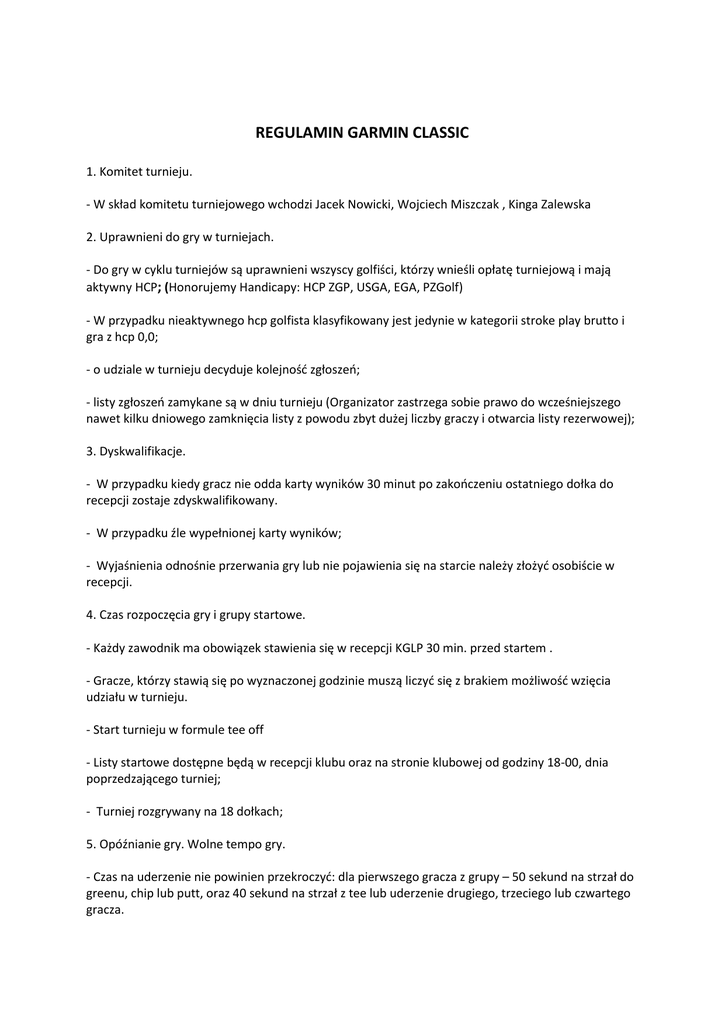 REGULAMIN GARMIN CLASSIC 1. Komitet turnieju. - W skład komitetu turniejowego wchodzi Jacek Nowicki, Wojciech Miszczak , Kinga Zalewska 2. Uprawnieni do gry w turniejach. - Do gry w cyklu turniejów są uprawnieni wszyscy golfiści, którzy wnieśli opłatę turniejową i mają aktywny HCP; (Honorujemy Handicapy: HCP ZGP, USGA, EGA, PZGolf) - W przypadku nieaktywnego hcp golfista klasyfikowany jest jedynie w kategorii stroke play brutto i gra z hcp 0,0; - o udziale w turnieju decyduje kolejność zgłoszeń; - listy zgłoszeń zamykane są w dniu turnieju (Organizator zastrzega sobie prawo do wcześniejszego nawet kilku dniowego zamknięcia listy z powodu zbyt dużej liczby graczy i otwarcia listy rezerwowej); 3. Dyskwalifikacje. - W przypadku kiedy gracz nie odda karty wyników 30 minut po zakończeniu ostatniego dołka do recepcji zostaje zdyskwalifikowany. - W przypadku źle wypełnionej karty wyników; - Wyjaśnienia odnośnie przerwania gry lub nie pojawienia się na starcie należy złożyć osobiście w recepcji. 4. Czas rozpoczęcia gry i grupy startowe. - Każdy zawodnik ma obowiązek stawienia się w recepcji KGLP 30 min. przed startem . - Gracze, którzy stawią się po wyznaczonej godzinie muszą liczyć się z brakiem możliwość wzięcia udziału w turnieju. - Start turnieju w formule tee off - Listy startowe dostępne będą w recepcji klubu oraz na stronie klubowej od godziny 18-00, dnia poprzedzającego turniej; - Turniej rozgrywany na 18 dołkach; 5. Opóźnianie gry. Wolne tempo gry. - Czas na uderzenie nie powinien przekroczyć: dla pierwszego gracza z grupy – 50 sekund na strzał do greenu, chip lub putt, oraz 40 sekund na strzał z tee lub uderzenie drugiego, trzeciego lub czwartego gracza. - Poza putting green’em czas na uderzenie rozpoczyna się od momentu, gdy zawodnik miał wystarczającą ilość czasu na dojście do piłki, jest to jego kolej gry i może wykonać uderzenie bez zakłóceń zewnętrznych. Czas spędzony na pomiarze odległości zaliczany jest do czasu na uderzenie. - Na putting green’ie czas na uderzenie rozpoczyna się od momentu gdy zawodnik miał wystarczającą ilość czasu na podniesienie, oczyszczenie i odłożenie piłki, naprawienie śladów po piłkach i starych dołkach, usunięcie naturalnych utrudnień ruchomych na swojej linii puttingu. Czas spędzony na odczytywaniu linii puttingu zaliczany jest do czasu na uderzenie. - Jeżeli którykolwiek z graczy przekroczy ten czas, będzie on uważany za opóźniającego grę i otrzyma -trzecie wykroczenie: dwa uderzenia karne, 6. Zawieszenie gry. - Jeżeli Komitet Turnieju stwierdzi, że istnieją powody uniemożliwiające grę, może zarządzić czasowe zawieszenie gry lub unieważnić grę i wszystkie wyniki danej rundy. a) natychmiastowe przerwanie gry: jeden długi sygnał syreny: Jeżeli zawodnicy znajdują się między dołkami, nie wolno im rozpocząć gry do czasu wznowienia jej przez Komitet Turnieju. Jeżeli zawodnicy są w trakcie rozgrywania dołka, muszą niezwłocznie przerwać grę .Jeżeli zawodnik nie przerwie gry natychmiast, zostanie zdyskwalifikowany, chyba, że okoliczności dadzą podstawy do odstąpienia od takiej kary, b) przerwanie gry: trzy następujące po sobie sygnały syreny: Jeżeli zawodnicy znajdują się między dołkami, nie wolno im rozpocząć gry do czasu wznowienia jej przez Komitet Turnieju. Jeżeli zawodnicy są w trakcie rozgrywania dołka, mogą przerwać grę natychmiast lub kontynuować ją, pod warunkiem, ze zrobią to bez opóźniania. Jeżeli zdecydują się na kontynuowanie gry danego dołka, mogą ją przerwać w dowolnym momencie przed zakończeniem dołka, c )w każdym przypadku gra musi być przerwana po zakończeniu danego dołka . Gracze muszą wznowić grę, gdy Komitet Turnieju ogłosi jej wznowienie. 7. Zdawanie kart wyników. - jeżeli gracz nie zda swojej karty 30 minut po zakończeniu ostatniego dołka, może zostać zdyskwalifikowany, chyba, że okoliczności dadzą podstawy do odstąpienia od takiej kary - marker zobowiązany jest do wpisania wyników brutto na kartę wyników swoich i gracza którego kartę posiada. - Odpowiedzialność za podanie poprawnych i kompletnych wyników oraz za złożenie poprawnych podpisów na kartach ponosi gracz. 8. Tees; Mężczyźni – żółte, Kobiety – czerwone damskie, Juniorzy do lat 12 – czerwone damskie. 9. Zasady dogrywek oraz rozstrzygania remisów. Rozstrzyganie remisów odbywa się na podstawie uzyskanych wyników na następujących dołkach: - lepszy wynik na 9 ostatnich dołkach, - lepszy wynik na 6 ostatnich dołkach, - lepszy wynik na 3 ostatnich dołkach, - lepszy wynik brutto na ostatnim dołku, - lepszy wynik brutto na przedostatnim dołku, - za ostatni dołek przyjmuje się dołek numer 18. 10. HCP turniejowy. - W sytuacji kiedy komitet turniejowy nie jest w stanie znaleźć w systemie zapisu dotyczącego aktualnego hcp gracza i sam grający nie wie jaki ma aktualny hcp, wówczas na podstawie zebranych informacji przez komitet zostaje mu przyznany hcp 0. 11. Klasyfikacje i nagrody; - Golfiści będą klasyfikowani w tych grupach, w których rozpoczęli pierwszy turniej. Zmiana hcp nie przenosi gracza do innej grupy. 12. Sprzęt elektroniczny. - Używanie krótkofalówek, telefonów komórkowych oraz pagerów w trakcie gry jest zabronione. Używanie telefonów komórkowych dozwolone jest wyłącznie w celu skontaktowania się Komitetem Turnieju. - Dozwolone jest korzystanie z mierników odległości, pod warunkiem że nie mają funkcji pomiaru różnic wysokości, temperatury, prędkości i kierunek wiatru. 13. Wózki golfowe samojezdne. - Używanie wózków golfowych samojezdnych typu club car podczas rundy turniejowej jest dozwolone; 14. Caddies. - Każdy gracz może mieć jednego caddiego w danym czasie 15. Klasyfikacje turniejowe. stroke play brutto 0 – 12,0; stroke play netto 12,1 – 24,0; stableford netto 24,1 – 56,0; 16. Nagroda rzeczowa jest przyznawa