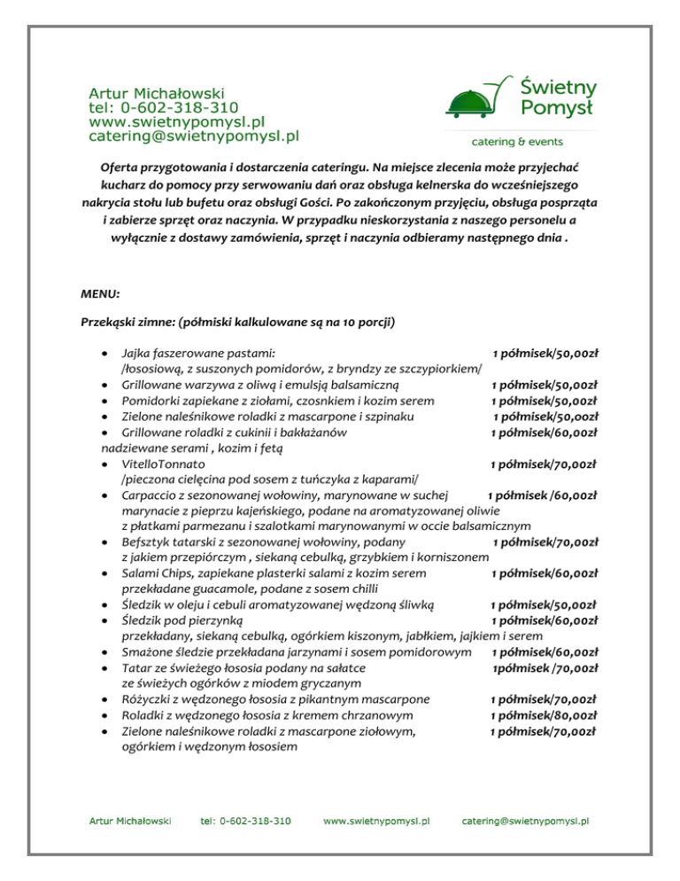Oferta przygotowania i dostarczenia cateringu. Na miejsce zlecenia może przyjechać kucharz do pomocy przy serwowaniu dań oraz obsługa kelnerska do wcześniejszego nakrycia stołu lub bufetu oraz obsługi Gości. Po zakończonym przyjęciu, obsługa posprząta i zabierze sprzęt oraz naczynia. W przypadku nieskorzystania z naszego personelu a wyłącznie z dostawy zamówienia, sprzęt i naczynia odbieramy następnego dnia . MENU: Przekąski zimne: (półmiski kalkulowane są na 10 porcji) Jajka faszerowane pastami: 1 półmisek/50,00zł /łososiową, z suszonych pomidorów, z bryndzy ze szczypiorkiem/ Grillowane warzywa z oliwą i emulsją balsamiczną 1 półmisek/50,00zł Pomidorki zapiekane z ziołami, czosnkiem i kozim serem 1 półmisek/50,00zł Zielone naleśnikowe roladki z mascarpone i szpinaku 1 półmisek/50,oozł Grillowane roladki z cukinii i bakłażanów 1 półmisek/60,00zł nadziewane serami , kozim i fetą VitelloTonnato 1 półmisek/70,00zł /pieczona cielęcina pod sosem z tuńczyka z kaparami/ Carpaccio z sezonowanej wołowiny, marynowane w suchej 1 półmisek /60,00zł marynacie z pieprzu kajeńskiego, podane na aromatyzowanej oliwie z płatkami parmezanu i szalotkami marynowanymi w occie balsamicznym Befsztyk tatarski z sezonowanej wołowiny, podany 1 półmisek/70,00zł z jakiem przepiórczym , siekaną cebulką, grzybkiem i korniszonem Salami Chips, zapiekane plasterki salami z kozim serem 1 półmisek/60,00zł przekładane guacamole, podane z sosem chilli Śledzik w oleju i cebuli aromatyzowanej wędzoną śliwką 1 półmisek/50,00zł Śledzik pod pierzynką 1 półmisek/60,00zł przekładany, siekaną cebulką, ogórkiem kiszonym, jabłkiem, jajkiem i serem Smażone śledzie przekładana jarzynami i sosem pomidorowym 1 półmisek/60,00zł Tatar ze świeżego łososia podany na sałatce 1półmisek /70,00zł ze świeżych ogórków z miodem gryczanym Różyczki z wędzonego łososia z pikantnym mascarpone 1 półmisek/70,00zł Roladki z wędzonego łososia z kremem chrzanowym 1 półmisek/80,00zł Zielone naleśnikowe roladki z mascarpone ziołowym, 1 półmisek/70,00zł ogórkiem i wędzonym łososiem Wyroby wiejskie i domowe: /gramatura wyrobów ok.1kg/półmisek/ Wybór pasztetów domowych podanych z sosem cumberland Wybór serów korycińskich podanych z owocami i żurawiną Wybór wiejskich kiełbas wędzonych, podanych musztardą sarepską i domowymi marynatami Wybór wiejskich wędlin wędzonych, podanych z chrzanem i domowymi marynatami Wybór pieczonych mięs (uprzednio zamarynowanych) podanych z ćwikłą, chrzanem i domowymi marynatami 1 półmisek/60,00zł 1 półmisek/70,00zł 1 półmisek/60,00zł 1 półmisek/80,00zł 1 półmisek/90,00zł Pasty, dipy, sosy, do warzyw, mięs i pieczywa:miseczka/200g-250g Hummus: 1 miseczka/15,oozł /pasta z ciecierzycy z sezamem, czosnkiem, sokiem z cytryny i natką pietruszki/ Melizanosalata: /pasta z pieczonego bakłażana, oliwy, 1 miseczka/15,00zł natki pietruszki, cebuli, czosnku i orzechów włoskich Tzatzyki:1 miseczka/15,00zł /grecki sos jogurtowo-czosnkowy z dodatkiem świeżego ogórka mięty/ Hiszpański sos czosnkowy Aioli:1 miseczka /15,00zł /w wersji z kolendrą lub szczypiorkiem/ Salsa pomidorowa z mango i kolendrą 1 miseczka/15,00zł Tapenada: 1 miseczka/20,00zł /pasta z czarnych oliwek, kaparów, anchovies, orzechów włoskich/ Guacamole : 1 miseczka/20,00zł /meksykański sos z avocado z sokiem z cytryny, czosnkiem, chilli, oliwą i kolendrą/ Sos serowy „Cheddar” 1 miseczka/20,00zł Sałatki: Oryginalna sałatka „Ceasar” z sałaty rzymskiej 1 misa/65,00zł z pieczonym kurczakiem, grzankami i sosem z parmezany, anchovies i oliwy Sałatka „Ceasar” z krewetkami królewskimi 1 misa/85,00zł Bukiet sałat z wędzoną kaczką, filetowanymi pomarańczami 1 misa/65,00zł i żurawiną, podany z cytrusowym sosem vinnaigrette Sałatka z młodych listków szpinaku z grillowaną katalońską Chorizzo 1 misa/65,00zł z suszonymi pomidorami , z sosem vinnaigette miodowo-musztardowym Bukiet sałat z kurczakiem pieczonym w miodzie i orzechach włoskich 1 misa/65,00zł z miodowo musztardowym sosem vinnaigrette Sałatka „Szopska” ze świeżych warzyw z serem feta i oliwkami 1 misa/65,00zł z sosem vinnaigrette Sałatka z rucoli z grillowanym oscypkiem i żurawiną 1 misa/65,00zł z malinową vinnaigrettą Sałatka z kozim serem, suszonymi pomidorami 1 misa/65,00zł i cebulkami marynowanymi w balsamico, podana z balsamiczną vinnaigrettą Sałatka z pieczonym łososiem marynowanym w sosie Teriyaki, z marynowanym imbirem i chrupiącymi kiełkami fasolki Sałatka „Rozmaitości” z grillowanym kurczakiem i serem feta 1 misa/65,00zł Przekąski gorące: Wędzona śliwka kalifornijska zapiekana w plastrach boczku Mini tortille z indykiem i warzywami Zapiekane jajka faszerowane Tiftele z dodatkiem jagnięciny doprawione ziołami Panierowane, smażone paluszki krabowe 20szt./60,00zł 20szt./80,00zł 20szt. /50,00zł 20szt./50,00zł 20szt./60,00zł Zupy: Krem z dyni z imbirem i zacierkami 1 porcja/8,00zł Krem cebulowy z grzanką zapiekaną z mozzarellą i parmezanem 1 porcja/8,00zł Krem z pomidorów z bazylią i paluszkami grissini 1 porcja/8,00zł Krem ziemniaczany z porami i bekonem z grzankami ziołowymi 1 porcja/8,00zł Zupa z soczewicy i suszonych pomidorów , podana z grzankami 1 porcja/10,00zł Zupa czosnkowa z kremową śmietaną podana z grzankami 1 porcja/10,00zł Chłodnik litewski z botwinką, (zupa sezonowa) 1porcja/10,00zł rzodkiewką, ogórkiem, szczypiorkiem i gotowanym jajkiem Meksykańska, pikantna zupa Taco z mięsem, 1 porcja/12,00zł pomidorami i mozzarellą, podana z kukurydzianymi nachos Zupa z pieczonej papryki z avocado, śmietanką i nachos 1 porcja/12,00zł Krem serowy „Cheddar” z paluszkami grissini 1 porcja/12,00zł Rosół domowy z makaronem 1 porcja/12,00zł /gotowany z 3 rodzajów mięs: cielęciny, drobiu, wołowiny z dużą ilością jarzyn/ Żurek chłops