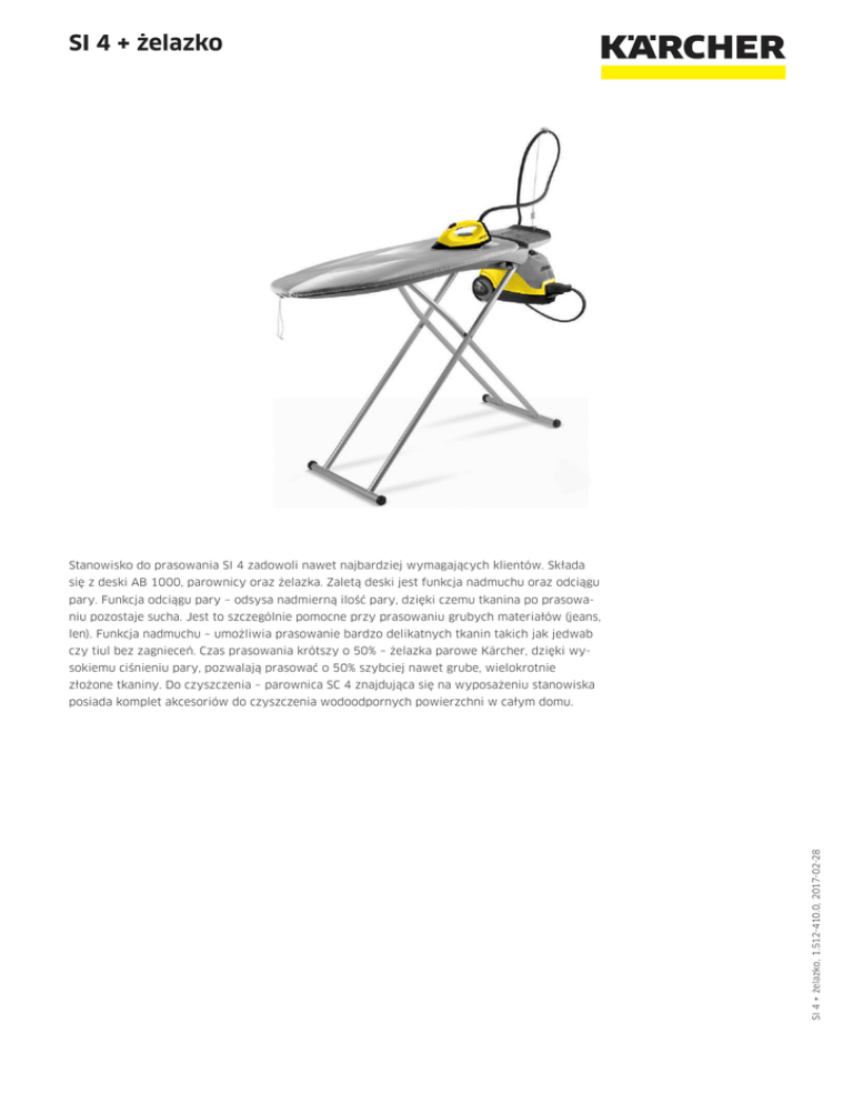SI 4 + żelazko Stanowisko do prasowania SI 4 zadowoli nawet najbardziej wymagających klientów. Składa się z deski AB 1000, parownicy oraz żelazka. Zaletą deski jest funkcja nadmuchu oraz odciągu pary. Funkcja odciągu pary – odsysa nadmierną ilość pary, dzięki czemu tkanina po prasowaniu pozostaje sucha. Jest to szczególnie pomocne przy prasowaniu grubych materiałów (jeans, len). Funkcja nadmuchu – umożliwia prasowanie bardzo delikatnych tkanin takich jak jedwab czy tiul bez zagnieceń. Czas prasowania krótszy o 50% – żelazka parowe Kärcher, dzięki wysokiemu ciśnieniu pary, pozwalają prasować o 50% szybciej nawet grube, wielokrotnie złożone tkaniny. Do czyszczenia – parownica SC 4 znajdująca się na wyposażeniu stanowiska SI 4 + żelazko, 1.512-410.0, 2017-02-28 posiada komplet akcesoriów do czyszczenia wodoodpornych powierzchni w całym domu. SI 4 + żelazko Dane techniczne 1.512-410.0 Numer katalogowy 4054278041117 Wydajność powierzchniowa m² 100 Napięcie V 220–240 Częstotliwość Hz 50–60 Moc grzałki W 2000 Maks. ciśnienie pary bar 3,5 Czas podgrzewania min. 4 Bojler l 0,5 + 0,8 / Dodatkowy zbiornik Ciężar bez wyposażenia kg 12,6 Wyposażenie standardowe Bezpieczna blokada / Zawór bezpieczeństwa Regulacja ilości pary Wbudowany lejek do napełniania System dwóch zbiorników Zestaw do czyszczenia podłóg Comfort Plus + Rury ssące 2 x 0,5 m Wyposażenie Dysza ręczna, dysza do detali, okrągła szczotka Żelazko parowe I 6006 + deska do prasowania AB 1000 Ściereczka podłogowa z mikrofibry szt. 1 Ściereczka frotte do dyszy ręcznej szt. 1 Objęte dostawą. SI 4 + żelazko, 1.512-410.0, 2017-02-28 Odkamieniacz w pałeczkach Na rękojeści Akcesoria dla SI 4 + żelazko 1.512-410.0 1 2 3 4 5 6 7 8 9 10 11 13 15 16 Numer katalogowy Cena Opis Akcesoria do prasowania Żelazko parowe I 6006 do parownic AB 1000 - deska do prasowania 1 2.863-208.0 Powłoka na deskę do prasowania 3 2.884-969.0 Stopa do żelazka parowego I 6006 2 2.884-933.0 4 2.860-142.0 Wysokiej jakości żelazko parowe z łatwo przesuwającą się stopą ze stali nierdzewnej w kolorze żółto-czarnym. Deska do prasowania z funkcją nadmuchu, odsysania pary i 6 stopniową regulacją wysokości. Bawełniana powłoka na deskę do prasowania z piankową podszewką gwarantuje gładką powierzchnię do prasowania i lepsze przenikanie pary. Zapewnia doskonałe rezultaty prasowania. Nieprzywierająca stopa do żelazka I 6006. Przeznaczona do prasowania delikatnych tkanin np. jedwab, len, czarna odzież, koronkowa bielizna lub koszulki z nadrukiem. Dysze Zestaw do czyszczenia podłóg "Comfort Plus" Dysza ręczna 5 2.863-019.0 Dysza do czyszczenia okien 7 2.863-025.0 Dysza do pielęgnacji tekstyliów für SC Dysza podłogowa Comfort Mini 8 2.863-233.0 Dysza power Dysza do pielęgnacji tekstyliów Gumowa listwa do dyszy do okien 6 2.884-280.0 9 2.863-244.0 10 2.884-282.0 11 4.130-390.0 12 6.273-140.0 W zestawie dysza podłogowa Comfort Plus i ściereczka do dyszy podłogowej wykonana z mikrofibry. Dysza ręczna ze szczeciną do czyszczenia niewielkich powierzchni np. kabiny prysznicowe, płytki ścienne itp. Przez- naczona do pracy z lub bez powłoczki z mikrofibry. Dysza do okien dokładnie czyści szkło, okna oraz lustra przy użyciu parownicy. Dzięki swoim kompaktowym wymiarom dysza podłogowa "Comfort Mini" dociera do trudno dostępnych miejsc. Dysza Power z przedłużką znacznie zwiększa siłę czyszczenia dyszy do detali. Doskonała do łatwego, ekologicznego czyszczenia trudnodostępnych miejsc np. rogów. Dysza do pielęgnacji tekstyliów odświeża i usuwa zagięcia ubrań i tekstyliów, efektywnie usuwając nieprzyjemne zapachy. Posiada warstwę usuwającą meszek. Gumowa listwa do dyszy do okien dla parownic. Zestawy ściereczek 13 2.863-243.0 Ściereczki podłogowe z mikrofibry do dyszy podłogowej Comfort Plus 14 2.863-020.0 Zestaw powłoczek z mikrofibry 15 2.863-174.0 Powłoczki frotte 5 sztuk 16 6.370-990.0 Zestaw składa się z: 2 miękkich powłoczek z mikrofibry na dużą szczotkę okrągłą. Do czyszczenia silnie zabrudzonych powierzchni w kuchni i w łazience. Zestaw składa się z 2 miękkich ściereczek podłogowych, o dużej chłonności, wykonanych z najwyższej jakości mikrofibry. Ściereczki pasują do nowej dyszy podłogowej Comfort Plus. Zestaw składa się z dwóch miękkich powłoczek z mikrofibry na dyszę ręczną przeznaczonych do czyszczenia silnie zabrudzonych powierzchni w kuchni i w łazience. Zestaw pięciu wysoce chłonnych powłoczek na dyszę ręczną z wysokiej jakości bawełny. Zestawy szczotek Zestaw okrągłych szczotek 17 2.863-058.0 Zestaw szczotek z mosiężną szczeciną 18 2.863-061.0 Okrągła szczotka – duża 19 2.863-022.0 Objęte dostawą. Dostępne akcesoria. Praktyczny zestaw okrągłych szczotek dostępny w dwóch kolorach Zestaw szczotek okrągłych z mosiężną szczeciną do usuwania uporczywych, zaschniętych zabrudzeń. Doskonałe do niewrażliwych powierzchni. Dzięki dużej, okrągłej szczotce wyczyścisz większą powierzchnię w krótszym czasie. SI 4 + żelazko, 1.512-410.0, 2017-02-28 Miękkie powłoczki z mikrofibry na dużą szczotkę okrągłą Akcesoria dla SI 4 + żelazko 1.512-410.0 20 21 22 Numer katalogowy Szczotka okrągła ze skrobakiem 20 2.863-140.0 Parowa szczotka Turbo 21 2.863-159.0 23 Cena Opis Szczotka okrągła z dwoma rzędami odpornej na wysokie temperatury szczeciny oraz skrobakiem do łatwego usuwa nia uporczywych zabrudzeń. Nie nadaje się do czyszczenia powierzchni wrażliwych. Parowa szczotka Turbo ogranicza czas czyszczenia o połowę. Dzięki jej silnemu działaniu nie ma potrzeby szoro- wania. Umożliwia oszczędność czasu. Inne akcesoria Dysza do usuwania tapet 22 2.863-062.0 Zestaw O-ringów 23 2.884-312.0 Zdzieracz do tapet doskonale usuwa tapety oraz pozostałości kleju wykorzystując działanie pary. Zamienny zestaw O-ringów do wyposażenia parownic. SI 4 + żelazk