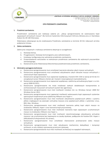 OPIS PRZEDMIOTU ZAMÓWIENIA 1. Przedmiot zamówienia: Przedmiotem zamówienia jest realizacja zadania pn. „Zakup oprogramowania do wykonywania kopii zapasowych wirtualnych maszyn” dla Centrum Systemów Informacyjnych Ochrony Zdrowia przy ul. Stanisława Dubois 5A, 00-184 Warszawa. Wykonawca zobowiązuje się do zrealizowania Przedmiotu zamówienia w terminie 30 Dni roboczych od dnia podpisania Umowy. 2. Zakres zamówienia: Zakres prac związanych z realizacja zamówienia obejmuje w szczególności: a. b. c. d. e. 3. Dostawę licencji, Przygotowanie i dostawę harmonogramu prac wdrożeniowych, Instalację, konfigurację oraz wdrożenie przedmiotu zamówienia, Przeprowadzenie warsztatów na wdrożonym przedmiocie zamówienia dla wybranych pracowników Zamawiającego, Dostarczenie przez Wykonawcę Dokumentacji powdrożeniowej przedmiotu zamówienia, Minimalne wymagania techniczne: a. Dostarczone oprogramowanie musi umożliwiać tworzenie obrazów całych maszyn wirtualnych, b. Dostarczone oprogramowanie musi umożliwiać odzyskiwanie całych obrazów maszyn wirtualnych z utworzonych kopii zapasowych, c. Dostarczone oprogramowanie musi zapewniać współpracę z hostami ESX i ESXi w wersji od 4.0 do 5.5 zarządzanymi przez VMware vCenter jak i hostami niezarządzanymi (samodzielnymi), d. Dostarczone oprogramowanie musi zapewniać współpracę z platformą wirtualizacyjną Hyper-v w min. wersji 2008 R2/2012, e. Dostarczone oprogramowanie nie może instalować żadnych dodatkowych komponentów w archiwizowanych maszynach wirtualnych (system bez agentowy), f. Dostarczone oprogramowanie musi mieć możliwość instalacji min na: Windows Serwer 2008 R2/ Windows Server 2012. g. Dostarczone oprogramowanie musi zapewniać możliwość wykonywania kopii zapasowych systemów operacyjnych wspieranych przez platformę VMware oraz Hyper-v. h. Dostarczone oprogramowanie musi mieć możliwość odzyskiwania pojedynczych plików z systemu plików znajdujących się wewnątrz wirtualnej maszyny oraz pojedynczych plików z systemów: Linux, BSD, Mac, Windows. i. Dostarczone oprogramowanie musi mieć możliwość tworzenia pełnej kopii całych maszyn na środowisku VMware, Hyper-v oraz tworzenia kopii przyrostowej, j. Dostarczone oprogramowanie musi mieć możliwość tworzenia kopii zapasowych uruchomionych maszyn na środowisku VMware oraz Hyper-v, k. Dostarczone oprogramowanie musi mieć możliwość natychmiastowego odzyskiwania wirtualnej maszyny i jej uruchomienie bez kopiowania na zasoby dyskowe, podłączone do hostów ESX i Hyper-v (Wbudowana funkcjonalność nfs serwer), l. Dostarczone oprogramowanie musi umożliwiać równoczesne przetwarzanie wielu maszyn wirtualnych, m. Dostarczone oprogramowanie musi mieć wbudowane mechanizmy deduplikacji i kompresji archiwum, w celu redukcji zajmowanej przestrzeni dyskowej, n. Dostarczone oprogramowanie musi mieć możliwość archiwizacji na napędach taśmowych, o. Dostarczone oprogramowanie musi mieć możliwość sprawdzenia poprawności wykonania kopi zapasowej, poprzez odtworzenie wirtualnej maszyny w izolowanym środowisku i jej uruchomienie w środowisku VMware/Hyper-v, p. Dostarczone oprogramowanie musi mieć możliwość automatycznej zmiany numeracji IP maszyn przywracanych w środowiskach, q. Dostarczone oprogramowanie musi umożliwiać zapisanie konfiguracji całej instalacji w celu przywrócenia jej po reinstalacji całego systemu, r. Dostarczone oprogramowanie musi mieć możliwość odzyskiwania obiektów Active Directory na poziomie użytkowników, grup, komputerów oraz kontenerów bezpośrednio z pliku utworzonej kopii zapasowej, s. Dostarczone oprogramowanie musi mieć możliwość bez agentowego tworzenia kopii zapasowych baz danych Microsoft SQL, t. Dostarczone oprogramowanie musi mieć możliwość odzyskiwania obiektów z systemu MS Sharepoint 2010/2013 bezpośrednio z pliku utworzonej kopii zapasowej bez potrzeby jej uruchamiania, u. Dostarczone oprogramowanie musi zapewniać przywracanie elementów programu MS Exchange 2013 bezpośrednio z pliku utworzonej kopii zapasowej bez potrzeby jej uruchamiania. v. Dostarczone oprogramowanie musi zapewniać przeglądanie skrzynek pocztowych zawartych w kopiach zapasowych zasobów serwera pocztowego oraz możliwość przywracania poszczególnych elementów z kopii zapasowej do skrzynki pocztowej konkretnego użytkownika, w. Dostarczone oprogramowanie musi posiadać funkcjonalność automatycznego sprawdzania poprawności wykonanych kopii zapasowych, x. Dostarczone oprogramowanie musi posiadać centralną konsolę umożliwiająca podgląd dla podłączonych wszystkich elementów infrastruktury wirtualnej (VMware, Hyper-v), oraz możliwość wykonywania oraz weryfikowania poprawności wykonywanych kopii zapasowych z jednego miejsca, y. Dostarczone oprogramowanie musi posiadać moduł raportowania. 4. Wymagania dotyczące warsztatów: a. Wykonawca musi przygotować i przeprowadzić minimum 2 dniowe warsztaty w wymiarze minimum 8 godzin dla 4 pracowników wyznaczonych przez Zamawiającego, b. Wykonawca przeprowadzi warsztaty w siedzibie Zamawiającego w terminie do 30 Dni roboczych od dnia podpisania Umowy, c. Wykonawca przygotuje materiały szkoleniowe w formie elektronicznej w języku polskim, zawierające co najmniej szczegółowo opisane wszystkie etapy warsztatów i wykonywane w trakcie jego trwania czynności i zadania. d. Zakres warsztatów będzie obejmował min.: i. instalację i konfigurację dostarczonego oprogramowania, ii. wykonywanie oraz odtwarzanie pełnych kopii zapasowych, wykonywanie inkrementacyjnych kopii zapasowych, iii. odzyskiwanie wirtualnych maszyn, pojedynczych plików systemu Linux/Windows, obiektów baz danych, Active Directory oraz MS Exchange, iv. odtwarzanie środowiska wirtualnego, v. monitorowanie poprawności wykonywanych kopii zapasowych, 5. Wymagania licencyjne : a. Zamawiający wymaga dostarczenia licencji na 80 procesorów. b. Zamawiający wymaga, aby dost