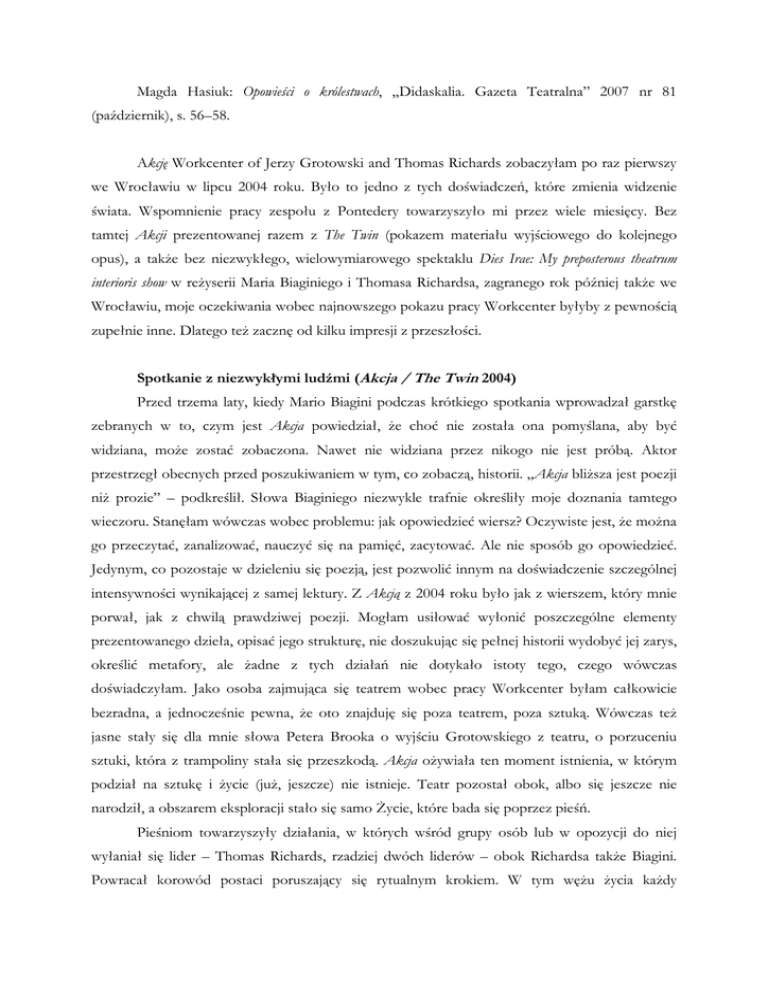 Magda Hasiuk: Opowieści o królestwach, „Didaskalia. Gazeta Teatralna” 2007 nr 81 (październik), s. 56–58. Akcję Workcenter of Jerzy Grotowski and Thomas Richards zobaczyłam po raz pierwszy we Wrocławiu w lipcu 2004 roku. Było to jedno z tych doświadczeń, które zmienia widzenie świata. Wspomnienie pracy zespołu z Pontedery towarzyszyło mi przez wiele miesięcy. Bez tamtej Akcji prezentowanej razem z The Twin (pokazem materiału wyjściowego do kolejnego opus), a takŜe bez niezwykłego, wielowymiarowego spektaklu Dies Irae: My preposterous theatrum interioris show w reŜyserii Maria Biaginiego i Thomasa Richardsa, zagranego rok później takŜe we Wrocławiu, moje oczekiwania wobec najnowszego pokazu pracy Workcenter byłyby z pewnością zupełnie inne. Dlatego teŜ zacznę od kilku impresji z przeszłości. Spotkanie z niezwykłymi ludźmi (Akcja / The Twin 2004) Przed trzema laty, kiedy Mario Biagini podczas krótkiego spotkania wprowadzał garstkę zebranych w to, czym jest Akcja powiedział, Ŝe choć nie została ona pomyślana, aby być widziana, moŜe zostać zobaczona. Nawet nie widziana przez nikogo nie jest próbą. Aktor przestrzegł obecnych przed poszukiwaniem w tym, co zobaczą, historii. „Akcja bliŜsza jest poezji niŜ prozie” – podkreślił. Słowa Biaginiego niezwykle trafnie określiły moje doznania tamtego wieczoru. Stanęłam wówczas wobec problemu: jak opowiedzieć wiersz? Oczywiste jest, Ŝe moŜna go przeczytać, zanalizować, nauczyć się na pamięć, zacytować. Ale nie sposób go opowiedzieć. Jedynym, co pozostaje w dzieleniu się poezją, jest pozwolić innym na doświadczenie szczególnej intensywności wynikającej z samej lektury. Z Akcją z 2004 roku było jak z wierszem, który mnie porwał, jak z chwilą prawdziwej poezji. Mogłam usiłować wyłonić poszczególne elementy prezentowanego dzieła, opisać jego strukturę, nie doszukując się pełnej historii wydobyć jej zarys, określić metafory, ale Ŝadne z tych działań nie dotykało istoty tego, czego wówczas doświadczyłam. Jako osoba zajmująca się teatrem wobec pracy Workcenter byłam całkowicie bezradna, a jednocześnie pewna, Ŝe oto znajduję się poza teatrem, poza sztuką. Wówczas teŜ jasne stały się dla mnie słowa Petera Brooka o wyjściu Grotowskiego z teatru, o porzuceniu sztuki, która z trampoliny stała się przeszkodą. Akcja oŜywiała ten moment istnienia, w którym podział na sztukę i Ŝycie (juŜ, jeszcze) nie istnieje. Teatr pozostał obok, albo się jeszcze nie narodził, a obszarem eksploracji stało się samo śycie, które bada się poprzez pieśń. Pieśniom towarzyszyły działania, w których wśród grupy osób lub w opozycji do niej wyłaniał się lider – Thomas Richards, rzadziej dwóch liderów – obok Richardsa takŜe Biagini. Powracał korowód postaci poruszający się rytualnym krokiem. W tym węŜu Ŝycia kaŜdy działający (człowiek) był ogniwem łańcucha, kaŜdy inny, a wszyscy razem podobni poprzez kostium i zanurzeni w identycznym rytmie. Szczególnie wyraźnie pamiętam sekwencje pracy Richardsa, kiedy to jako czyniący przechodził przez kolejne stadia ludzkiego Ŝycia. Nie grał niemowlęcia, ale nim się stawał, odnajdował je w sobie. Kolejno docierał do najwaŜniejszych, fundamentalnych stanów ludzkiej kondycji, pozostawał w nieustannym, Ŝywym dialogu ze sobądzieckiem, sobą-starcem, sobą Ŝywym i ze sobą umarłym. Miałam bardzo silne przeczucie, Ŝe w tych szczególnych momentach Richards ucieleśniał słowa przywołane w Performerze przez Jerzego Grotowskiego „Jest nas dwóch. Ptak, który dziobie i ptak, który patrzy”1. Przez cały czas trwania Akcji zadziwiała mnie i urzekała czystość i subtelność dźwięków emitowanych przez działających. Przypominały one głosy wydobywane przez dzieci niepotrafiące jeszcze mówić; dźwięki tak naturalne i ponadosobowe jak wiatr czy oddech, w których treść i forma jeszcze na dobre się nie rozdzieliły. Precyzja i przeźroczystość struktury, a takŜe jakość działań fizycznych i wokalnych liderów sprawiały, Ŝe ich śpiew stawał się ciałem, a ciało śpiewem. Brak blokad w ciele, w ruchu, w śpiewie powodował drŜenie oglądających. O pracy Richardsa i Biaginiego myślałam wówczas w podobny sposób, w jaki Janusz Misiewicz pisał o bohaterach homeryckich: duszą herosa rządzą nadnaturalne boskie moce, jego czyny stanowią proste następstwo owych władających bohaterem afektów. Heros całkowicie spełnia się w działaniu. Proste ujednolicenie natury osoby z istotą działania czyni z bohatera działacza doskonałego2. Kiedy widziałam w działaniu Richardsa i Biaginiego, gdy byłam w przestrzeni ich śpiewu, pytanie Grotowskiego – „Czy jesteś człowiekiem?” – nie tylko samo niejako się stawiało, ale opus udzielało wyjaśnień, co to znaczy. Co to moŜe znaczyć w doświadczeniu, w przykładzie. W Akcji prezentowanej w 2004 roku juŜ nie było aktorów, a nawet poniekąd nie było działających. Istniało za to działanie tak silne, a jednocześnie tak subtelne, Ŝe wewnętrznie olśniewało. Wprowadzało tych, którzy działali, ale i tych, którzy nie działali, w dziedzinę anonimowości w sensie średniowiecznym. Akcja nie była dokonaniem czegoś w dziedzinie sztuki, ale w dziedzinie Ŝycia, doświadczenia ludzkiego. Odsłaniała zapomniane moŜliwości obcowania ze światem, osadzała w całkowitym i totalnym doświadczeniu rzeczywistości, w ostateczności kaŜdego gestu, ruchu, spojrzenia, oddechu, w zachwycie i poruszeniu wobec samego istnienia. Przedstawić nieprzedstawialne (Dies Irae... 2005) W przypadku przedstawienia Dies Irae... moje doświadczenia, co oczywiste, były zupełnie inne. Ale ponownie praca Workcenter mnie porwała i otworzyła nowe, nieoczekiwane 1 2 Por. J. Grotowski, Performer, [w:] idem, Teksty z lat 1965-1969, Wiedza o Kulturze, Wrocław 1999, s. 216. Por. J. Misiewicz, Is