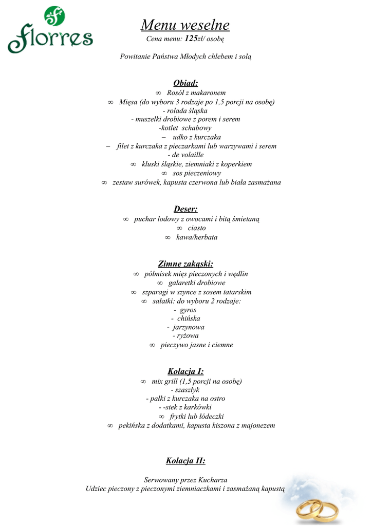 Menu weselne Cena menu: 125zł/ osobę Powitanie Państwa Młodych chlebem i solą Obiad: • Rosół z makaronem Mięsa (do wyboru 3 rodzaje po 1,5 porcji na osobę) - rolada śląska - muszelki drobiowe z porem i serem -kotlet schabowy − udko z kurczaka − filet z kurczaka z pieczarkami lub warzywami i serem - de volaille • kluski śląskie, ziemniaki z koperkiem • sos pieczeniowy • zestaw surówek, kapusta czerwona lub biała zasmażana • • Deser: puchar lodowy z owocami i bitą śmietaną • ciasto • kawa/herbata Zimne zakąski: • półmisek mięs pieczonych i wędlin • galaretki drobiowe • szparagi w szynce z sosem tatarskim • sałatki: do wyboru 2 rodzaje: - gyros - chińska - jarzynowa - ryżowa • pieczywo jasne i ciemne • • Kolacja I: mix grill (1,5 porcji na osobę) - szaszłyk - pałki z kurczaka na ostro - -stek z karkówki • frytki lub łódeczki pekińska z dodatkami, kapusta kiszona z majonezem Kolacja II: Serwowany przez Kucharza Udziec pieczony z pieczonymi ziemniaczkami i zasmażaną kapustą Kolacja III: do wyboru : barszcz z krokietem • bogracz • flaki • bigos • Soki, woda, napoje gazowane- według zużycia Poprawiny: Cena 30zł/osobę Obiad: Żurek z jajkiem i kiełbasą lub rosół Mięsa z poprzedniego dnia Ziemniaki, kluski śląskie Zestaw surówek Zimna płyta: Reszta dań z poprzedniego dnia W cenę menu wliczono dodatkowo: • • • Dekoracje stołów według ustalonego wariantu Bukiet przed Parą Młodą w ustalonej kolorystyce Chleb weselny na powitanie Pary Młodej Dodatkowo oferujemy: • Stół Wiejski- 9zł/os. • Soki owocowe, woda mineralna oraz napoje gazowane bez ograniczeń- 15zł/os. • tort weselny- 6zł/osobę • Fontanna czekoladowa- 700zł/ dzień, dodatki 4zł/osobę • Pokrowce na krzesła- 3zł/ osobę • Piwo lane Okocim (beczka 30l)- 250zł Przyjęcie weselne bez limitu czasowego, poprawiny w godzinach 13:00-18:00, następne godziny dodatkowo płatne. Na Państwa życzenie istnieje możliwość skomponowania i skalkulowania Menu według własnego pomysłu (po konsultacji z Szefem Kuchni).