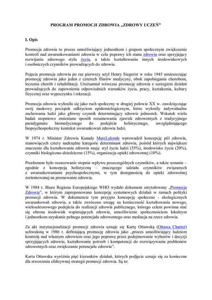 PROGRAM PROMOCJI ZDROWIA „ZDROWY UCZEŃ” I. Opis Promocja zdrowia to proces umożliwiający jednostkom i grupom społecznym zwiększenie kontroli nad uwarunkowaniami zdrowia w celu poprawy ich stanu zdrowia oraz sprzyjający rozwijaniu zdrowego stylu życia, a także kształtowaniu innych środowiskowych i osobniczych czynników prowadzących do zdrowia. Pojęcia promocja zdrowia po raz pierwszy użył Henry Siegerist w roku 1945 umieszczając promocję zdrowia jako jeden z czterech filarów medycyny, obok zapobiegania chorobom, leczenia chorób i rehabilitacji. Utożsamiał wówczas promocję zdrowia z szeregiem działań prowadzących do zapewnienia odpowiednich warunków życia, pracy, kształcenia, kultury fizycznej oraz wypoczynku i rekreacji. Promocja zdrowia wyłoniła się jako ruch społeczny w drugiej połowie XX w. zawdzięczając swój naukowy początek odkryciom epidemiologicznym, które wyłoniły indywidualne zachowania ludzi jako główny czynnik determinujący zdrowie jednostek. Wskutek wielu badań stopniowo zmieniano sposób rozumowania zjawisk zdrowotnych z tradycyjnego paradygmatu biomedycznego do podejścia holistycznego, uwzględniającego biopsychospołeczny kontekst uwarunkowań zdrowia ludzi. W 1974 r. Minister Zdrowia Kanady MarcLalonde wprowadził koncepcję pól zdrowia, stanowiących cztery nadrzędne kategorie determinant zdrowia, pośród których największe znaczenie dla kształtowania zdrowia mają: styl życia ludzi (55%), środowisko życia (20%), czynniki biologiczno-dziedziczne (15%), organizacja opieki zdrowotnej (10%). Przełomem było oszacowanie stopnia wpływu poszczególnych czynników, a także uznanie – zgodnie z koncepcją holistyczną – znaczącego udziału czynników związanych z uwarunkowaniami psychospołecznymi, w tym dostępnością do opieki zdrowotnej zorientowanej na promowanie zdrowia. W 1984 r. Biuro Regionu Europejskiego WHO wydało dokument zatytułowany „Promocja Zdrowia”, w którym zaproponowano koncepcję systemowych działań w ramach polityki promocji zdrowia. W dokumencie tym przyjęto koncepcję społeczno - ekologicznych uwarunkowań zdrowia, a także zwrócono uwagę na konieczność kształtowania nowego, wielosektorowego podejścia do realizacji zdrowia publicznego, którego celem powinna stać się obrona środowisk wspierających zdrowie, umożliwienie społecznościom lokalnym i jednostkom uzyskanie pełnego potencjału zdrowotnego oraz mediacja na rzecz zdrowia. Za akt instytucjonalizacji promocji zdrowia uznaje się Kartę Ottawską (Ottawa Charter) uchwaloną w 1986 r. definiującą promocję zdrowia jako „proces umożliwiający ludziom kontrolę nad własnym zdrowiem oraz jego poprawę przez podejmowanie wyborów i decyzji sprzyjających zdrowiu, kształtowanie potrzeb i kompetencji do rozwiązywania problemów zdrowotnych oraz zwiększanie potencjału zdrowia”. Karta Ottawska wyróżnia pięć kierunków działań, których podjęcie uznaje się za konieczne dla stworzenia efektywnej strategii promocji zdrowia. Są to: 1. określenie zdrowotnej polityki społecznej w państwie (m.in. poprzez ustalenie i sukcesywną realizację programów prozdrowotnej polityki społecznej, przy zapewnieniu realnych źródeł finansowania); 2. tworzenie środowisk wspierających zdrowie (osiągane poprzez rozwijanie wiedzy i umiejętności działań na rzecz zdrowia, angażowanie członków społeczeństwa poprzez sieć struktur społeczności lokalnych do aktywnego uczestnictwa w sprawach dotyczących zdrowia); 3. wzmacnianie działań społecznych; 4. rozwijanie umiejętności osobniczych; 5. reorientacja świadczeń zdrowotnych (odejście od modelów ekonomiki szpitalnej w kierunku holistycznego ujmowania korzyści zdrowotnych, ekonomicznych i rozwojowych całego kraju). Ponadto, ustawa o działalności leczniczej z dnia 15 kwietnia 2011 r. określa promocję zdrowia jako działania umożliwiające poszczególnym osobom i społeczności, zwiększenie kontroli nad czynnikami warunkującymi stan zdrowia i przez to jego poprawę, promowanie zdrowego stylu życia oraz środowiskowych i indywidualnych czynników sprzyjających zdrowiu[1]. Promowanie zdrowia powinno dotyczyć całej populacji, niezależnie od wieku i obecnego stanu zdrowia. Należy wskazać, że edukacja zdrowotna jest kluczowym narzędziem promocji zdrowia. Odnoszenie sukcesów w procesie promowania zdrowia zależy od aktywnego zaangażowania w ten proces ludności, wyposażonej we właściwą wiedzę i umiejętności. Tak rozumiana edukacja zdrowotna dąży do poprawy i ochrony zdrowia poprzez stymulowanie procesu uczenia, doprowadzając do zmian w zachowaniu jednostek. Działania z zakresu edukacji zdrowotnej obejmują podnoszenie poziomu wiedzy o zdrowiu, poradnictwo z zakresu zagrożeń zdrowia, budowanie wysokiej samooceny, samodzielności oraz kształtowanie odpowiedzialności za własne zdrowie. Edukacja zdrowotna traktowana jest nie tyle jako sposób do uzyskania zmiany jednostkowych zachowań, znanych jako czynniki ryzyka, ile jako środek możliwy do wykorzystania w celu uruchomienia wszystkich dostępnych sił społecznych na rzecz bardzo szeroko pojmowanej zmiany służącej zdrowiu, w tym zmiany warunków środowiskowych. Edukacja zdrowotna jest najtańszym skutecznym działaniem służącym poprawie stanu zdrowia. Zdrowie według definicji Światowej Organizacji Zdrowia to nie tylko całkowity brak choroby, czy kalectwa, ale także stan pełnego, fizycznego, umysłowego i społecznego dobrostanu (dobrego samopoczucia). Definicja ta jest bardzo ważna i postępowa, ponieważ nie poprzestaje na samym negującym ujęciu, że zdrowie jest brakiem choroby, ale bardzo mocno akcentuje, że zdrowie ma w sobie aktywny aspekt, którym jest dobrostan. Oznacza to, że w kwestiach zdrowia nie mamy jedynie koncentrować się na chorobach i próbach ich zwalczania, ale powinniśmy zwłaszcza koncentrować się na samym zdrowiu – na jego wzmocni