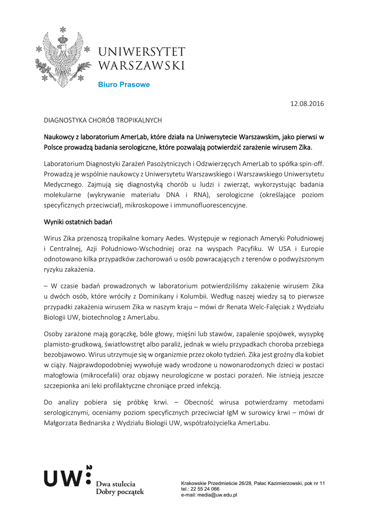 Biuro Prasowe 12.08.2016 DIAGNOSTYKA CHORÓB TROPIKALNYCH Naukowcy z laboratorium AmerLab, które działa na Uniwersytecie Warszawskim, jako pierwsi w Polsce prowadzą badania serologiczne, które pozwalają potwierdzić zarażenie wirusem Zika. Laboratorium Diagnostyki Zarażeń Pasożytniczych i Odzwierzęcych AmerLab to spółka spin-off. Prowadzą je wspólnie naukowcy z Uniwersytetu Warszawskiego i Warszawskiego Uniwersytetu Medycznego. Zajmują się diagnostyką chorób u ludzi i zwierząt, wykorzystując badania molekularne (wykrywanie materiału DNA i RNA), serologiczne (określające poziom specyficznych przeciwciał), mikroskopowe i immunofluorescencyjne. Wyniki ostatnich badań Wirus Zika przenoszą tropikalne komary Aedes. Występuje w regionach Ameryki Południowej i Centralnej, Azji Południowo-Wschodniej oraz na wyspach Pacyfiku. W USA i Europie odnotowano kilka przypadków zachorowań u osób powracających z terenów o podwyższonym ryzyku zakażenia. – W czasie badań prowadzonych w laboratorium potwierdziliśmy zakażenie wirusem Zika u dwóch osób, które wróciły z Dominikany i Kolumbii. Według naszej wiedzy są to pierwsze przypadki zakażenia wirusem Zika w naszym kraju – mówi dr Renata Welc-Falęciak z Wydziału Biologii UW, biotechnolog z AmerLabu. Osoby zarażone mają gorączkę, bóle głowy, mięśni lub stawów, zapalenie spojówek, wysypkę plamisto-grudkową, światłowstręt albo paraliż, jednak w wielu przypadkach choroba przebiega bezobjawowo. Wirus utrzymuje się w organizmie przez około tydzień. Zika jest groźny dla kobiet w ciąży. Najprawdopodobniej wywołuje wady wrodzone u nowonarodzonych dzieci w postaci małogłowia (mikrocefalii) oraz objawy neurologiczne w postaci porażeń. Nie istnieją jeszcze szczepionka ani leki profilaktyczne chroniące przed infekcją. Do analizy pobiera się próbkę krwi. – Obecność wirusa potwierdzamy metodami serologicznymi, oceniamy poziom specyficznych przeciwciał IgM w surowicy krwi – mówi dr Małgorzata Bednarska z Wydziału Biologii UW, współzałożycielka AmerLabu. Krakowskie Przedmieście 26/28, Pałac Kazimierzowski, pok nr 11 tel.: 22 55 24 066 e-mail: [email protected] Nowe testy molekularne Osoby powracające z podróży do egzotycznych państw będą mogły przebadać się w AmerLabie na obecność również innych wirusów. – W ciągu miesiąca będziemy mieć w ofercie badania molekularne w kierunku trzech wirusów wywołujących podobne objawy: Chikungunya, Denga; oraz w kierunku leiszmaniozy przenoszonej przez muchówki z Basenu Morza Śródziemnego oraz strefy tropikalnej – zapowiada dr Małgorzata Bednarska. Pełna lista testów dostępnych w AmerLabie znajduje się na stronie laboratorium: http://www.amerlab.pl/ AmerLab jest spółką spin-off, czyli firmą utworzoną przez badaczy z Uniwersytetu Warszawskiego i Warszawskiego Uniwersytetu Medycznego, którego udziałowcami są zarówno naukowcy, jak i obie uczelnie. Do tej pory na UW powstało siedem spółek typu spin-off. Merytoryczną stroną ich powstawania i komercjalizacją prowadzonych tam badań zajmuje się Uniwersytecki Ośrodek Transferu Technologii UW oraz spółka celowa Uniwersytetu UWRC sp. z o.o. Krakowskie Przedmieście 26/28, Pałac Kazimierzowski, pok nr 11 tel.: 22 55 24 066 e-mail: [email protected]
